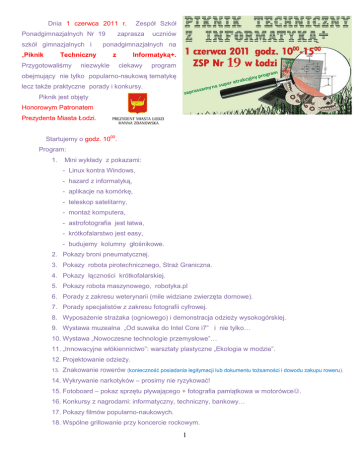 Zespół Szkół Dnia 1 czerwca 2011 r. zaprasza Ponadgimnazjalnych Nr 19 szkół gimnazjalnych i „Piknik ponadgimnazjalnych na Techniczny Przygotowaliśmy uczniów z niezwykle Informatyką+. ciekawy program obejmujący nie tylko popularno-naukową tematykę lecz także praktyczne porady i konkursy. Piknik jest objęty Honorowym Patronatem Prezydenta Miasta Łodzi. Startujemy o godz. 1000. Program: 1. Mini wykłady z pokazami: - Linux kontra Windows, - hazard z informatyką, - aplikacje na komórkę, - teleskop satelitarny, - montaż komputera, - astrofotografia jest łatwa, - krótkofalarstwo jest easy, - budujemy kolumny głośnikowe. 2. Pokazy broni pneumatycznej. 3. Pokazy robota pirotechnicznego, Straż Graniczna. 4. Pokazy łączności krótkofalarskiej. 5. Pokazy robota maszynowego, robotyka.pl 6. Porady z zakresu weterynarii (mile widziane zwierzęta domowe). 7. Porady specjalistów z zakresu fotografii cyfrowej. 8. Wyposażenie strażaka (ogniowego) i demonstracja odzieży wysokogórskiej. 9. Wystawa muzealna „Od suwaka do Intel Core i7” i nie tylko… 10. Wystawa „Nowoczesne technologie przemysłowe”… 11. „Innowacyjne włókiennictwo”: warsztaty plastyczne „Ekologia w modzie”. 12. Projektowanie odzieży. 13. Znakowanie rowerów (konieczność posiadania legitymacji lub dokumentu tożsamości i dowodu zakupu roweru). 14. Wykrywanie narkotyków – prosimy nie ryzykować! 15. Fotoboard – pokaz sprzętu pływającego + fotografia pamiątkowa w motorówce. 16. Konkursy z nagrodami: informatyczny, techniczny, bankowy… 17. Pokazy filmów popularno-naukowych. 18. Wspólne grillowanie przy koncercie rockowym. 1 Warunkiem uczestnictwa dla uczniów jest posiadanie legitymacji szkolnej. Piknik jest wspomagany przez: Biuro Projektu Informatyka+ Społeczną Wyższą Szkołę Przedsiębiorczości i Zarządzania Obserwatorium Astronomiczne w Bukowcu Wydział Matematyki i Informatyki UŁ Wydział Technologii Materiałowych i Wzornictwa Tekstyliów PŁ Instytut Problemów Jądrowych im. A. Sołtana Łódzkie Centrum Doskonalenia Nauczycieli i Kształcenia Praktycznego ASG Pantery Łask PZK Łódź Robotyka.pl Koło Naukowe UŁ Straż Miejską w Łodzi Straż Graniczną, Placówka w Łodzi Centralny Instytut Ochrony Pracy Fiero Pizza Konsalnet Profektus – systemy komputerowe Herkules PC Components Redakcję „Młodego technika” Zespoły muzyczne: - Alegorya akustycznie (Axel & Wiśnia) - Ghost Train - Hide'n'Sick Klub Luka 2