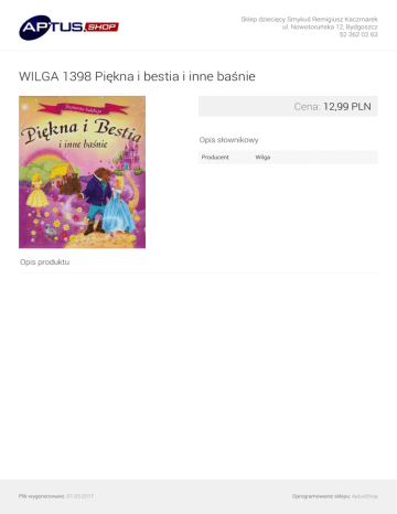 Sklep dziecięcy Smykuś Remigiusz Kaczmarek ul. Nowotoruńska 12, Bydgoszcz 52 362 02 63 WILGA 1398 Piękna i bestia i inne baśnie Cena: 12,99 PLN Opis słownikowy Producent Wilga Opis produktu Plik wygenerowano: 07-03-2017 Powered by TCPDF (www.tcpdf.org) Oprogramowanie sklepu: AptusShop