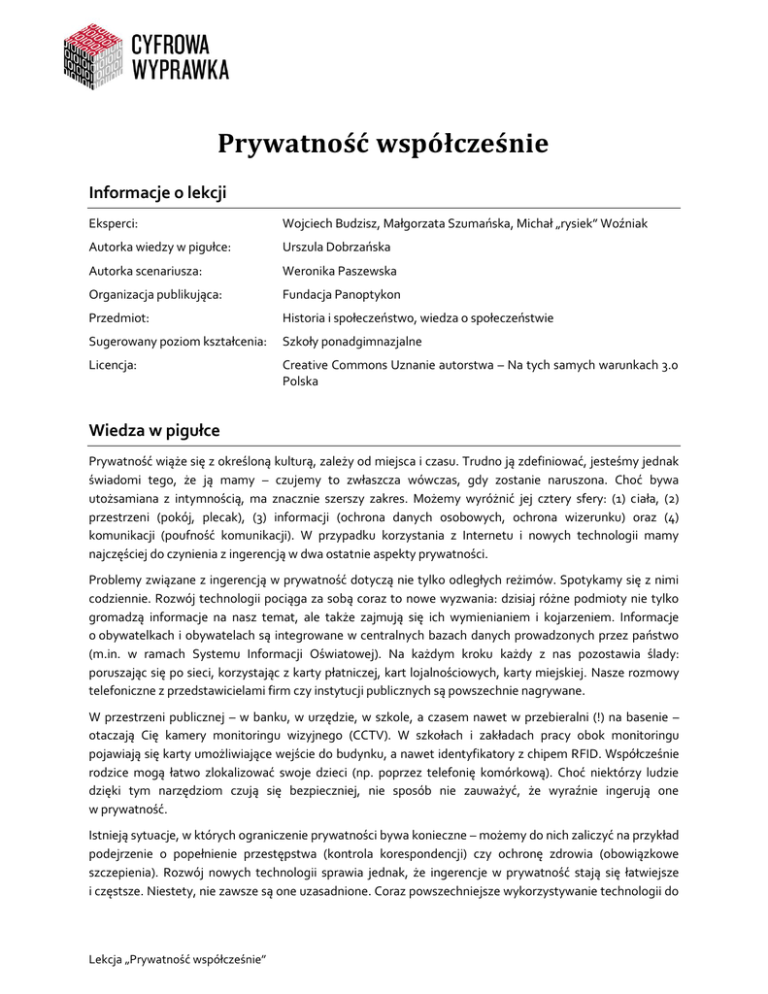 Prywatność współcześnie Informacje o lekcji Eksperci: Wojciech Budzisz, Małgorzata Szumańska, Michał „rysiek” Woźniak Autorka wiedzy w pigułce: Urszula Dobrzańska Autorka scenariusza: Weronika Paszewska Organizacja publikująca: Fundacja Panoptykon Przedmiot: Historia i społeczeństwo, wiedza o społeczeństwie Sugerowany poziom kształcenia: Szkoły ponadgimnazjalne Licencja: Creative Commons Uznanie autorstwa – Na tych samych warunkach 3.0 Polska Wiedza w pigułce Prywatność wiąże się z określoną kulturą, zależy od miejsca i czasu. Trudno ją zdefiniować, jesteśmy jednak świadomi tego, że ją mamy – czujemy to zwłaszcza wówczas, gdy zostanie naruszona. Choć bywa utożsamiana z intymnością, ma znacznie szerszy zakres. Możemy wyróżnić jej cztery sfery: (1) ciała, (2) przestrzeni (pokój, plecak), (3) informacji (ochrona danych osobowych, ochrona wizerunku) oraz (4) komunikacji (poufność komunikacji). W przypadku korzystania z Internetu i nowych technologii mamy najczęściej do czynienia z ingerencją w dwa ostatnie aspekty prywatności. Problemy związane z ingerencją w prywatność dotyczą nie tylko odległych reżimów. Spotykamy się z nimi codziennie. Rozwój technologii pociąga za sobą coraz to nowe wyzwania: dzisiaj różne podmioty nie tylko gromadzą informacje na nasz temat, ale także zajmują się ich wymienianiem i kojarzeniem. Informacje o obywatelkach i obywatelach są integrowane w centralnych bazach danych prowadzonych przez państwo (m.in. w ramach Systemu Informacji Oświatowej). Na każdym kroku każdy z nas pozostawia ślady: poruszając się po sieci, korzystając z karty płatniczej, kart lojalnościowych, karty miejskiej. Nasze rozmowy telefoniczne z przedstawicielami firm czy instytucji publicznych są powszechnie nagrywane. W przestrzeni publicznej – w banku, w urzędzie, w szkole, a czasem nawet w przebieralni (!) na basenie – otaczają Cię kamery monitoringu wizyjnego (CCTV). W szkołach i zakładach pracy obok monitoringu pojawiają się karty umożliwiające wejście do budynku, a nawet identyfikatory z chipem RFID. Współcześnie rodzice mogą łatwo zlokalizować swoje dzieci (np. poprzez telefonię komórkową). Choć niektórzy ludzie dzięki tym narzędziom czują się bezpieczniej, nie sposób nie zauważyć, że wyraźnie ingerują one w prywatność. Istnieją sytuacje, w których ograniczenie prywatności bywa konieczne – możemy do nich zaliczyć na przykład podejrzenie o popełnienie przestępstwa (kontrola korespondencji) czy ochronę zdrowia (obowiązkowe szczepienia). Rozwój nowych technologii sprawia jednak, że ingerencje w prywatność stają się łatwiejsze i częstsze. Niestety, nie zawsze są one uzasadnione. Coraz powszechniejsze wykorzystywanie technologii do Lekcja „Prywatność współcześnie” nadzoru tłumaczone bywa działaniami na rzecz walki z terroryzmem, naszej wygody czy cudzego prawa do informacji. Warto krytycznie patrzeć na te działania i zwracać uwagę, czy rzeczywiście służą one realizacji założonych celów, a nie na przykład zyskowi prywatnych firm czy zdobyciu popularności wśród wyborców. Nowe technologie sprawiają również, że ingerencje w prywatność stają się mniej zauważalne i dokuczliwe. To pewnie dlatego czasami nie dostrzegamy w ich wykorzystaniu niczego niewłaściwego. Zastanów się jednak: czy gdyby zamiast kamery CCTV w autobusie komunikacji miejskiej znajdował się obcy człowiek nagrywający Cię przez cały czas trwania podróży, czuł(a)byś się równie komfortowo? Zapewne nie. W czym zatem tkwi różnica? Prywatność to wartość sama w sobie. Jej naruszenie może oznaczać krzywdę niezależnie od tego, czy wiąże się z realną szkodą, czy też nie, oraz czy zostało dokonane za pośrednictwem nowoczesnych technologii, czy też bez ich wykorzystania. Nie chcemy, by ktoś postronny czytał nasze papierowe listy, e-maile czy SMS-y – nawet wówczas, gdyby miał nikomu nie zdradzić ich treści. Pomysł na lekcję Zajęcia wprowadzają uczestników i uczestniczki w temat prywatności, ze szczególnym uwzględnieniem ingerencji w prywatność za pośrednictwem nowych technologii. Uczestnicy i uczestniczki zastanowią się, w jakich sytuacjach ograniczenia prywatności są uzasadnione, a w jakich niedopuszczalne. Cele operacyjne Uczestnicy i uczestniczki: potrafią wymienić zachowania, które ingerują w ich prywatność; potrafią podać przykłady naruszania prywatności z użyciem nowych technologii; wiedzą, w jakich sytuacjach ingerencja w prywatność jest uzasadniona; rozumieją, dlaczego nowe technologie są wyzwaniem dla prywatności; rozumieją, że prywatność powinna być chroniona, nawet jeśli konsekwencje jej naruszenia nie są od razu widoczne; potrafią podać przykłady naruszania prywatności poprzez działania różnych instytucji. Przebieg zajęć Ćwiczenie 1. Czas: 10 min Metoda: praca indywidualna Pomoce: długopisy, karta pracy „Ingerencje w prywatność” Powiedz, że dzisiaj będziecie zajmować się tematem prywatności. Rozdaj każdej osobie kartę pracy „Ingerencje w prywatność”. Poproś o zapoznanie się z instrukcją i wykonanie zadania. Ćwiczenie 2. Czas: 10 min Lekcja „Prywatność współcześnie” 2 Metoda: rozmowa Pomoce: tablica, kreda, wyniki pracy z ćwiczenia 1 Zapytaj uczestników, które zachowania uznali za najbardziej ingerujące w ich prywatność. Możesz zapisać je na tablicy. Rozpocznij rozmowę na temat ograniczeń prywatności związanych z wykorzystywaniem nowych technologii. Pytania, które możesz zadać grupie: Z jakiego powodu te zachowania najbardziej ingerują w Waszą prywatność? Czy można ingerować w naszą prywatność, nawet jeśli nie pociąga to za sobą żadnych konsekwencji? Możesz podać przykład podglądania dla samego podglądania, przeczytania intymnego listu i nie zrobienia nic z tymi informacjami etc. Zwróć uwagę, że pr