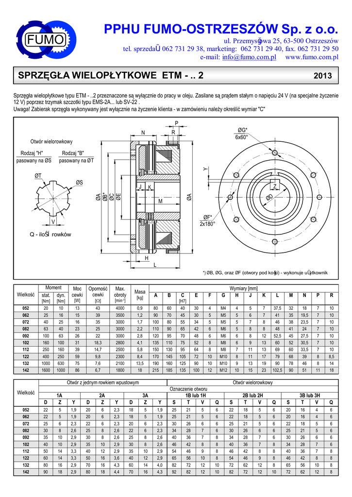 PPHU FUMO-OSTRZESZÓW Sp. z o.o. FUMO ul. Przemysłowa 25, 63-500 Ostrzeszów tel. sprzedaż: 062 731 29 38, marketing: 062 731 29 40, fax. 062 731 29 50 e-mail: [email protected] www.fumo.com.pl SPRZĘGŁA WIELOPŁYTKOWE ETM - .. 2 2013 Sprzęgła wielopłytkowe typu ETM - ..2 przeznaczone są wyłącznie do pracy w oleju. Zasilane są prądem stałym o napięciu 24 V (na specjalne życzenie 12 V) poprzez trzymak szczotki typu EMS-2A... lub SV-22 . Uwaga! Zabierak sprzęgła wykonywany jest wyłącznie na życzenie klienta - w zamówieniu należy określić wymiar "C" P ØG* 6x60° R N Otwór wielorowkowy Rodzaj "B" pasowany na Ø T Y Rodzaj "H" pasowany na ØS ØT J Z ØA ØB* ØC ØE K ØD ØA ØS M ØF* 2x180° V Q - ilość rowków H L *) ØB, ØG, oraz ØF (otwory pod kołki) - wykonuje użytkownik Wielkość 052 062 072 082 092 102 112 122 132 142 Moment stat. dyn. Moc cewki Oporność cewki Max. obroty [Nm] [Nm] [W] [W] [min-1] 20 25 40 63 100 160 250 400 1000 1600 10 16 25 40 63 100 160 250 630 1000 13 15 16 23 26 31 39 59 75 86 43 39 35 25 22 18,3 14,7 9,8 7,6 6,7 4000 3500 3000 3000 3000 2800 2500 2300 2100 1800 Masa [kg] A B 0,9 1,2 1,7 2,2 2,8 4,1 5,8 8,4 13,5 18 80 90 100 110 120 135 150 170 190 215 C E F G 30 30 34 42 48 52 64 72 90 100 4 5 5 6 6 8 8 10 10 12 M4 M5 M5 M6 M6 M8 M8 M10 M10 M12 Wymiary [mm] H J K 60 70 80 90 95 110 130 145 160 185 40 45 55 65 70 75 95 105 125 135 4 5 5 5 6 6 7 8 9 10 Otwór z jednym rowkiem wpustowym Wielkość 052 062 072 082 092 102 112 122 132 142 L M N P R 37,5 41 46 48 52,5 60 69 79 90 102,5 32 35 38 41 45 52 60 68 78 90 18 19,5 23,5 24 27,5 30,5 33,5 39 46 51 7 7 7 7 7 7 7 8 8 11 10 10 10 10 10 10 10 8,5 14 18 [H7] 5 6 7 8 8 9 11 11 13 15 7 7 8 8 12 13 13 17 19 23 Otwór wielorowkowy D 1A Z Y D 2A Z Y D 3A Z Y 22 22 25 30 35 40 50 60 80 90 5 5 6 8 10 10 14 14 16 18 1,9 1,9 2,3 2,6 2,9 2,9 3,3 3,3 2,9 2,9 20 20 22 25 30 35 40 50 70 80 6 6 6 8 8 10 12 16 16 18 2,3 2,3 2,3 2,6 2,6 2,9 2,9 3,6 4,3 4,4 18 18 20 22 25 30 35 40 60 70 5 5 6 6 8 8 10 12 14 16 1,9 1,9 2,3 2,3 2,6 2,6 2,9 2,9 4,0 4,3 Oznaczenie otworu 1B lub 1H S T V 25 25 30 34 40 46 54 65 82 92 21 21 26 28 36 42 46 56 72 82 5 5 6 7 7 8 9 10 12 12 Q S 2B lub 2H T V Q S 3B lub 3H T V Q 6 6 6 6 8 8 8 8 10 10 22 22 25 30 34 40 46 54 72 82 18 18 21 26 28 36 42 46 62 72 6 6 6 6 6 8 8 8 8 10 20 20 22 25 30 34 40 46 65 72 16 16 18 21 26 28 36 42 56 62 6 6 6 6 6 6 8 8 8 8 5 5 5 6 7 7 8 9 12 12 4 4 5 5 6 7 7 8 10 12 ZASILANIE Sprzęgła ETM -..2 przystosowane są do zasilania prądem stałym o napięciu 24±1 V. Biegun ujemny źródła prądu należy podłączyć do korpusu maszyny a biegun dodatni do trzymaka szczotki. Przy prędkości pierścienia kontaktowego sprzęgła przekraczającej 10 m/s zaleca się stosować dwa trzymaki szczotki przesunięte względem siebie o max. 90°. W celu zabezpieczenia cewki sprzęgła przed przebiciem w układzie zasilającym należy zastosować człon gaszący w postaci równolegle podłączonego do cewki opornika o oporności około 10 razy większej od oporności cewki, lub diody półprzewodnikowej lub też opornika i diody. Uwaga! Podczas eksploatacji należy kontrolować stopień zużycia szczotki. Dopuszczalne zużycie szczotki można sprawdzić poprzez wykręcenie o 1 obrót trzymaka szczotki z obudowy lub z korpusu obrabiarki. Jeżeli szczotka jest zużyta to nastąpi przerwanie dopływu prądu do cewki sprzęgła. Zużytą szczotkę należy wymienić na nową. WYMAGANIA MONTAŻOWE TRZYMAKA SZCZOTKI max.2° max.2° SMAROWANIE Smarowanie sprzęgieł wielopłytkowych ma za zadanie zmniejszenie zużycia części (głównie płytek ciernych) oraz odprowadzenie ciepła wytworzonego podczas pracy. Sprzęgła wielopłytkowe należy smarować dowolnymi olejami mineralnymi o lepkościach zależnych od prędkości liniowej sprzęgła "V" (mierzonej na średnicy zewnętrznej): · przy prędkości liniowej V<12 m/s - oleje o lepkości max. 37 cSt · przy prędkości liniowej V>12 m/s - oleje o lepkości ~ 20 cSt Uwaga! Lepkość oleju podano dla temp. 50°C [ 1 cSt = 1 mm2/s ] Sposoby smarowania sprzęgieł (od środka przez drążony wał, przez polewanie lub przez zanurzenie w oleju na wysokość 1/6 średnicy "A") uzależnione są przede wszystkim od warunków pracy. Należy wybrać taki sposób smarowania, aby temperatura oleju w układzie smarowania nie przekraczała 50°C, a temperatura sprzęgła po ustabilizowaniu się nie przekraczała 90°C. Zalecane wydatki oleju przy smarowaniu sprzęgieł przez polewanie wynoszą: Wielkość sprzęgła 052 062 072 082 092 102 112 122 132 142 Wydatek [ l/min. ] 0,3 0,3 0,4 0,6 0,8 1,2 1,6 2,0 2,5 3,0 Przy smarowaniu sprzęgieł od środka (przez drążony wał) wydatki oleju mogą zostać zmniejszone o około 50% wartości wydatków podanych w tabeli. WYMOGI TECHNICZNE ZABUDOWY I EKSPLOATACJI 1. 2. 3. 4. 5. Przed przystąpieniem do zabudowy sprzęgło należy przemyć w środku rozkonserwującym. Tuleję sprzęgła osadzić na wale współosiowo z elementem, na którym osadza się zabierak sprzęgła oraz zabezpieczyć ją przed ruchem osiowym. Bicie odcinka wału, na którym ma być osadzona tuleja max.0,02 mm. Bicie powierzchni bazowej pod zabierak powinno wynosić od 0,03÷0,05 mm w zależności od wielkości sprzęgła. Zabierak sprzęgła przymocować do elementu napędzanego lub napędzającego za pomocą wkrętów i kołków zabezpieczonych przed możliwością wypadnięcia podczas eksploatacji. Trzymak szczotki EMS... lub SV-22 zamontować zgodnie z wymaganiami podanymi na rysunku. Podczas eksploatacji, sprzęgła nie wymagają żadnej regulacji. Należy jedynie okresowo kontrolować: - czystość oleju (olej do smarowania powinien być wolny od zanieczyszczeń mechanicznych i chemicznych), - zużycie szczotki trzymaka (w praktyce dopuszczalne zużycie szczotki można sprawdzić poprzez wykręcenie o 1 obrót trzymaka szczotki z korpusu; jeżeli szczotka jest zużyta to nastąpi przerwanie dopływu prą