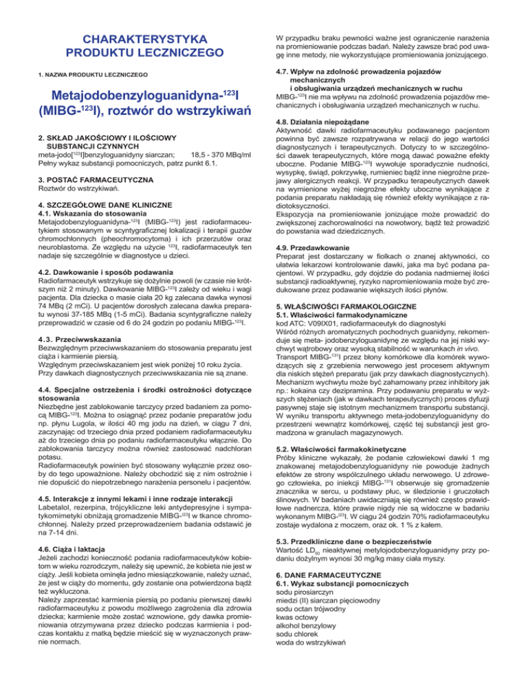 CHARAKTERYSTYKA PRODUKTU LECZNICZEGO 1. NAZWA PRODUKTU LECZNICZEGO Metajodobenzyloguanidyna-123I (MIBG-123I), roztwór do wstrzykiwań 2. SKŁAD JAKOŚCIOWY I ILOŚCIOWY SUBSTANCJI CZYNNYCH meta-jodo[123I]benzyloguanidyny siarczan; 18,5 - 370 MBq/ml Pełny wykaz substancji pomocniczych, patrz punkt 6.1. 3. POSTAĆ FARMACEUTYCZNA Roztwór do wstrzykiwań. 4. SZCZEGÓŁOWE DANE KLINICZNE 4.1. Wskazania do stosowania Metajodobenzyloguanidyna-123I (MIBG-123I) jest radiofarmaceutykiem stosowanym w scyntygraficznej lokalizacji i terapii guzów chromochłonnych (pheochromocytoma) i ich przerzutów oraz neuroblastoma. Ze względu na użycie 123I, radiofarmaceutyk ten nadaje się szczególnie w diagnostyce u dzieci. 4.2. Dawkowanie i sposób podawania Radiofarmaceutyk wstrzykuje się dożylnie powoli (w czasie nie krótszym niż 2 minuty). Dawkowanie MIBG-123I zależy od wieku i wagi pacjenta. Dla dziecka o masie ciała 20 kg zalecana dawka wynosi 74 MBq (2 mCi). U pacjentów dorosłych zalecana dawka preparatu wynosi 37-185 MBq (1-5 mCi). Badania scyntygraficzne należy przeprowadzić w czasie od 6 do 24 godzin po podaniu MIBG-123I. 4.3. Przeciwwskazania Bezwzględnym przeciwwskazaniem do stosowania preparatu jest ciąża i karmienie piersią. Względnym przeciwskazaniem jest wiek poniżej 10 roku życia. Przy dawkach diagnostycznych przeciwwskazania nie są znane. 4.4. Specjalne ostrzeżenia i środki ostrożności dotyczące stosowania Niezbędne jest zablokowanie tarczycy przed badaniem za pomocą MIBG-123I. Można to osiągnąć przez podanie preparatów jodu np. płynu Lugola, w ilości 40 mg jodu na dzień, w ciągu 7 dni, zaczynając od trzeciego dnia przed podaniem radiofarmaceutyku aż do trzeciego dnia po podaniu radiofarmaceutyku włącznie. Do zablokowania tarczycy można również zastosować nadchloran potasu. Radiofarmaceutyk powinien być stosowany wyłącznie przez osoby do tego upoważnione. Należy obchodzić się z nim ostrożnie i nie dopuścić do niepotrzebnego narażenia personelu i pacjentów. 4.5. Interakcje z innymi lekami i inne rodzaje interakcji Labetalol, rezerpina, trójcykliczne leki antydepresyjne i sympatykomimetyki obniżają gromadzenie MIBG-I23I w tkance chromochłonnej. Należy przed przeprowadzeniem badania odstawić je na 7-14 dni. 4.6. Ciąża i laktacja Jeżeli zachodzi konieczność podania radiofarmaceutyków kobietom w wieku rozrodczym, należy się upewnić, że kobieta nie jest w ciąży. Jeśli kobieta ominęła jedno miesiączkowanie, należy uznać, że jest w ciąży do momentu, gdy zostanie ona potwierdzona bądź też wykluczona. Należy zaprzestać karmienia piersią po podaniu pierwszej dawki radiofarmaceutyku z powodu możliwego zagrożenia dla zdrowia dziecka; karmienie może zostać wznowione, gdy dawka promieniowania otrzymywana przez dziecko podczas karmienia i podczas kontaktu z matką będzie mieścić się w wyznaczonych prawnie normach. W przypadku braku pewności ważne jest ograniczenie narażenia na promieniowanie podczas badań. Należy zawsze brać pod uwagę inne metody, nie wykorzystujące promieniowania jonizującego. 4.7. Wpływ na zdolność prowadzenia pojazdów mechanicznych i obsługiwania urządzeń mechanicznych w ruchu MIBG-123I nie ma wpływu na zdolność prowadzenia pojazdów mechanicznych i obsługiwania urządzeń mechanicznych w ruchu. 4.8. Działania niepożądane Aktywność dawki radiofarmaceutyku podawanego pacjentom powinna być zawsze rozpatrywana w relacji do jego wartości diagnostycznych i terapeutycznych. Dotyczy to w szczególności dawek terapeutycznych, które mogą dawać poważne efekty uboczne. Podanie MIBG-123I wywołuje sporadycznie nudności, wysypkę, świąd, pokrzywkę, rumieniec bądź inne niegroźne przejawy alergicznych reakcji. W przypadku terapeutycznych dawek na wymienione wyżej niegroźne efekty uboczne wynikające z podania preparatu nakładają się również efekty wynikające z radiotoksyczności. Ekspozycja na promieniowanie jonizujące może prowadzić do zwiększonej zachorowalności na nowotwory, bądź też prowadzić do powstania wad dziedzicznych. 4.9. Przedawkowanie Preparat jest dostarczany w fiolkach o znanej aktywności, co ułatwia lekarzowi kontrolowanie dawki, jaka ma być podana pacjentowi. W przypadku, gdy dojdzie do podania nadmiernej ilości substancji radioaktywnej, ryzyko napromieniowania może być zredukowane przez podawanie większych ilości płynów. 5. WŁAŚCIWOŚCI FARMAKOLOGICZNE 5.1. Właściwości farmakodynamiczne kod ATC: V09IX01, radiofarmaceutyk do diagnostyki Wśród różnych aromatycznych pochodnych guanidyny, rekomenduje się meta- jodobenzyloguanidynę ze względu na jej niski wychwyt wątrobowy oraz wysoką stabilność w warunkach in vivo. Transport MIBG-131I przez błony komórkowe dla komórek wywodzących się z grzebienia nerwowego jest procesem aktywnym dla niskich stężeń preparatu (jak przy dawkach diagnostycznych). Mechanizm wychwytu może być zahamowany przez inhibitory jak np.: kokaina czy dezipramina. Przy podawaniu preparatu w wyższych stężeniach (jak w dawkach terapeutycznych) proces dyfuzji pasywnej staje się istotnym mechanizmem transportu substancji. W wyniku transportu aktywnego meta-jodobenzyloguanidyny do przestrzeni wewnątrz komórkowej, część tej substancji jest gromadzona w granulach magazynowych. 5.2. Właściwości farmakokinetyczne Próby kliniczne wykazały, że podanie człowiekowi dawki 1 mg znakowanej metajodobenzyloguanidyny nie powoduje żadnych efektów ze strony wspólczulnego układu nerwowego. U zdrowego człowieka, po iniekcji MIBG-131I obserwuje się gromadzenie znacznika w sercu, u podstawy płuc, w śledzionie i gruczołach ślinowych. W badaniach uwidaczniają się również często prawidłowe nadnercza, które prawie nigdy nie są widoczne w badaniu wykonanym MIBG-I23I. W ciągu 24 godzin 70% radiofarmaceutyku zostaje wydalona z moczem, oraz ok. 1 % z kałem. 5.3. Przedkliniczne dan