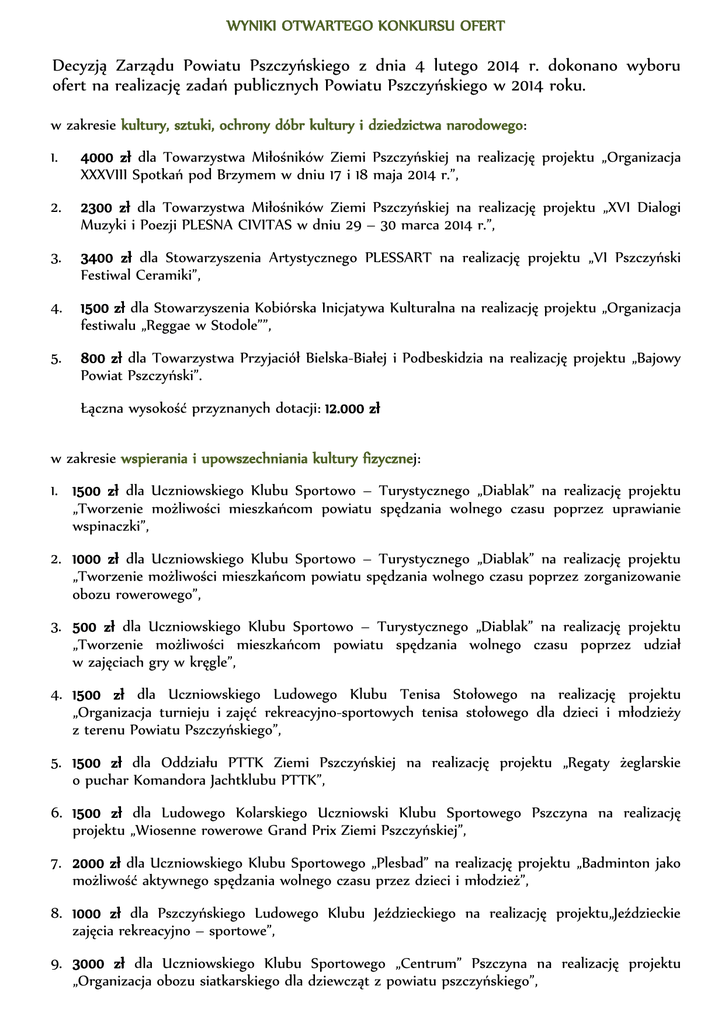 WYNIKI OTWARTEGO KONKURSU OFERT Decyzją Zarządu Powiatu Pszczyńskiego z dnia 4 lutego 2014 r. dokonano wyboru ofert na realizację zadań publicznych Powiatu Pszczyńskiego w 2014 roku. w zakresie kultury, sztuki, ochrony dóbr kultury i dziedzictwa narodowego: 1. 4000 zł dla Towarzystwa Miłośników Ziemi Pszczyńskiej na realizację projektu „Organizacja XXXVIII Spotkań pod Brzymem w dniu 17 i 18 maja 2014 r.”, 2. 2300 zł dla Towarzystwa Miłośników Ziemi Pszczyńskiej na realizację projektu „XVI Dialogi Muzyki i Poezji PLESNA CIVITAS w dniu 29 – 30 marca 2014 r.”, 3. 3400 zł dla Stowarzyszenia Artystycznego PLESSART na realizację projektu „VI Pszczyński Festiwal Ceramiki”, 4. 1500 zł dla Stowarzyszenia Kobiórska Inicjatywa Kulturalna na realizację projektu „Organizacja festiwalu „Reggae w Stodole””, 5. 800 zł dla Towarzystwa Przyjaciół Bielska-Białej i Podbeskidzia na realizację projektu „Bajowy Powiat Pszczyński”. Łączna wysokość przyznanych dotacji: 12.000 zł w zakresie wspierania i upowszechniania kultury fizycznej: 1. 1500 zł dla Uczniowskiego Klubu Sportowo – Turystycznego „Diablak” na realizację projektu „Tworzenie możliwości mieszkańcom powiatu spędzania wolnego czasu poprzez uprawianie wspinaczki”, 2. 1000 zł dla Uczniowskiego Klubu Sportowo – Turystycznego „Diablak” na realizację projektu „Tworzenie możliwości mieszkańcom powiatu spędzania wolnego czasu poprzez zorganizowanie obozu rowerowego”, 3. 500 zł dla Uczniowskiego Klubu Sportowo – Turystycznego „Diablak” na realizację projektu „Tworzenie możliwości mieszkańcom powiatu spędzania wolnego czasu poprzez udział w zajęciach gry w kręgle”, 4. 1500 zł dla Uczniowskiego Ludowego Klubu Tenisa Stołowego na realizację projektu „Organizacja turnieju i zajęć rekreacyjno-sportowych tenisa stołowego dla dzieci i młodzieży z terenu Powiatu Pszczyńskiego”, 5. 1500 zł dla Oddziału PTTK Ziemi Pszczyńskiej na realizację projektu „Regaty żeglarskie o puchar Komandora Jachtklubu PTTK”, 6. 1500 zł dla Ludowego Kolarskiego Uczniowski Klubu Sportowego Pszczyna na realizację projektu „Wiosenne rowerowe Grand Prix Ziemi Pszczyńskiej”, 7. 2000 zł dla Uczniowskiego Klubu Sportowego „Plesbad” na realizację projektu „Badminton jako możliwość aktywnego spędzania wolnego czasu przez dzieci i młodzież”, 8. 1000 zł dla Pszczyńskiego Ludowego Klubu Jeździeckiego na realizację projektu„Jeździeckie zajęcia rekreacyjno – sportowe”, 9. 3000 zł dla Uczniowskiego Klubu Sportowego „Centrum” Pszczyna na realizację projektu „Organizacja obozu siatkarskiego dla dziewcząt z powiatu pszczyńskiego”, 10. 2000 zł dla Uczniowskiego Klubu Sportowego „Centrum” Pszczyna na realizację projektu „Organizacja festiwalu siatkówki „Siatkarski Mundial na Orliku” z okazji odbywających się w Polsce i w województwie śląskim Mistrzostw Świata w siatkówce mężczyzn”, 11. 2000 zł dla Miejskiego Klubu Sportowego ISKRA na realizację projektu „Wspomaganie rozwoju uzdolnień sportowych dzieci i młodzieży”, 12. 1500 zł dla Miejskiego Klubu Sportowego ISKRA na realizację projektu „Organizacje zawodów z elementami współzawodnictwa sportowego dla mieszkańców”, 13. 1000 zł dla Pszczyńskiego Ludowego Klubu Sportowego na realizację projektu „Tworzenie możliwości dzieciom i młodzieży spędzania wolnego czasu poprzez uprawianie sportu oraz udział w zajęciach rekreacyjno - sportowych”. Łączna wysokość przyznanych dotacji: 20.000 zł w zakresie turystyki i krajoznawstwa: 1. 1000 zł dla Uczniowskiego Klubu Sportowo – Turystycznego „Diablak” na realizację projektu „I Rajd Górski dla uczniów Szkół Podstawowych Gminy Pszczyna i Powiatu Pszczyńskiego”, 2. 1500 zł dla Uczniowskiego Klubu Sportowo – Turystycznego „Diablak” na realizację projektu „Tworzenie możliwości mieszkańcom powiatu spędzania wolnego czasu poprzez uprawianie turystyki”, 3. 1000 zł dla Oddziału PTTK Ziemi Pszczyńskiej na realizację projektu „Ogólnopolskie zawody na orientację – „VII Tropy Żubra”, puchar Polski – III ruda”, 4. 1000 zł dla Oddziału PTTK Ziemi Pszczyńskiej na realizację projektu „X Rajd Rowerowy Poznajemy Okolice Jeziora Goczałkowickiego”, 5. 1500 zł dla Oddziału PTTK Ziemi Pszczyńskiej na realizację projektu „XVI Rajd Górski Pieszy dla młodzieży Powiatu Pszczyńskiego”, 6. 2000 zł dla Stowarzyszenia Pszczyński Uniwersytet Trzeciego Wieku na realizację projektu „Aktywny senior – pogodny senior”. Łączna wysokość przyznanych dotacji: 8.000 zł w zakresie ochrony i promocji zdrowia: 1. 4.000 zł dla Polskiego Stowarzyszenia Na Rzecz Osób z Upośledzeniem Umysłowym Koło w Pszczynie na realizację projektu "Terapia i rehabilitacja w zakresie promocji i ochronny zdrowia dla osób dorosłych ze sprężoną głęboką niepełnosprawności podopiecznych w Świetlicy Terapeutycznej- placówce koła PSOUU w Pszczynie", 2. 4.000 zł dla Stowarzyszenia na rzecz Pomocy Uczniom z Upośledzeniem Umysłowym przy Zespole Szkół nr 3 Specjalnych w Pszczynie „RAZEM” na realizację projektu "Pływanie, hipoterapia i dogoterapia jako formy rehabilitacji osób z niepełnosprawnością intelektualną", 3. 2.000 zł dla Uczniowskiego Klubu Sportowego „CENTRUM” Pszczyna na realizację projektu "Zdrowe odżywianie i pozytywne wzmacnianie krokiem do sukcesu w sporcie". Łączna wysokość przyznanych dotacji: 10.000 zł