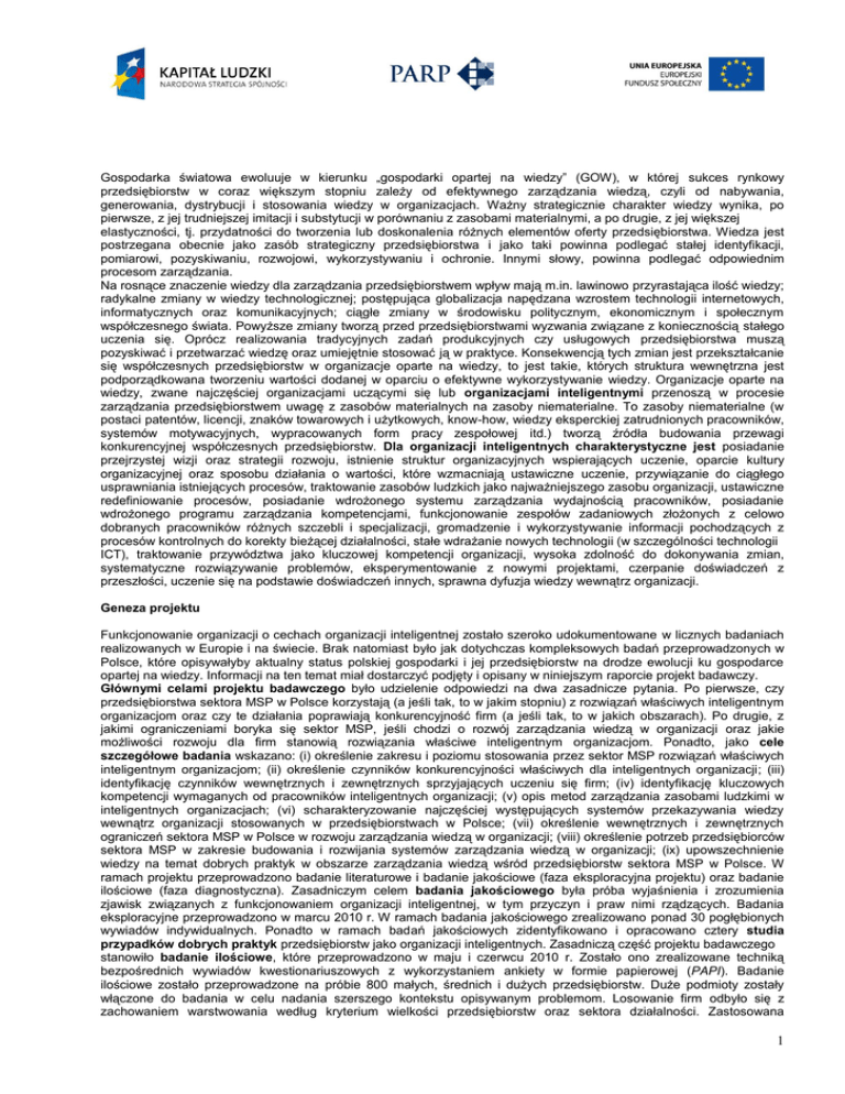 Streszczenie Gospodarka światowa ewoluuje w kierunku „gospodarki opartej na wiedzy” (GOW), w której sukces rynkowy przedsiębiorstw w coraz większym stopniu zależy od efektywnego zarządzania wiedzą, czyli od nabywania, generowania, dystrybucji i stosowania wiedzy w organizacjach. Ważny strategicznie charakter wiedzy wynika, po pierwsze, z jej trudniejszej imitacji i substytucji w porównaniu z zasobami materialnymi, a po drugie, z jej większej elastyczności, tj. przydatności do tworzenia lub doskonalenia różnych elementów oferty przedsiębiorstwa. Wiedza jest postrzegana obecnie jako zasób strategiczny przedsiębiorstwa i jako taki powinna podlegać stałej identyfikacji, pomiarowi, pozyskiwaniu, rozwojowi, wykorzystywaniu i ochronie. Innymi słowy, powinna podlegać odpowiednim procesom zarządzania. Na rosnące znaczenie wiedzy dla zarządzania przedsiębiorstwem wpływ mają m.in. lawinowo przyrastająca ilość wiedzy; radykalne zmiany w wiedzy technologicznej; postępująca globalizacja napędzana wzrostem technologii internetowych, informatycznych oraz komunikacyjnych; ciągłe zmiany w środowisku politycznym, ekonomicznym i społecznym współczesnego świata. Powyższe zmiany tworzą przed przedsiębiorstwami wyzwania związane z koniecznością stałego uczenia się. Oprócz realizowania tradycyjnych zadań produkcyjnych czy usługowych przedsiębiorstwa muszą pozyskiwać i przetwarzać wiedzę oraz umiejętnie stosować ją w praktyce. Konsekwencją tych zmian jest przekształcanie się współczesnych przedsiębiorstw w organizacje oparte na wiedzy, to jest takie, których struktura wewnętrzna jest podporządkowana tworzeniu wartości dodanej w oparciu o efektywne wykorzystywanie wiedzy. Organizacje oparte na wiedzy, zwane najczęściej organizacjami uczącymi się lub organizacjami inteligentnymi przenoszą w procesie zarządzania przedsiębiorstwem uwagę z zasobów materialnych na zasoby niematerialne. To zasoby niematerialne (w postaci patentów, licencji, znaków towarowych i użytkowych, know-how, wiedzy eksperckiej zatrudnionych pracowników, systemów motywacyjnych, wypracowanych form pracy zespołowej itd.) tworzą źródła budowania przewagi konkurencyjnej współczesnych przedsiębiorstw. Dla organizacji inteligentnych charakterystyczne jest posiadanie przejrzystej wizji oraz strategii rozwoju, istnienie struktur organizacyjnych wspierających uczenie, oparcie kultury organizacyjnej oraz sposobu działania o wartości, które wzmacniają ustawiczne uczenie, przywiązanie do ciągłego usprawniania istniejących procesów, traktowanie zasobów ludzkich jako najważniejszego zasobu organizacji, ustawiczne redefiniowanie procesów, posiadanie wdrożonego systemu zarządzania wydajnością pracowników, posiadanie wdrożonego programu zarządzania kompetencjami, funkcjonowanie zespołów zadaniowych złożonych z celowo dobranych pracowników różnych szczebli i specjalizacji, gromadzenie i wykorzystywanie informacji pochodzących z procesów kontrolnych do korekty bieżącej działalności, stałe wdrażanie nowych technologii (w szczególności technologii ICT), traktowanie przywództwa jako kluczowej kompetencji organizacji, wysoka zdolność do dokonywania zmian, systematyczne rozwiązywanie problemów, eksperymentowanie z nowymi projektami, czerpanie doświadczeń z przeszłości, uczenie się na podstawie doświadczeń innych, sprawna dyfuzja wiedzy wewnątrz organizacji. Geneza projektu Funkcjonowanie organizacji o cechach organizacji inteligentnej zostało szeroko udokumentowane w licznych badaniach realizowanych w Europie i na świecie. Brak natomiast było jak dotychczas kompleksowych badań przeprowadzonych w Polsce, które opisywałyby aktualny status polskiej gospodarki i jej przedsiębiorstw na drodze ewolucji ku gospodarce opartej na wiedzy. Informacji na ten temat miał dostarczyć podjęty i opisany w niniejszym raporcie projekt badawczy. Głównymi celami projektu badawczego było udzielenie odpowiedzi na dwa zasadnicze pytania. Po pierwsze, czy przedsiębiorstwa sektora MSP w Polsce korzystają (a jeśli tak, to w jakim stopniu) z rozwiązań właściwych inteligentnym organizacjom oraz czy te działania poprawiają konkurencyjność firm (a jeśli tak, to w jakich obszarach). Po drugie, z jakimi ograniczeniami boryka się sektor MSP, jeśli chodzi o rozwój zarządzania wiedzą w organizacji oraz jakie możliwości rozwoju dla firm stanowią rozwiązania właściwe inteligentnym organizacjom. Ponadto, jako cele szczegółowe badania wskazano: (i) określenie zakresu i poziomu stosowania przez sektor MSP rozwiązań właściwych inteligentnym organizacjom; (ii) określenie czynników konkurencyjności właściwych dla inteligentnych organizacji; (iii) identyfikację czynników wewnętrznych i zewnętrznych sprzyjających uczeniu się firm; (iv) identyfikację kluczowych kompetencji wymaganych od pracowników inteligentnych organizacji; (v) opis metod zarządzania zasobami ludzkimi w inteligentnych organizacjach; (vi) scharakteryzowanie najczęściej występujących systemów przekazywania wiedzy wewnątrz organizacji stosowanych w przedsiębiorstwach w Polsce; (vii) określenie wewnętrznych i zewnętrznych ograniczeń sektora MSP w Polsce w rozwoju zarządzania wiedzą w organizacji; (viii) określenie potrzeb przedsiębiorców sektora MSP w zakresie budowania i rozwijania systemów zarządzania wiedzą w organizacji; (ix) upowszechnienie wiedzy na temat dobrych praktyk w obszarze zarządzania wiedzą wśród przedsiębiorstw sektora MSP w Polsce. W ramach projektu przeprowadzono badanie literaturowe i badanie jakościowe (faza eksploracyjna projektu) oraz badanie ilościowe (faza diagnostyczna). Zasadniczym celem badania jakościowego była próba wyjaśnienia i zrozumienia zjawisk związanych z funkcjonowaniem organizacji inteligentnej, w tym przyczyn i praw nimi rządzących. Badania eksploracyjne przeprowadzono w marcu 2010