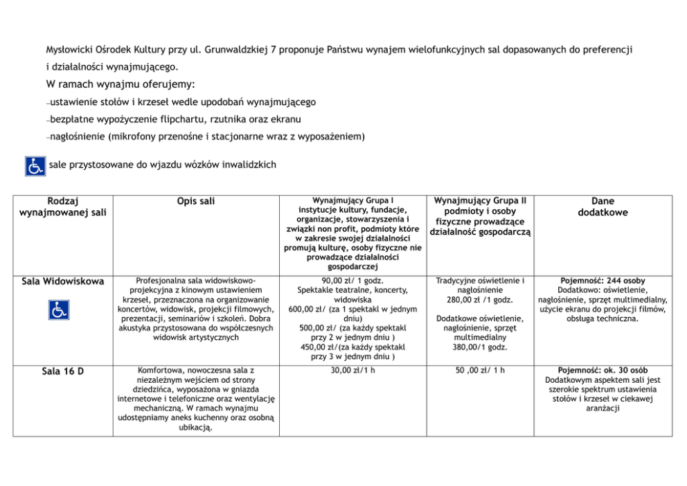 Mysłowicki Ośrodek Kultury przy ul. Grunwaldzkiej 7 proponuje Państwu wynajem wielofunkcyjnych sal dopasowanych do preferencji i działalności wynajmującego. W ramach wynajmu oferujemy: ustawienie bezpłatne stołów i krzeseł wedle upodobań wynajmującego wypożyczenie flipchartu, rzutnika oraz ekranu nagłośnienie (mikrofony przenośne i stacjonarne wraz z wyposażeniem) sale przystosowane do wjazdu wózków inwalidzkich Rodzaj wynajmowanej sali Opis sali Sala Widowiskowa Profesjonalna sala widowiskowoprojekcyjna z kinowym ustawieniem krzeseł, przeznaczona na organizowanie koncertów, widowisk, projekcji filmowych, prezentacji, seminariów i szkoleń. Dobra akustyka przystosowana do współczesnych widowisk artystycznych 90,00 zł/ 1 godz. Spektakle teatralne, koncerty, widowiska 600,00 zł/ (za 1 spektakl w jednym dniu) 500,00 zł/ (za każdy spektakl przy 2 w jednym dniu ) 450,00 zł/(za każdy spektakl przy 3 w jednym dniu ) Tradycyjne oświetlenie i nagłośnienie 280,00 zł /1 godz. Komfortowa, nowoczesna sala z niezależnym wejściem od strony dziedzińca, wyposażona w gniazda internetowe i telefoniczne oraz wentylację mechaniczną. W ramach wynajmu udostępniamy aneks kuchenny oraz osobną ubikacją. 30,00 zł/1 h 50 ,00 zł/ 1 h Sala 16 D Wynajmujący Grupa I Wynajmujący Grupa II instytucje kultury, fundacje, podmioty i osoby organizacje, stowarzyszenia i fizyczne prowadzące związki non profit, podmioty które działalność gospodarczą w zakresie swojej działalności promują kulturę, osoby fizyczne nie prowadzące działalności gospodarczej Dodatkowe oświetlenie, nagłośnienie, sprzęt multimedialny 380,00/1 godz. Dane dodatkowe Pojemność: 244 osoby Dodatkowo: oświetlenie, nagłośnienie, sprzęt multimedialny, użycie ekranu do projekcji filmów, obsługa techniczna. Pojemność: ok. 30 osób Dodatkowym aspektem sali jest szerokie spektrum ustawienia stołów i krzeseł w ciekawej aranżacji Studio muzyczne Oferujemy sale prób z dobrymi warunkami sprzętowymi gdzie w luźnej atmosferze można zawodowo zagrać i nagrać próbę. 15,00 zł/1 h bez zaplecza backline 20,00 zł/ 1 h z zapleczem backline W cenie zawarta jest sala prób, mixer, nagłośnienie, 2 mikrofony, wynajem na minimum 3 h W cenie zawarta jest sala prób, mixer, nagłośnienie, 2 mikrofony, perkusja bez blach i werbla, 2 x piece gitarowe, 1 x piec basowy, syntezator. wynajem na minimum 2 h Sala baletowa 302A Sala przeznaczona do prowadzenia zajęć taneczno-muzycznych. W sali znajdują się lustra na całej długości ściany, drążki baletowe oraz drabinki 30,00 zł/ 1 godz. 60,00 zł/ za godz. Pojemność: ok. 30 osób Do wyposażenia sali należy: fortepian, materace i sprzęt do dotwarzania płyt CD. Sala baletowa 202A Sala przeznaczona do prowadzenia zajęć taneczno-muzycznych. W sali znajdują się lustra na całej długości ściany, drążki baletowe oraz drabinki 30,00zł/ 1 godz. 60,00 zł/ 1 godz. Pojemność: ok. 30 osób Do wyposażenia sali należą materace i sprzęt do dotwarzania płyt CD. Sala wielofunkcyjna 201 A Sala przystosowana do prowadzenia szkoleń, warsztatów oraz rożnego rodzaju spotkań. W sali znajdują się krzesła, stoły, pianino oraz meble biurowe. 25,00 zł/ 1 godz. 40,00 zł/ 1 godz. Pojemność: ok. 20 osób Przy cyklicznym wynajmie można przechowywać w sali materiały potrzebne do działań. Sala konferencyjna 206D Przestronna sala idealna do prowadzenia szkoleń, kursów, spotkań, konferencji... Możliwość ustawienia stołów i krzeseł wedle preferencji wynajmującego. 30,00/1 godz. 60,00zł/1 godz. Pojemność: ok. 40 osób Galeria duża Elegancka i przestronna przestrzeń w ciekawej aranżacji, zlokalizowana w dolnej części budynku tuż obok wejścia od strony ul. Grunwaldzkiej. Świetnie nadająca się do różnego rodzaju prezentacji, pokazów, konferencji... 50,00 zł/1 godz. 130,00 zł/ 1 godz. Pojemność: ok. 50 osób (ok. 110 m² powierzchni) Możliwość wniesienia i ustawienia stołów, krzeseł oraz puf dziecięcych. Galeria mała Kameralna i przytulna galeria zlokalizowana na parterze z ciekawym zakresem zaadaptowania. 25,00 zł/1 godz. 60,00 zł/1 godz. Pojemność: ok. 25 osób (ok. 42 m² powierzchni) Hol Duża, elegancka przestrzeń, świetnie sprawdzająca się w dziedzinie handlu i marketingu z możliwością odgrodzenia od pozostałej części budynku. 50,00 zł/1 godz. 90,00 zł/1 godz. Pojemność: ok. 80 osób Hol jest położony tuż przy sali widowiskowej z możliwościowa wykorzystania szatni na 240 osób. Sala Małych Form Klimatyzowana sala o dużej powierzchni, świetnie nadająca się do nauki tańca z możliwością wstawienia stołów i krzeseł 80,00zł/1 godz. 130,00 zł/1 godz. Pojemność: ok.130 osób (ok. 220 m² powierzchni) możliwość zaadaptowania kantorka przylegającego do sali. Garderoby Spokojne i klimatyczne pomieszczenia świetnie nadające się do zajęć indywidualnych 15,00 zł/ 1 godz. 25,00 zł/ 1 godz. Pojemność: do 10 osób Możliwość ustawienia stołów i krzeseł wedle upodobań wynajmującego Dodatkowe warunki najmu sal: 1.W studiu muzycznym obowiązywać będą protokoły zdawczo – odbiorcze, zespoły będą wypełniać je przed i po zakończeniu próby według których będzie określany stan techniczny urządzeń (w razie dewastacji). 2.Za wynajem studia muzycznego płatność z góry za miesiąc. 3.Studio muzyczne udostępniamy od poniedziałku do niedzieli od 8.00 do 22.00. 4.Dyrektor może zadecydować o obniżeniu stawek między innymi w przypadkach gdy: - w pomieszczeniach jest prowadzona działalność promująca kulturę, - grupy wynajmujące pomieszczenia działają pod patronatem MOK - prowadzona jest działalność oświatowa, edukacyjna lub kulturalna między innymi na rzecz osób niepełnosprawnych, mieszkańców ze środowisk zagrożonych wykluczeniem społecznym, ze szczególnym uwzględnieniem dzieci i młodzieży, - prowadzona jest działalność zwią
