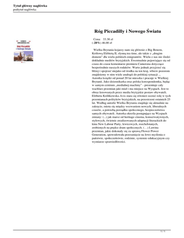 Tytuł główny nagłówka podtytuł nagłówka Róg Piccadilly i Nowego Światu Cena: 33.30 zł (-28%) 46.00 zł Wielka Brytania kojarzy nam się głównie z Big Benem, Królową Elżbietą II, słynną tea time, ale także z „drugim domem” dla wielu polskich emigrantów. Wielu z nas nie śledzi dokładnie mediów brytyjskich. Ewentualnie pojawiające się od czasu do czasu komentarze premiera Camerona dotyczące bezpośrednio naszych rodaków. Warto jednak przyjrzeć się bliżej i spojrzeć niejako od środka na ten kraj, wbrew pozorom znajdziemy w nim wiele analogii do polskiej sytuacji ... Autorka książki od ponad 20 lat mieszka i pracuje w Wielkiej Brytanii. Jako dziennikarka oraz polska korespondentka, będąc w samym centrum „medialnej machiny” - prezentuje cały wachlarz przemian jaki miał i ma miejsce na Wyspach. Jest to obraz kreowanych przez media brytyjskie postaw obywateli. Elżbieta Królikowska-Avis stara się również ocenić rolę w tych przemianach polityków brytyjskich, na przestrzeni ostatnich 25 lat. Według autorki Wielka Brytania znajduje się aktualnie na zakręcie, miota się między wezwaniem nowych, liberalnych czasów, a potrzebą porządku społecznego, bezpieczeństwa samych obywateli. Autorka określa postępujące na Wyspach zmiany: (...) jak marsz od heritage cinema, konserwatywnych, stylowych, świetnie zrealizowanych adaptacji literackich do kina New Labour Party, lewicowych, rozchełstanych, zrobionych na prędce dram społecznych. (…) Lawina przemian, jakie dokonały się za sprawą Flower Power Generation, spowodowała przesunięcie na lewo myślenia o państwie, społeczeństwie, rodzinie, systemie edukacyjnym czy wymiarze sprawiedliwości. 1/1 Powered by TCPDF (www.tcpdf.org)