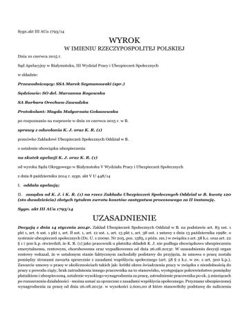 Wyrokiem z dnia 8 października 2014r. Sąd Okręgowy w Białymstoku odwołanie oddalił, iż zasądził od