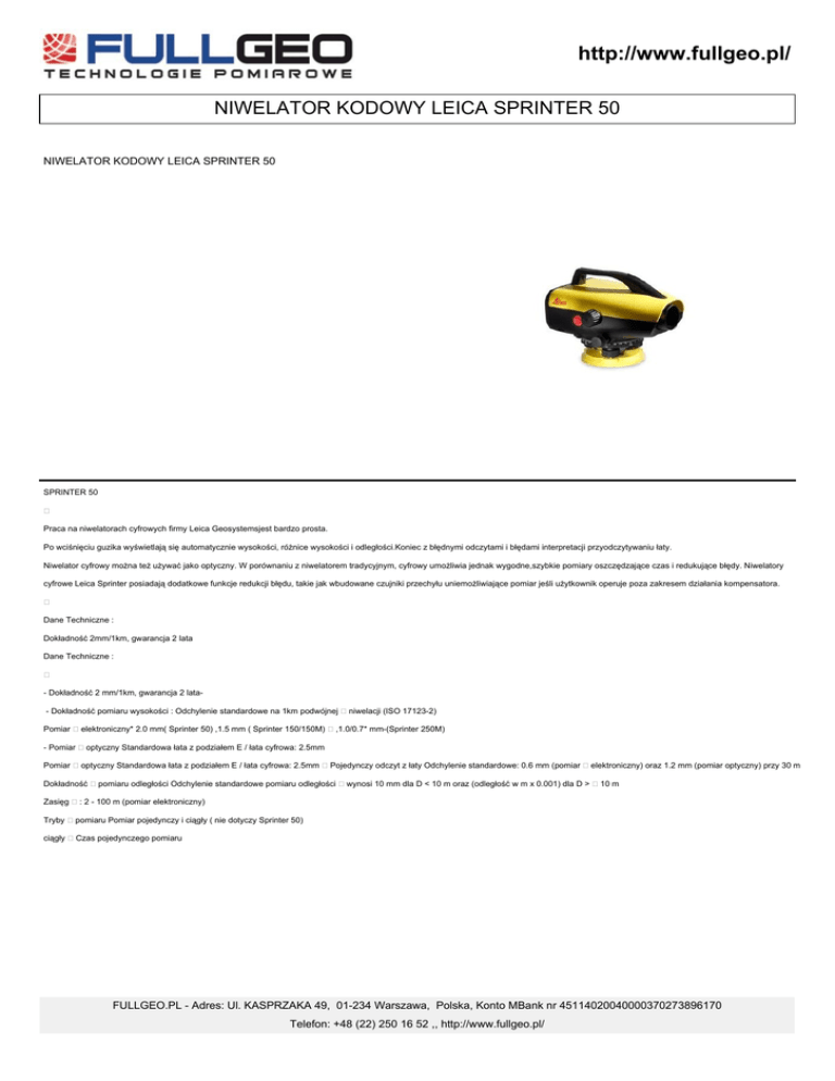 http://www.fullgeo.pl/ NIWELATOR KODOWY LEICA SPRINTER 50 NIWELATOR KODOWY LEICA SPRINTER 50 SPRINTER 50 Praca na niwelatorach cyfrowych firmy Leica Geosystemsjest bardzo prosta. Po wciśnięciu guzika wyświetlają się automatycznie wysokości, różnice wysokości i odległości.Koniec z błędnymi odczytami i błędami interpretacji przyodczytywaniu łaty. Niwelator cyfrowy można też używać jako optyczny. W porównaniu z niwelatorem tradycyjnym, cyfrowy umożliwia jednak wygodne,szybkie pomiary oszczędzające czas i redukujące błędy. Niwelatory cyfrowe Leica Sprinter posiadają dodatkowe funkcje redukcji błędu, takie jak wbudowane czujniki przechyłu uniemożliwiające pomiar jeśli użytkownik operuje poza zakresem działania kompensatora. Dane Techniczne : Dokładność 2mm/1km, gwarancja 2 lata Dane Techniczne : - Dokładność 2 mm/1km, gwarancja 2 lata- Dokładność pomiaru wysokości : Odchylenie standardowe na 1km podwójnej niwelacji (ISO 17123-2) Pomiar elektroniczny* 2.0 mm( Sprinter 50) ,1.5 mm ( Sprinter 150/150M) ,1.0/0.7* mm-(Sprinter 250M) - Pomiar optyczny Standardowa łata z podziałem E / łata cyfrowa: 2.5mm Pomiar optyczny Standardowa łata z podziałem E / łata cyfrowa: 2.5mm Pojedynczy odczyt z łaty Odchylenie standardowe: 0.6 mm (pomiar elektroniczny) oraz 1.2 mm (pomiar optyczny) przy 30 m Dokładność pomiaru odległości Odchylenie standardowe pomiaru odległości wynosi 10 mm dla D < 10 m oraz (odległość w m x 0.001) dla D > 10 m Zasięg : 2 - 100 m (pomiar elektroniczny) Tryby pomiaru Pomiar pojedynczy i ciągły ( nie dotyczy Sprinter 50) ciągły Czas pojedynczego pomiaru FULLGEO.PL - Adres: Ul. KASPRZAKA 49, 01-234 Warszawa, Polska, Konto MBank nr 45114020040000370273896170 Telefon: +48 (22) 250 16 52 ,, http://www.fullgeo.pl/ http://www.fullgeo.pl/ FULLGEO.PL - Adres: Ul. KASPRZAKA 49, 01-234 Warszawa, Polska, Konto MBank nr 45114020040000370273896170 Telefon: +48 (22) 250 16 52 ,, http://www.fullgeo.pl/