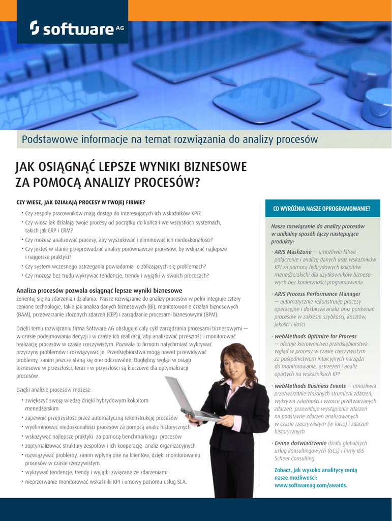 Podstawowe informacje na temat rozwiązania do analizy procesów JAK OSIĄGNĄĆ LEPSZE WYNIKI BIZNESOWE ZA POMOCĄ ANALIZY PROCESÓW? Czy wiesz, jak działają procesy w Twojej firmie? •Czy zespoły pracowników mają dostęp do interesujących ich wskaźników KPI? •Czy wiesz jak działają twoje procesy od początku do końca i we wszystkich systemach, takich jak ERP i CRM? •Czy możesz analizować procesy, aby wyszukiwać i eliminować ich niedoskonałości? •Czy jesteś w stanie przeprowadzać analizy porównawcze procesów, by wskazać najlepsze i najgorsze praktyki? •Czy system wczesnego ostrzegania powiadamia o zbliżających się problemach? •Czy możesz bez trudu wykrywać tendencje, trendy i wyjątki w swoich procesach? Analiza procesów pozwala osiągnąć lepsze wyniki biznesowe Zorientuj się na zdarzenia i działania. Nasze rozwiązanie do analizy procesów w pełni integruje cztery cenione technologie, takie jak analiza danych biznesowych (BI), monitorowanie działań biznesowych (BAM), przetwarzanie złożonych zdarzeń (CEP) i zarządzanie procesami biznesowymi (BPM). Dzięki temu rozwiązaniu firma Software AG obsługuje cały cykl zarządzania procesami biznesowymi — w czasie podejmowania decyzji i w czasie ich realizacji, aby analizować przeszłość i monitorować realizację procesów w czasie rzeczywistym. Pozwala to firmom natychmiast wykrywać przyczyny problemów i rozwiązywać je. Przedsiębiorstwa mogą nawet przewidywać problemy, zanim jeszcze staną się one odczuwalne. Dogłębny wgląd w osiągi biznesowe w przeszłości, teraz i w przyszłości są kluczowe dla optymalizacji procesów. Dzięki analizie procesów możesz: •zwiększyć swoją wiedzę dzięki hybrydowym kokpitom menedżerskim •zapewnić przejrzystość przez automatyczną rekonstrukcję procesów •wyeliminować niedoskonałości procesów za pomocą analiz historycznych •wskazywać najlepsze praktyki za pomocą benchmarkingu procesów •zoptymalizować struktury zespołów i ich kooperację analiz organizacyjnych •rozwiązywać problemy, zanim wpłyną one na klientów, dzięki monitorowaniu procesów w czasie rzeczywistym •wykrywać tendencje, trendy i wyjątki związane ze zdarzeniami •nieprzerwanie monitorować wskaźniki KPI i umowy poziomu usług SLA. CO WYRÓŻNIA NASZE OPROGRAMOWANIE? Nasze rozwiązanie do analizy procesów w unikalny sposób łączy następujące produkty: •ARIS MashZone — umożliwia łatwe połączenie i analizę danych oraz wskaźników KPI za pomocą hybrydowych kokpitów menedżerskichi dla użytkowników biznesowych bez konieczności programowania •ARIS Process Performance Manager — automatycznie rekonstruuje procesy operacyjne i dostarcza analiz oraz porównań procesów w zakresie szybkości, kosztów, jakości i ilości •webMethods Optimize for Process — oferuje kierownictwu przedsiębiorstwa wgląd w procesy w czasie rzeczywistym za pośrednictwem intuicyjnych narzędzi do monitorowania, ostrzeżeń i analiz opartych na wskaźnikach KPI •webMethods Business Events — umożliwia przetwarzanie złożonych strumieni zdarzeń, wykrywa zależności i wzorce przetwarzanych zdarzeń, przewiduje wystąpienie zdarzeń na podstawie zdarzeń analizowanych w czasie rzeczywistym (w locie) i zdarzeń historycznych •Cenne doświadczenie działu globalnych usług konsultingowych (GCS) i firmy IDS Scheer Consulting. Zobacz, jak wysoko analitycy cenią nasze możliwości: www.softwareag.com/awards. PRAWDZIWE ROZWIĄZANIA POZWALAJĄCE SPROSTAĆ WYZWANIOM ZWIĄZANYM Z PROCESAMI TYPOWE PROBLEMY KORZYŚCI UZYSKANE DZIĘKI ZASTOSOWANIU ROZWIĄZANIA Brak przejrzystych raportów otrzymywanych w odpowiednim czasie •Nie można generować raportów ad hoc; dział IT jest przeciążony zgłoszeniami •Kierownictwu brakuje raportów ogólnych •Nie można połączyć wewnętrznych i zewnętrznych danych oraz wskaźników KPI w jednym kokpicie menedżerskimi Szybkie i łatwe łączenie danych/wskaźników KPI do analizy za pośrednictwem hybrydowych kokpitów menedzerskich Możliwość oceny danych/wskaźników KPI przez pracowników zgodnie z własnymi preferencjami, bez konieczności posiadania umiejętności programistycznych Lepszy dostęp do wiedzy dzięki wymianie informacji i współpracy Usprawnione podejmowanie decyzji dzięki łatwemu dostępowi do zebranych informacji, które można bez trudu zinterpretować Wizualizacja przekrojowych procesów (end-to-end) od początku do końca •Firma nie widzi całego zachowania procesów we wszystkich systemach, takich jak ERP i CRM Wykorzystanie automatycznej rekonstrukcji procesów dla każdej transakcji od początku do końca Graficzna prezentacja działania procesów przekrojowych wspieranych przez różne systemy Unikanie ręcznego modelowania procesów Brak możliwości wskazania słabych punktów procesów •Brak analiz procesów uniemożliwia określanie współ zależności, słabych punktów procesów i korelacji pomiędzy wskaźnikami KPI Stosowanie analiz procesów — intuicyjne panele filtrujące pozwalają zaoszczędzić czas dzięki identyfikacji słabych punktów procesów Prezentacja procesów i ich osiągów z różnych punktów widzenia na jednym ekranie Równoczesne wyświetlanie wyników wielu analiz, aby określić, jak poprawić jakość, czas przebiegu i koszty związane z procesem Konieczność przeprowadzania porównań procesów •Nie można wyznaczyć procesów zgodnych z najlepszymi praktykami ani porównać ich z procesami o najsłabszych wynikach Porównanie scenariuszy procesów dla określonych regionów, grup klientów, poziomów sprzedaży, grup produktów i innych kryteriów Określanie i powielanie najlepszych praktyk w przedsiębiorstwie Brak współpracy w ramach procesów •Trudno dostrzec w których momentach współpracują zespoły w ramach działań biznesowych Automatyzacja analiz organizacyjnych Analiza rzeczywistych powiązań miedzy l