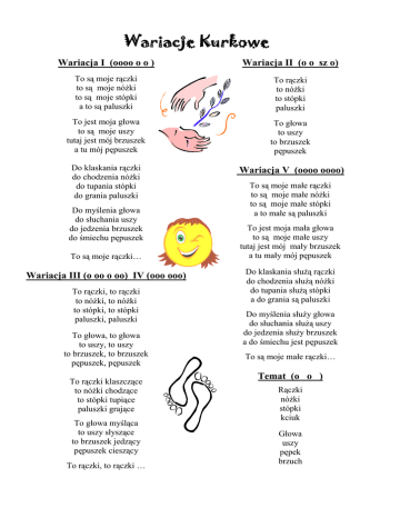 Wariacje Kurkowe Wariacja I (oooo o o ) Wariacja II (o o sz o) To są moje rączki to są moje nóŜki to są moje stópki a to są paluszki To rączki to nóŜki to stópki paluszki To jest moja głowa to są moje uszy tutaj jest mój brzuszek a tu mój pępuszek To głowa to uszy to brzuszek pępuszek Do klaskania rączki do chodzenia nóŜki do tupania stópki do grania paluszki Wariacja V (oooo oooo) Do myślenia głowa do słuchania uszy do jedzenia brzuszek do śmiechu pępuszek To są moje rączki… Wariacja III (o oo o oo) IV (ooo ooo) To rączki, to rączki to nóŜki, to nóŜki to stópki, to stópki paluszki, paluszki To głowa, to głowa to uszy, to uszy to brzuszek, to brzuszek pępuszek, pępuszek To rączki klaszczące to nóŜki chodzące to stópki tupiące paluszki grające To głowa myśląca to uszy słyszące to brzuszek jedzący pępuszek cieszący To rączki, to rączki … To są moje małe rączki to są moje małe nóŜki to są moje małe stópki a to małe są paluszki To jest moja mała głowa to są moje małe uszy tutaj jest mój mały brzuszek a tu mały mój pępuszek Do klaskania słuŜą rączki do chodzenia słuŜą nóŜki do tupania słuŜą stópki a do grania są paluszki Do myślenia słuŜy głowa do słuchania słuŜą uszy do jedzenia słuŜy brzuszek a do śmiechu jest pępuszek To są moje małe rączki… Temat (o o ) Rączki nóŜki stópki kciuk Głowa uszy pępek brzuch