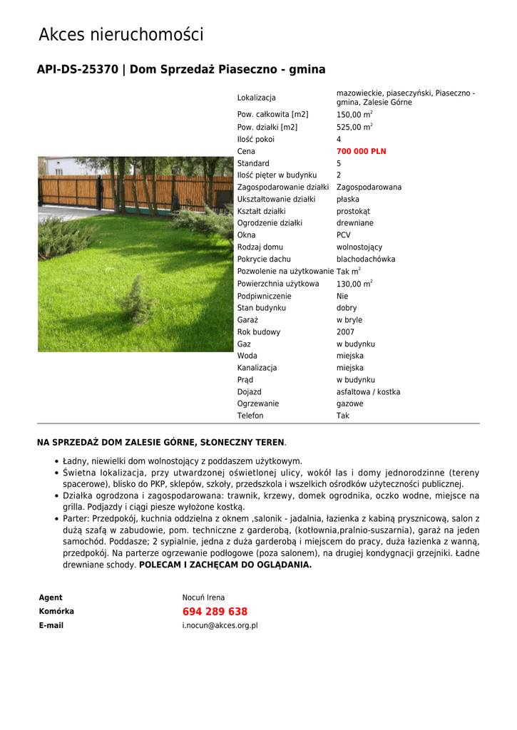 Akces nieruchomości API-DS-25370 | Dom Sprzedaż Piaseczno - gmina Lokalizacja mazowieckie, piaseczyński, Piaseczno gmina, Zalesie Górne Pow. całkowita [m2] 150,00 m2 Pow. działki [m2] 525,00 m2 Ilość pokoi 4 Cena 700 000 PLN Standard 5 Ilość pięter w budynku 2 Zagospodarowanie działki Zagospodarowana Ukształtowanie działki płaska Kształt działki prostokąt Ogrodzenie działki drewniane Okna PCV Rodzaj domu wolnostojący Pokrycie dachu blachodachówka Pozwolenie na użytkowanie Tak m2 2 Powierzchnia użytkowa 130,00 m Podpiwniczenie Nie Stan budynku dobry Garaż w bryle Rok budowy 2007 Gaz w budynku Woda miejska Kanalizacja miejska Prąd w budynku Dojazd asfaltowa / kostka Ogrzewanie gazowe Telefon Tak NA SPRZEDAŻ DOM ZALESIE GÓRNE, SŁONECZNY TEREN. Ładny, niewielki dom wolnostojący z poddaszem użytkowym. Świetna lokalizacja, przy utwardzonej oświetlonej ulicy, wokół las i domy jednorodzinne (tereny spacerowe), blisko do PKP, sklepów, szkoły, przedszkola i wszelkich ośrodków użyteczności publicznej. Działka ogrodzona i zagospodarowana: trawnik, krzewy, domek ogrodnika, oczko wodne, miejsce na grilla. Podjazdy i ciągi piesze wyłożone kostką. Parter: Przedpokój, kuchnia oddzielna z oknem ,salonik - jadalnia, łazienka z kabiną prysznicową, salon z dużą szafą w zabudowie, pom. techniczne z garderobą, (kotłownia,pralnio-suszarnia), garaż na jeden samochód. Poddasze; 2 sypialnie, jedna z duża garderobą i miejscem do pracy, duża łazienka z wanną, przedpokój. Na parterze ogrzewanie podłogowe (poza salonem), na drugiej kondygnacji grzejniki. Ładne drewniane schody. POLECAM I ZACHĘCAM DO OGLĄDANIA. Agent Nocuń Irena Komórka 694 289 638 E-mail [email protected]