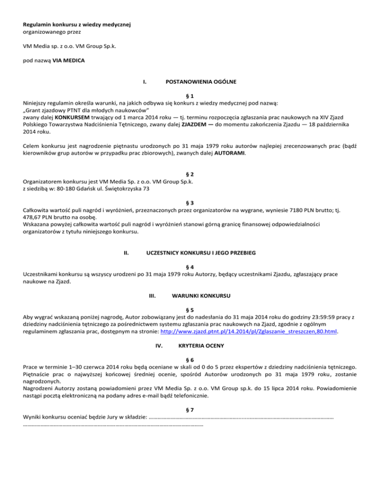 Regulamin konkursu z wiedzy medycznej organizowanego przez VM Media sp. z o.o. VM Group Sp.k. pod nazwą VIA MEDICA I. POSTANOWIENIA OGÓLNE §1 Niniejszy regulamin określa warunki, na jakich odbywa się konkurs z wiedzy medycznej pod nazwą: „Grant zjazdowy PTNT dla młodych naukowców” zwany dalej KONKURSEM trwający od 1 marca 2014 roku — tj. terminu rozpoczęcia zgłaszania prac naukowych na XIV Zjazd Polskiego Towarzystwa Nadciśnienia Tętniczego, zwany dalej ZJAZDEM — do momentu zakończenia Zjazdu — 18 października 2014 roku. Celem konkursu jest nagrodzenie piętnastu urodzonych po 31 maja 1979 roku autorów najlepiej zrecenzowanych prac (bądź kierowników grup autorów w przypadku prac zbiorowych), zwanych dalej AUTORAMI. §2 Organizatorem konkursu jest VM Media Sp. z o.o. VM Group Sp.k. z siedzibą w: 80-180 Gdańsk ul. Świętokrzyska 73 §3 Całkowita wartość puli nagród i wyróżnień, przeznaczonych przez organizatorów na wygrane, wyniesie 7180 PLN brutto; tj. 478,67 PLN brutto na osobę. Wskazana powyżej całkowita wartość puli nagród i wyróżnień stanowi górną granicę finansowej odpowiedzialności organizatorów z tytułu niniejszego konkursu. II. UCZESTNICY KONKURSU I JEGO PRZEBIEG §4 Uczestnikami konkursu są wszyscy urodzeni po 31 maja 1979 roku Autorzy, będący uczestnikami Zjazdu, zgłaszający prace naukowe na Zjazd. III. WARUNKI KONKURSU §5 Aby wygrać wskazaną poniżej nagrodę, Autor zobowiązany jest do nadesłania do 31 maja 2014 roku do godziny 23:59:59 pracy z dziedziny nadciśnienia tętniczego za pośrednictwem systemu zgłaszania prac naukowych na Zjazd, zgodnie z ogólnym regulaminem zgłaszania prac, dostępnym na stronie: http://www.zjazd.ptnt.pl/14.2014/pl/Zglaszanie_streszczen,80.html. IV. KRYTERIA OCENY §6 Prace w terminie 1–30 czerwca 2014 roku będą oceniane w skali od 0 do 5 przez ekspertów z dziedziny nadciśnienia tętniczego. Piętnaście prac o najwyższej końcowej średniej ocenie, spośród Autorów urodzonych po 31 maja 1979 roku, zostanie nagrodzonych. Nagrodzeni Autorzy zostaną powiadomieni przez VM Media Sp. z o.o. VM Group sp.k. do 15 lipca 2014 roku. Powiadomienie nastąpi pocztą elektroniczną na podany adres e-mail bądź telefonicznie. §7 Wyniki konkursu oceniać będzie Jury w składzie: ……………………………………………………...........……………………………………………… …………………………………………………………………………………………………………… V. NAGRODY §8 Nagrodami w konkursie, przyznawanymi przez Jury, jest 15 dwudniowych pobytów w hotelu BEST WESTERN Villa Aqua Hotel w Sopocie przy ul. Zamkowa Góra 35, w pokoju jednoosobowym ze śniadaniem, na czas trwania Zjazdu, tj. 16–18 października 2014 roku. §9 Regulamin w jego pełnym brzmieniu będzie dostępny do wglądu dla uczestników konkursu pod adresem organizatorów, wskazanym w § 2 niniejszego regulaminu oraz na stronie internetowej www.zjazd.ptnt.pl. VI. POSTĘPOWANIE REKLAMACYJNE § 10 1. Wszelkie reklamacje z tytułu organizowanego konkursu, które mogą być wnoszone przez jego uczestników, powinny być składane organizatorom na piśmie, pod adresem wskazanym w § 2 do dnia 31 lipca 2014 roku. 2. Organizatorzy w terminie 30 (trzydziestu) dni od otrzymania reklamacji rozpatrzą zgłoszoną reklamację i pisemnie poinformują zgłaszającego o zajętym stanowisku. W przypadku braku akceptacji przez uczestnika konkursu stanowiska organizatorów, o którym mowa w ust. 2 powyżej, uczestnik może dochodzić swych praw na zasadach ogólnych
