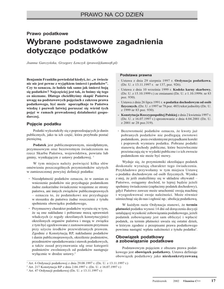 PRAWO NA CO DZIEÑ Prawo podatkowe Wybrane podstawowe zagadnienia dotycz¹ce podatków Joanna Garczyñska, Grzegorz £enczyk ([email protected]) Benjamin Franklin powiedzia³ kiedy, ¿e: w wiecie nic nie jest pewne z wyj¹tkiem mierci i podatków. Czy to oznacza, ¿e ludzie tak samo jak mierci boj¹ siê podatków? Najczêciej jest tak, ¿e boimy siê tego co nieznane. Dlatego chcielibymy skupiæ Pañstwa uwagê na podstawowych pojêciach z zakresu prawa podatkowego, byæ mo¿e uporz¹dkuje to Pañstwa wiedzê i pozwoli ³atwiej poruszaæ siê wród tych pojêæ w ramach prowadzonej dzia³alnoci gospodarczej. Pojêcie podatku Podatki wykszta³ci³y siê z poprzedzaj¹cych je danin publicznych, jako ta ich czêæ, która przybra³a postaæ pieniê¿n¹. Podatek jest publicznoprawnym, nieodp³atnym, przymusowym oraz bezzwrotnym wiadczeniem na rzecz Skarbu Pañstwa, województwa, powiatu lub gminy, wynikaj¹cym z ustawy podatkowej. 1 W tym miejscu nale¿y powiêciæ kilka s³ów omówieniu poszczególnych przymiotników u¿ytych w zamieszczonej powy¿ej definicji podatku: · Nieodp³atnoæ podatków oznacza, ¿e w zamian za wniesienie podatków nie przys³uguje podatnikom ¿adne zaskar¿alne wiadczenie wzajemne ze strony pañstwa, ani innych zwi¹zków publicznoprawnych oznacza to, ¿e podatnikowi nie przys³uguje w stosunku do pañstwa ¿adne roszczenie z tytu³u spe³nienia obowi¹zku podatkowego, · Przymusowy charakter podatków wyra¿a siê w tym, ¿e s¹ one nak³adane i pobierane moc¹ uprawnieñ w³adczych (z regu³y okrelanych konstytucyjnie) okrelonych organów pañstwa i mog¹ w zwi¹zku z tym byæ egzekwowane z zastosowaniem przymusu przy u¿yciu rodków przewidzianych prawem. Zgodnie z Konstytucj¹ RP, nak³adanie podatków i danin publicznoprawnych, okrelenie podmiotów, przedmiotów opodatkowania i stawek podatkowych, a tak¿e zasad przyznawania ulg oraz kategorii podmiotów zwolnionych od podatków nastêpuje wy³¹cznie w drodze ustawy.2 Podstawa prawna - Ustawa z dnia 29 sierpnia 1997 r. Ordynacja podatkowa. (Dz. U. z 13.11.1997 r. nr 137, poz. 926). - Ustawa z dnia 10 wrzenia 1999 r. Kodeks karny skarbowy. (Dz. U. z 15.10.1999 r.) ze zmianami (Dz. U. z 1.10.1999r. nr 83 poz. 930). - Ustawa z dnia 26 lipca 1991 r. o podatku dochodowym od osób fizycznych. (Dz. U. z 1997 nr 78 poz. 483) tekst jednolity (Dz. U. z 1999 nr 83 poz. 930). - Konstytucja Rzeczypospolitej Polskiej z dnia 2 kwietnia 1997 r. (Dz. U. z 16.07.1997 r.) sprostowanie z dnia 4.04.2001 (Dz. U. z 2001 nr 28 poz.319). · Bezzwrotnoæ podatków oznacza, ¿e kwoty ju¿ pobranych podatków nie podlegaj¹ zwrotowi podatnikom, poza ewidentnymi przypadkami korekt i poprawek wymiaru podatku. Pobrane podatki stanowi¹ dochody publiczne, które bezzw³ocznie przeistaczaj¹ siê w wydatki publiczne i o ich zwrocie podatnikom nie mo¿e byæ mowy. Wydaje siê, ¿e przymiotniki okrelaj¹ce podatek doskonale wyra¿aj¹ charakter tego wiadczenia. Przyk³adowo przywo³amy w tym miejscu Ustawê o podatku dochodowym od osób fizycznych. Wynika z niej, ¿e jeli znalelimy siê w uk³adzie obywatel Pañstwo, osi¹gamy dochód, to lepiej bêdzie je¿eli spe³nimy wiadczenie (zap³acimy podatek dochodowy), gdy¿ Pañstwo zawsze mo¿e uruchomiæ swoj¹ machinê i wyegzekwowaæ swoje nale¿noci. Mo¿e równie¿ umiechn¹æ siê do nas i og³osiæ np.: abolicjê podatkow¹. W ka¿dym razie Ordynacja stanowi, ¿e termin p³atnoci podatku wynosi 14 dni od dorêczenia decyzji ustalaj¹cej wysokoæ zobowi¹zania podatkowego, je¿eli podatnik zobowi¹zany jest sam obliczyæ i wp³aciæ podatek, za termin p³atnoci uwa¿a siê ostatni dzieñ, w którym zgodnie z przepisami prawa podatkowego powinna nast¹piæ wp³ata nale¿noci z tytu³u podatku3. Obowi¹zek podatkowy a zobowi¹zanie podatkowe Podstawowym pojêciem z obszaru prawa podatkowego jest obowi¹zek podatkowy. Ustawa definiuje obowi¹zek podatkowy jako nieskonkretyzowan¹ Art. 6 Ordynacji podatkowej z dnia 29.08.1997 r. (Dz. U. z 13.11.1997 r.) Art. 217 Konstytucja RP z dnia 2.04.1997 r. (Dz. U. z 16.07.1997 r.) 3 Art. 47 Ordynacji podatkowej (Dz. U. z 13.11.1997 r.) 1 2 Padziernik 2002 Vitamina C++ 17 PRAWO NA CO DZIEÑ powinnoæ ponoszenia przymusowego wiadczenia pieniê¿nego, w zwi¹zku z zaistnieniem zdarzenia okrelonego w ustawie.4 W ka¿dym przypadku zakres podmiotowy (czyli kto), zakres przedmiotowy (co), moment powstania obowi¹zku oraz stawki okrelaj¹ szczegó³owe przepisy konkretnej ustawy podatkowej. Jako przyk³ad ponownie przytoczymy ustawê o podatku dochodowym od osób fizycznych. Zgodnie z ni¹ (w najwiêkszym uproszczeniu), jeli jestemy obywatelami Rzeczpospolitej z miejscem zamieszkania na jej terytorium, osi¹gamy dochód, to zobowi¹zani jestemy do zap³acenia podatku dochodowego od ca³oci swoich dochodów bez wzglêdu na miejsce po³o¿enia róde³ przychodu (w kraju lub poza granicami).5 Na mocy tej ustawy obowi¹zek podatkowy ogólny i abstrakcyjny dotyczy ka¿dego podatnika spe³niaj¹cego opisane kryteria. cile zwi¹zane z obowi¹zkiem podatkowym jest zobowi¹zanie podatkowe. Z abstrakcyjnego obowi¹zku podatkowego wynika bowiem zobowi¹zanie do zap³aty na rzecz Skarbu Pañstwa, województwa, powiatu lub gminy podatku w wysokoci, w terminie oraz miejscu okrelonym w przepisach prawa podatkowego6. Powstanie i wyganiêcie zobowi¹zania podatkowego Zobowi¹zanie podatkowe powstaje z dniem zaistnienia zdarzenia, z którym ustawa wi¹¿e powstanie takiego zobowi¹zania lub z dniem dorêczenia decyzji organu okrelaj¹cej wysokoæ tego zobowi¹zania. Obowi¹zek podatkowy pozostaje tak d³ugo abstrakcyjnym zobowi¹zaniem do ponoszenia ciê¿aru podatkowego dopóki nie przekszta³ci siê w zobowi¹zanie podatkowe konkretnego podatnika. Upraszczaj¹c mo¿na powiedzieæ, ¿e zobowi¹zanie podatkowe powstaje wówczas, gdy skonkretyzowana zostanie kwota podatku nale¿nego od danego konkretnego podatnika wraz z terminem zap³aty i wskazaniem rachunku, na jaki ta zap