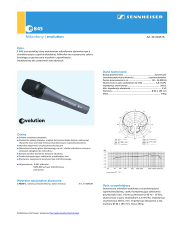 Mikrofony | evolution Art.-Nr 004515 Opis E 845 jest wysokiej klasy wokalowym mikrofonem dynamicznym o charakterystyce superkardioidalnej. Mikrofon ma rozszerzony zakres liniowego przetwarzania wysokich częstotliwości. Dedykowany do zastosowań estradowych. Dane techniczne Rodzaj przetwornika .................................................. dynamiczny Charakterystyka kierunkowości ....................... superkardioidalna Pasmo przenoszenia m.cz. .................................... 40 – 16 000 Hz Skuteczność w polu swobodnym (1 KHz) .................... 1,8 mV/Pa Impedancja znamionowa ................................................... 350 Ω Min. impedancja obciążenia ................................................. 1 kΩ Wymiary ............................................................... Ø 46 x 185 mm Masa .................................................................................... 330 g ° 30° 30° 5 10 60° 60° 15 20 25 90° dB 90° 120° 120° Cechy ■ Solidna metalowa obudowa ■ Znakomita jakość dźwięku, miękkie brzmienie dzięki dużemu zakresowi dynamiki oraz szerokiej liniowej charakterystyce częstotliwościowej ■ Wysoka odporność na sprzężenia akustyczne ■ Niezmienna barwa głosu kierowanego w osi i z boku mikrofonu oraz przy zmianach odległości do mikrofonu ■ Bardzo wysokie tłumienie hałasów obudowy ■ Cewka kompensująca zakłócenia przydźwięku sieci ■ Elastyczne zawieszenie przetwornika mikrofonowego ■ Wyposażenie: E 845 mikrofon MZQ 800 uchwyt mikrofonowy pokrowiec 150° 150° 125 250 500 1000 180° Hz Hz Hz Hz 2000 4000 8000 16000 Hz Hz Hz Hz dBv - 40 - 50 - 60 - 70 - 80 - 90 20 50 100 200 500 1000 2000 5000 10000 20000 Hz 0°, 1 m Wybrane opcjonalne akcesoria ■ MZW 1 osłona przeciwwietrzna, kolor antracyt Art. nr 004839 Opis uzupełniający Dynamiczny mikrofon wokalowy o charakterystyce superkardioidalnej, cewka kompensująca zakłócenia przydźwięku sieci. Pasmo przenoszenia 40 Hz - 16 kHz, skuteczność w polu swobodnym 1,8 mV/Pa, impedancja znamionowa 350 Ω, min. impedancja obciążenia 1 kΩ, wymiary Ø 46 x 185 mm, masa 330 g. Dodatkowe informacje i akcesoria http://aplauzaudio.pl/sennheiser
