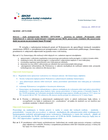 Wydział Marketingu i Umów Gdynia dn. 2009-05-04 SKMMU -ZP/N/19/09 dotyczy : znak postępowania SKMMU- ZP/N/19/09 - przetarg na zadanie „Wykonanie robót budowlanych w zakresie modernizacji i remontu peronu SKM, poszerzenia wiaduktu dla poszerzenia dojść na peron na przystanek Sopot Wyścigi” W związku z wpłynięciem kolejnych pytań od Wykonawców do specyfikacji istotnych warunków zamówienia (SIWZ) w przedmiotowym postępowaniu o udzielenie zamówienia publicznego, Zamawiający przedstawia w załączeniu odpowiedzi na pytania wraz z ich treścią. Pyt. nr 1. Czy Zamawiający dla realizacji robót objętych ww. zadaniem zapewni nieodpłatnie: a. b. c. d. e. opracowanie i wdroŜenie regulaminu tymczasowego prowadzenia ruchu pociągów w trakcie trwania robót; zamknięcia torów dla ruchu pociągów z wyłączeniem i załączeniem napięcia w sieci trakcyjnej; ewentualną regulację (sprawdzenie) sieci trakcyjnej po robotach; demontaŜ na czas robót i odtworzenie po robotach sieci powrotnej prądu trakcyjnego; udostępnienie infrastruktury dla Wykonawcy w zakresie niezbędnym do realizacji zadania (min. przejazdy technologiczne; tory odstawcze dla maszyn itp.) Odpowiedź Zamawiającego Ad. a - Regulamin moŜe opracować wykonawca we własnym zakresie lub Zamawiajacy odpłatnie; b – Koszty wyłączenia napięcia ponosi Wykonawca a planowanych zamknięć Zamawiajacy; c - przy planowanym zakresie robót torowych naleŜy przewidzieć sprawdzenie sieci trakcyjnej po wykonaniu robót; d - wykonuje Wykonawca i uwzględnia w kosztorysie ofertowym; e - Zamawiajacy nie dysponuje infrastrukturą w zakresie niezbędnym do wykonania robót stąd naleŜy przewidzieć utrudnienia z tytułu małego placu budowy który mozna przewidzieć w końcu peronu w kierunku Sopotu. W km 10.650 proponuje się wykonanie przejazdu technologicznego poprzez działkę prywatną nr 121/1 przez tor 501 na peron lub tor 502. Tor odstawczy dla maszyn moŜna przyjąć tor odstawczy nr 13 stacja Sopot. Pyt. nr 2. Prosimy o informację o planowanych zamknięciach torów w jakich realizowane będą roboty; w szczególności czy będą to zamknięcia tzw. „weekendowe” od piątku do niedzieli czy teŜ moŜliwe jest uzyskanie zamknięć w dniach roboczych? Odpowiedź Zamawiającego : Przewiduje się zamknięcia w formie przerw w ruchu w czasie dni wolnych (sobota – niedziela – poniedziałek) i nocnej (dni powszednie), w zakresie niezbędnym dla zabezpieczenia robót wynikających z harmonogramu realizacji sporządzonego przez wykonawcę. Zamknięcia w czasie dni wolnych – piątek od 22:00 do poniedziałku do 04:00; zamknięcia nocne od 22:00 do 04:00. Zamkniecia dotyczyc będą toru nr 501 i 502 odpowiednio i zgodnie z do harmonogramem robót. Pyt. nr 3. W przedmiarze robót branŜy architektoniczno- budowlanej nie została ujęta pozycja związana z utylizacją papy odpadowej z rozbiórki. Prosimy o uzupełnienie przedmiaru robót lub wskazanie pozycji, w której ma być ujęty ww. koszt utylizacji. Odpowiedź Zamawiającego : Koszty utylizacji naleŜy uwzględnić w pozycji nr 1.1.9 « inne » w ilości 3x79,46 m2. Pyt. nr 4. Prosimy o ostateczne i jednoznaczne określenie wymagań dotyczących koloru kostki na nawierzchnię peronu. W projekcie (w części opisowej i rysunkowej) występują sprzeczne informacje. Prosimy równieŜ o informację czy ww. kostka ma być impregnowana? Odpowiedź Zamawiającego : Przewidziano nawierzchnie z kostki granitowej 8x8x10 cm, groszkowanej, obrobionej płomieniowo, impregnowanej. Wstępnie ustalono kolor brunatny ostatecznie kolor wybierze Konserwator Zabytków Miasta Sopotu po okazaniu próbek. NaleŜy przewidzieć płyty krawędziowe barwione, barwę dobierze Konserwator Zabytków Miasta Sopotu po przedstawieniu dostępnych propozycji. Pyt. nr 5. Prosimy o uszczegółowienie informacji na temat mozaiki ściennej co do techniki wykonania, rodzaju mozaiki oraz materiału z jakiego na zostać wykonana. Odpowiedź Zamawiającego : NaleŜy przewidzieć tematykę związaną z otoczeniem (wyscigi konne), w formie malowidła, mozajki z naturalnej ceramiki barwnej lub sgraffitta. Konserwator wymaga aŜeby dziełu nadał artystyczną formę artysta plastyk. Pyt. nr 6. W punkcie 4 w opisie do projektu załoŜono, Ŝe przed rozpoczęciem budowy ścianek peronowych konieczne będzie dodatkowo wyregulowanie torów nr 501 i 502 w planie i profilu, natomiast w przedmiarze robót takiej pozycji nie uwzględniono. Prosimy o uzupełnienie przedmiaru robót lub sprecyzowanie w której pozycji naleŜy ująć koszt ww. robót. Odpowiedź Zamawiającego : Regulacja torów 501 i 502 nastąpi po wymianie nawierzchni kolejowej. Roboty zostały uwzględnione w pozycjach od 51 do 56 przedmiaru branŜy torowej. Pyt. nr 7. W rozdziale III SIWZ we wzorze formularza oferty w punkcie 14 Zamawiający wymaga od Wykonawcy złoŜenia oświadczenia, iŜ wyznaczy on do kierowania robotami kierowników branŜowych, m.in. konserwatora zabytków. Po dokładnym przeanalizowaniu projektu wykonawczego i przedmiarów Wykonawca nie znalazł robót objętych ochroną konserwatorską. Prosimy o wskazanie ww. robót lub wykreślenie konserwatora zabytków z formularza ofertowego. Odpowiedź Zamawiającego : Peron SKM Sopotu Wyścigi znajduje się na terenie objętym ochroną konserwatorską z tytułu historycznej zabudowy stad dobrze by było gdyby dorywczo wykonawca posiadał dostęp lub dysponował osobą zorientowana w tematyce ochrony zabytków a takŜe plastycznym wystroju elewacji i konstrukcji (mozaiki prace malarskie i zdobnicze, markowanie konstrukcji nitowanych).