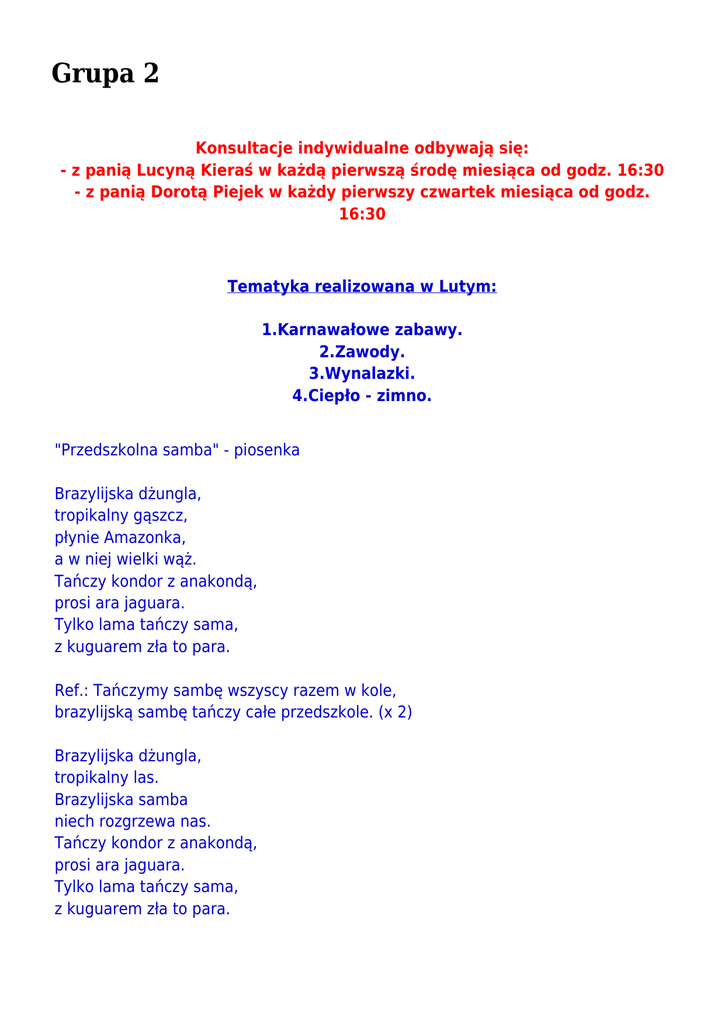 Grupa 2 Konsultacje indywidualne odbywają się: - z panią Lucyną Kieraś w każdą pierwszą środę miesiąca od godz. 16:30 - z panią Dorotą Piejek w każdy pierwszy czwartek miesiąca od godz. 16:30 Tematyka realizowana w Lutym: 1.Karnawałowe zabawy. 2.Zawody. 3.Wynalazki. 4.Ciepło - zimno. "Przedszkolna samba" - piosenka Brazylijska dżungla, tropikalny gąszcz, płynie Amazonka, a w niej wielki wąż. Tańczy kondor z anakondą, prosi ara jaguara. Tylko lama tańczy sama, z kuguarem zła to para. Ref.: Tańczymy sambę wszyscy razem w kole, brazylijską sambę tańczy całe przedszkole. (x 2) Brazylijska dżungla, tropikalny las. Brazylijska samba niech rozgrzewa nas. Tańczy kondor z anakondą, prosi ara jaguara. Tylko lama tańczy sama, z kuguarem zła to para. "Karnawał" - wiersz W karnawale same bale: koty w nowych futerkach na dachach tańczą oberka. Pląsają psy w szalikach, koń na biegunach bryka, a wystrojone wrony czeszą ogony. Wróble próbują śpiewać, radośnie szumią drzewa, skaczą zające po polu, a dzieci skaczą - w przedszkolu.