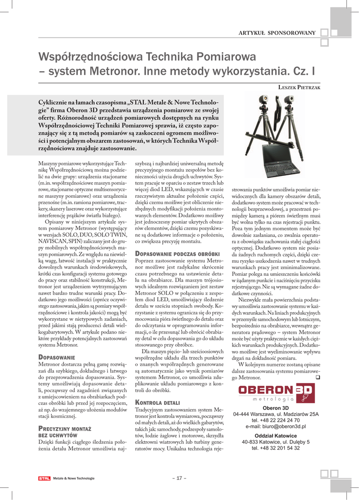 ARTYKUŁ SPONSOROWANY Współrzędnościowa Technika Pomiarowa – system Metronor. Inne metody wykorzystania. Cz. I LESZEK PIETRZAK Cyklicznie na łamach czasopisma „STAL Metale & Nowe Technologie” firma Oberon 3D przedstawia urządzenia pomiarowe ze swojej oferty. Różnorodność urządzeń pomiarowych dostępnych na rynku Współrzędnościowej Techniki Pomiarowej sprawia, iż często zapoznający się z tą metodą pomiarów są zaskoczeni ogromem możliwości i potencjalnym obszarem zastosowań, w których Technika Współrzędnościowa znajduje zastosowanie. Maszyny pomiarowe wykorzystujące Technikę Współrzędnościową można podzielić na dwie grupy: urządzenia stacjonarne (m.in. współrzędnościowe maszyn pomiarowe, stacjonarne optyczne multisensoryczne maszyny pomiarowe) oraz urządzenia przenośne (m.in. ramiona pomiarowe, trackery, skanery laserowe oraz wykorzystujące interferencję prążków światła białego). Opisany w niniejszym artykule system pomiarowy Metronor (występujący w wersjach SOLO, DUO, SOLO TWIN, NAVISCAN, SPIN) zaliczany jest do grupy mobilnych współrzędnościowych maszyn pomiarowych. Ze względu na niewielką wagę, łatwość instalacji w praktycznie dowolnych warunkach środowiskowych, krótki czas konfiguracji systemu gotowego do pracy oraz stabilność konstrukcji, Metronor jest urządzeniem wytrzymującym nawet bardzo trudne warunki pracy. Dodatkowo jego możliwości (oprócz oczywistego zastosowania, jakim są pomiary współrzędnościowe i kontrola jakości) mogą być wykorzystane w nietypowych zadaniach, przed jakimi stają producenci detali wielkogabarytowych. W artykule podano niektóre przykłady potencjalnych zastosowań systemu Metronor. DOPASOWANIE Metronor dostarcza pełną gamę rozwiązań dla szybkiego, dokładnego i łatwego do przeprowadzenia dopasowania. Systemy umożliwiają dopasowanie detali, począwszy od zagadnień związanych z umiejscowieniem na obrabiarkach podczas obróbki lub przed jej rozpoczęciem, aż np. do wzajemnego ułożenia modułów stacji kosmicznej. PRECYZYJNY MONTAŻ BEZ UCHWYTÓW Dzięki funkcji ciągłego śledzenia położenia detalu Metronor umożliwia naj- Metale & Nowe Technologie szybszą i najbardziej uniwersalną metodę precyzyjnego montażu zespołów bez konieczności użycia drogich uchwytów. System pracuje w oparciu o zestaw trzech lub więcej diod LED, wskazujących w czasie rzeczywistym aktualne położenie części, dzięki czemu możliwe jest obliczenie niezbędnych modyfikacji położenia montowanych elementów. Dodatkowo możliwy jest jednoczesny pomiar ukrytych obszarów elementów, dzięki czemu pozyskiwane są dodatkowe informacje o położeniu, co zwiększa precyzję montażu. DOPASOWANIE PODCZAS OBRÓBKI Poprzez zastosowanie systemu Metronor możliwe jest radykalne skrócenie czasu potrzebnego na ustawienie detalu na obrabiarce. Dla maszyn trójosiowych idealnym rozwiązaniem jest zestaw Metronor SOLO w połączeniu z zespołem diod LED, umożliwiający śledzenie detalu w sześciu stopniach swobody. Korzystanie z systemu ogranicza się do przymocowania pióra świetlnego do detalu oraz do odczytania w oprogramowaniu informacji, o ile przesunąć lub obrócić obrabiany detal w celu dopasowania go do układu stosowanego przy obróbce. Dla maszyn pięcio- lub sześcioosiowych współrzędne układu dla trzech punktów o znanych współrzędnych generowane są automatycznie jako wynik pomiarów systemem Metronor, co umożliwia zduplikowanie układu pomiarowego z kontroli do obróbki. KONTROLA DETALI Tradycyjnym zastosowaniem system Metronor jest kontrola wymiarowa, począwszy od małych detali, aż do wielkich gabarytów, takich jak: samochody, podzespoły samolotów, łodzie żaglowe i motorowe, skrzydła elektrowni wiatrowych lub turbiny generatorów mocy. Unikalna technologia reje- – 17 – strowania punktów umożliwia pomiar niewidocznych dla kamery obszarów detali, dodatkowo system może pracować w technologii bezprzewodowej, a przestrzeń pomiędzy kamerą a piórem świetlnym musi być wolna tylko na czas rejestracji punktu. Poza tym jednym momentem może być dowolnie zasłaniana, co zwalnia operatora z obowiązku zachowania stałej ciągłości optycznej. Dodatkowo system nie posiada żadnych ruchomych części, dzięki czemu ryzyko uszkodzenia nawet w trudnych warunkach pracy jest zminimalizowane. Pomiar polega na umieszczeniu końcówki w żądanym punkcie i naciśnięciu przycisku rejestrującego. Nie są wymagane żadne dodatkowe czynności. Niezwykle mała powierzchnia podstawy umożliwia zastosowanie systemu w każdych warunkach. Na liniach produkcyjnych w przemyśle samochodowym lub lotniczym, bezpośrednio na obrabiarce, wewnątrz generatora prądowego – system Metronor może być użyty praktycznie w każdych ciężkich warunkach produkcyjnych. Dodatkowo możliwe jest wyeliminowanie wpływu drgań na dokładność pomiaru. W kolejnym numerze zostaną opisane dalsze zastosowania systemu pomiarowego Metronor. Oberon 3D 04-444 Warszawa, ul. Madziarów 25A tel. +48 22 224 24 70 e-mail: [email protected] Oddział Katowice 40-833 Katowice, ul. Dulęby 5 tel. +48 32 201 54 32