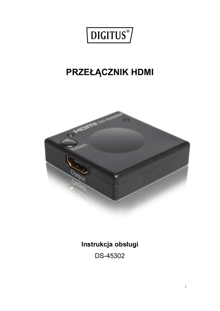 PRZEŁĄCZNIK HDMI Instrukcja obsługi DS-45302 1 Spis treści 1.0 Wstęp..................................................................................... 3 2.0 Właściwości .......................................................................... 3 3.0 Specyfikacje .......................................................................... 4 4.0 Zawartość opakowania ........................................................ 4 5.0 Opis paneli ............................................................................ 5 6.0 Podłączanie i obsługa .......................................................... 5 2 1.0 Wstęp Mini wzmacniacz i przełącznik sygnału HDMI został wyposażony w funkcję przełączania przyciskowego oraz przełączania inteligentnego. Urządzenie obsługuje sygnał wideo w wysokiej rozdzielczości (do 1080p) i cyfrowy sygnał audio, przesyłając sygnały z jednego z dwóch źródeł do urządzenia wyświetlającego. Źródła sygnału wideo w wysokiej rozdzielczości mogą być jednocześnie podłączone do obu wejść przełącznika. Ponadto, urządzenie jest zgodne ze standardem HD-DVD, Sky STB, oraz obsługuje konsole PlayStation, Xbox itp. 1. Funkcja inteligentnego przełączania 1> Umożliwia automatyczne wyświetlanie ostatnio aktywowanego źródła sygnału wideo. 2> Jeśli urządzenie źródłowe jest wyłączone lub odłączone, kolejne aktywowane źródło sygnału wideo zostanie automatycznie wyświetlone. Uwaga: Funkcja automatycznego przełączania może nie zadziałać, jeśli zamiast wyłączenia się urządzenie źródłowe przejdzie w stan czuwania. 2.0 Właściwości Wielofunkcyjne przełączanie: inteligentne lub przyciskowe Obsługa rozdzielczości 1080p Wysoka wydajność do 2,5 Gbps. Obsługa barw o głębi 12 bitów na kanał (36 bitów na wszystkie kanały). Zgodność ze standardem HDCP Zgodność ze standardem CEC Obsługa nieskompresowanego dźwięku audio, np. LPCM. Obsługa skompresowanego dźwięku audio, np.: DTS Digital, Dolby Digital (w tym DTS-HD i Dolby True HD). *Obsługa technologii 3D. 3 3.0 Specyfikacje Sygnał wejściowy DDC Maksymalna rozdzielczość łącza Wyjście wideo Zakres częstotliwości pionowej Przepustowość wzmacniacza sygnału wideo Rozdzielczości z przeplotem (50 i 60 Hz) Rozdzielczości bez przeplotu (50 i 60 Hz) Temperatura pracy Wilgotność w miejscu pracy Temperatura przechowywania Wilgotność przechowywania Zewnętrzne źródło energii Pobór mocy (Maks.) Instrukcja użytkowania 5 woltów p-p (TTL) 1920 x 1080 Sygnał HDMI 50/60 Hz 2,5 Gbps/250 MHz 480i, 576i, 1080i 480p, 576p, 720p, 1080p, 0 °C do +70 °C 10% do 85% wilg. wzgl. (bez kondensacji) -10 °C do +80 °C 5% do 90% wilg. wzgl. (bez kondensacji) Kabel zasilający USB 5W Instrukcja w 10 językach Uwaga: 1) Specyfikacje mogą ulec zmianie bez konieczności powiadamiania. 2) Podczas korzystania z przełącznika i konsoli PlayStation należy jednocześnie podłączyć dwa urządzenia wejściowe. 4.0 Zawartość opakowania 1) Jednostka główna. 2) Instrukcja użytkowania 4 5.0 Opis paneli 6.0 Podłączanie i obsługa 1) Podłącz urządzenie wejściowe HDMI do przełącznika HDMI. Zajrzyj do rozdziału zawierającego schemat podłączenia 2) Wciśnij przycisk „Select”, aby wybrać urządzenie źródłowe Uwaga: Przewód należy podłączać/odłączać z zachowaniem ostrożności 6.1. Schemat połączeń Przewód HDMI Przewód HDMI 5