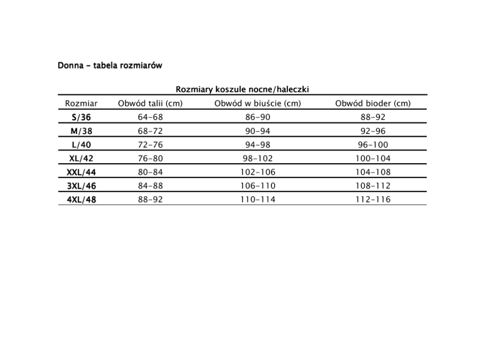 Donna - tabela rozmiarów Rozmiary koszule nocne/haleczki Rozmiar Obwód talii (cm) Obwód w biuście (cm) Obwód bioder (cm) S/36 64-68 86-90 88-92 M/38 68-72 90-94 92-96 L/40 72-76 94-98 96-100 XL/42 76-80 98-102 100-104 XXL/44 80-84 102-106 104-108 3XL/46 84-88 106-110 108-112 4XL/48 88-92 110-114 112-116