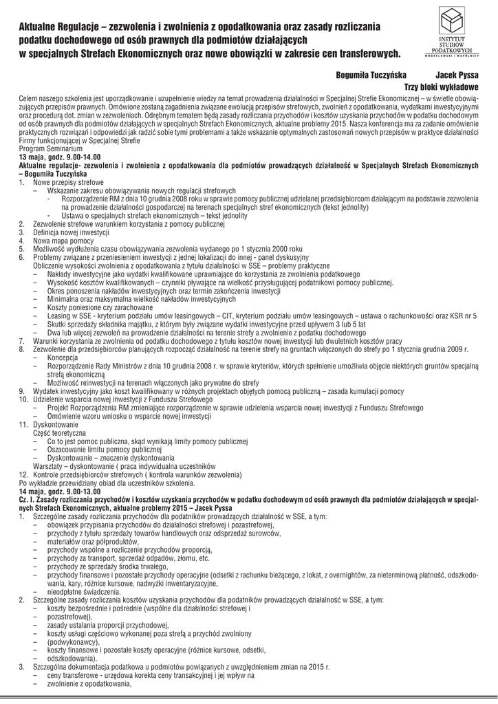 Aktualne Regulacje – zezwolenia i zwolnienia z opodatkowania oraz zasady rozliczania podatku dochodowego od osób prawnych dla podmiotów działających w specjalnych Strefach Ekonomicznych oraz nowe obowiązki w zakresie cen transferowych. Bogumiła Tuczyńska Jacek Pyssa Trzy bloki wykładowe Celem naszego szkolenia jest uporządkowanie i uzupełnienie wiedzy na temat prowadzenia działalności w Specjalnej Strefie Ekonomicznej – w świetle obowiązujących przepisów prawnych. Omówione zostaną zagadnienia związane ewolucją przepisów strefowych, zwolnień z opodatkowania, wydatkami inwestycyjnymi oraz procedurą dot. zmian w zezwoleniach. Odrębnym tematem będą zasady rozliczania przychodów i kosztów uzyskania przychodów w podatku dochodowym od osób prawnych dla podmiotów działających w specjalnych Strefach Ekonomicznych, aktualne problemy 2015. Nasza konferencja ma za zadanie omówienie praktycznych rozwiązań i odpowiedzi jak radzić sobie tymi problemami a także wskazanie optymalnych zastosowań nowych przepisów w praktyce działalności Firmy funkcjonującej w Specjalnej Strefie Program Seminarium 13 maja, godz. 9.00-14.00 Aktualne regulacje- zezwolenia i zwolnienia z opodatkowania dla podmiotów prowadzących działalność w Specjalnych Strefach Ekonomicznych – Bogumiła Tuczyńska 1. Nowe przepisy strefowe – Wskazanie zakresu obowiązywania nowych regulacji strefowych Rozporządzenie RM z dnia 10 grudnia 2008 roku w sprawie pomocy publicznej udzielanej przedsiębiorcom działającym na podstawie zezwolenia na prowadzenie działalności gospodarczej na terenach specjalnych stref ekonomicznych (tekst jednolity) Ustawa o specjalnych strefach ekonomicznych – tekst jednolity 2. Zezwolenie strefowe warunkiem korzystania z pomocy publicznej 3. Definicja nowej inwestycji 4. Nowa mapa pomocy 5. Możliwość wydłużenia czasu obowiązywania zezwolenia wydanego po 1 stycznia 2000 roku 6. Problemy związane z przeniesieniem inwestycji z jednej lokalizacji do innej - panel dyskusyjny Obliczenie wysokości zwolnienia z opodatkowania z tytułu działalności w SSE – problemy praktyczne – Nakłady inwestycyjne jako wydatki kwalifikowane uprawniające do korzystania ze zwolnienia podatkowego – Wysokość kosztów kwalifikowanych – czynniki pływające na wielkość przysługującej podatnikowi pomocy publicznej. – Okres ponoszenia nakładów inwestycyjnych oraz termin zakończenia inwestycji – Minimalna oraz maksymalna wielkość nakładów inwestycyjnych – Koszty poniesione czy zarachowane – Leasing w SSE - kryterium podziału umów leasingowych – CIT, kryterium podziału umów leasingowych – ustawa o rachunkowości oraz KSR nr 5 – Skutki sprzedaży składnika majątku, z którym były związane wydatki inwestycyjne przed upływem 3 lub 5 lat – Dwa lub więcej zezwoleń na prowadzenie działalności na terenie strefy a zwolnienie z podatku dochodowego 7. Warunki korzystania ze zwolnienia od podatku dochodowego z tytułu kosztów nowej inwestycji lub dwuletnich kosztów pracy 8. Zezwolenie dla przedsiębiorców planujących rozpocząć działalność na terenie strefy na gruntach włączonych do strefy po 1 stycznia grudnia 2009 r. – Koncepcja – Rozporządzenie Rady Ministrów z dnia 10 grudnia 2008 r. w sprawie kryteriów, których spełnienie umożliwia objęcie niektórych gruntów specjalną strefą ekonomiczną – Możliwość reinwestycji na terenach włączonych jako prywatne do strefy 9. Wydatek inwestycyjny jako koszt kwalifikowany w różnych projektach objętych pomocą publiczną – zasada kumulacji pomocy 10. Udzielenie wsparcia nowej inwestycji z Funduszu Strefowego – Projekt Rozporządzenia RM zmieniające rozporządzenie w sprawie udzielenia wsparcia nowej inwestycji z Funduszu Strefowego – Omówienie wzoru wniosku o wsparcie nowej inwestycji 11. Dyskontowanie Część teoretyczna – Co to jest pomoc publiczna, skąd wynikają limity pomocy publicznej – Oszacowanie limitu pomocy publicznej – Dyskontowanie – znaczenie dyskontowania Warsztaty – dyskontowanie ( praca indywidualna uczestników 12. Kontrole przedsiębiorców strefowych ( kontrola warunków zezwolenia) Po wykładzie przewidziany obiad dla uczestników szkolenia. 14 maja, godz. 9.00-13.00 Cz. I. Zasady rozliczania przychodów i kosztów uzyskania przychodów w podatku dochodowym od osób prawnych dla podmiotów działających w specjalnych Strefach Ekonomicznych, aktualne problemy 2015 – Jacek Pyssa 1. Szczególne zasady rozliczania przychodów dla podatników prowadzących działalność w SSE, a tym: – obowiązek przypisania przychodów do działalności strefowej i pozastrefowej, – przychody z tytułu sprzedaży towarów handlowych oraz odsprzedaż surowców, – materiałów oraz półproduktów, – przychody wspólne a rozliczenie przychodów proporcją, – przychody za transport, sprzedaż odpadów, złomu, etc. – przychody ze sprzedaży środka trwałego, – przychody finansowe i pozostałe przychody operacyjne (odsetki z rachunku bieżącego, z lokat, z overnightów, za nieterminową płatność, odszkodowania, kary, różnice kursowe, nadwyżki inwentaryzacyjne, – nieodpłatne świadczenia. 2. Szczególne zasady rozliczania kosztów uzyskania przychodów dla podatników prowadzących działalność w SSE, a tym: – koszty bezpośrednie i pośrednie (wspólne dla działalności strefowej i – pozastrefowej), – zasady ustalania proporcji przychodowej, – koszty usługi częściowo wykonanej poza strefą a przychód zwolniony – (podwykonawcy), – koszty finansowe i pozostałe koszty operacyjne (różnice kursowe, odsetki, – odszkodowania). 3. Szczególna dokumentacja podatkowa u podmiotów powiązanych z uwzględnieniem zmian na 2015 r. – ceny transferowe - urzędowa korekta ceny transakcyjnej i jej wpływ na – zwolnienie z opodatkowania, – zmiany w definicji podmiotów powiązanych od dnia 1 stycznia 2015 r., – n