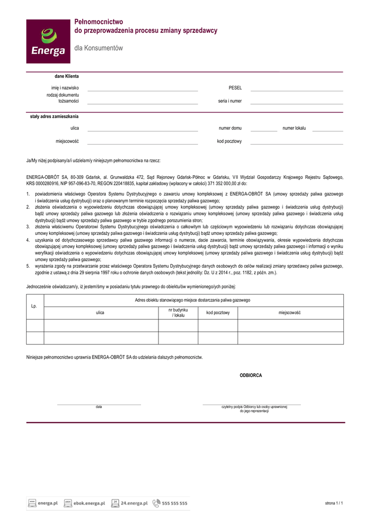 Pełnomocnictwo do przeprowadzenia procesu zmiany sprzedawcy dla Konsumentów dane Klienta imię i nazwisko rodzaj dokumentu tożsamości PESEL seria i numer stały adres zamieszkania ulica numer domu miejscowość kod pocztowy numer lokalu Ja/My niżej podpisany/a/i udzielam/y niniejszym pełnomocnictwa na rzecz: ENERGA-OBRÓT SA, 80-309 Gdańsk, al. Grunwaldzka 472, Sąd Rejonowy Gdańsk-Północ w Gdańsku, VII Wydział Gospodarczy Krajowego Rejestru Sądowego, KRS 0000280916, NIP 957-096-83-70, REGON 220418835, kapitał zakładowy (wpłacony w całości) 371 352 000,00 zł do: 1. 2. 3. 4. 5. powiadomienia właściwego Operatora Systemu Dystrybucyjnego o zawarciu umowy kompleksowej z ENERGA-OBRÓT SA (umowy sprzedaży paliwa gazowego i świadczenia usług dystrybucji) oraz o planowanym terminie rozpoczęcia sprzedaży paliwa gazowego; złożenia oświadczenia o wypowiedzeniu dotychczas obowiązującej umowy kompleksowej (umowy sprzedaży paliwa gazowego i świadczenia usług dystrybucji) bądź umowy sprzedaży paliwa gazowego lub złożenia oświadczenia o rozwiązaniu umowy kompleksowej (umowy sprzedaży paliwa gazowego i świadczenia usług dystrybucji) bądź umowy sprzedaży paliwa gazowego w trybie zgodnego porozumienia stron; złożenia właściwemu Operatorowi Systemu Dystrybucyjnego oświadczenia o całkowitym lub częściowym wypowiedzeniu lub rozwiązaniu dotychczas obowiązującej umowy kompleksowej (umowy sprzedaży paliwa gazowego i świadczenia usług dystrybucji) bądź umowy sprzedaży paliwa gazowego; uzyskania od dotychczasowego sprzedawcy paliwa gazowego informacji o numerze, dacie zawarcia, terminie obowiązywania, okresie wypowiedzenia dotychczas obowiązującej umowy kompleksowej (umowy sprzedaży paliwa gazowego i świadczenia usług dystrybucji) bądź umowy sprzedaży paliwa gazowego i informacji o wyniku weryfikacji oświadczenia o wypowiedzeniu dotychczas obowiązującej umowy kompleksowej (umowy sprzedaży paliwa gazowego i świadczenia usług dystrybucji) bądź umowy sprzedaży paliwa gazowego; wyrażenia zgody na przetwarzanie przez właściwego Operatora Systemu Dystrybucyjnego danych osobowych do celów realizacji zmiany sprzedawcy paliwa gazowego, zgodnie z ustawą z dnia 29 sierpnia 1997 roku o ochronie danych osobowych (tekst jednolity: Dz. U z 2014 r., poz. 1182, z późn. zm.). Jednocześnie oświadczam/y, iż jestem/śmy w posiadaniu tytułu prawnego do obiektu/ów wymienionego/ych poniżej: Adres obiektu stanowiącego miejsce dostarczania paliwa gazowego Lp. ulica nr budynku / lokalu kod pocztowy miejscowość Niniejsze pełnomocnictwo uprawnia ENERGA-OBRÓT SA do udzielania dalszych pełnomocnictw. ODBIORCA data czytelny podpis Odbiorcy lub osoby uprawnionej do jego reprezentacji strona 1 / 1