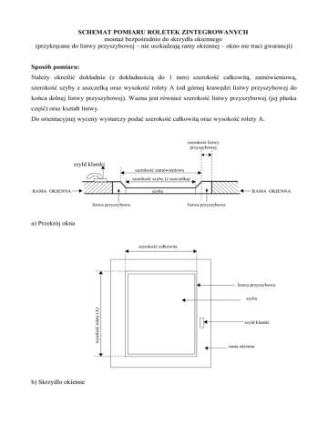 SCHEMAT POMIARU ROLETEK ZINTEGROWANYCH montaż bezpośrednio do skrzydła okiennego (przykręcane do listwy przyszybowej – nie uszkadzają ramy okiennej – okno nie traci gwarancji) Sposób pomiaru: Należy określić dokładnie (z dokładnością do 1 mm) szerokość całkowitą, zamówieniową, szerokość szyby z uszczelką oraz wysokość rolety A (od górnej krawędzi listwy przyszybowej do końca dolnej listwy przyszybowej). Ważna jest również szerokość listwy przyszybowej (jej płaska część) oraz kształt listwy. Do orientacyjnej wyceny wystarczy podać szerokość całkowitą oraz wysokość rolety A. szerokość listwy przyszybowej szyld klamki szerokość zamówieniowa szerokość szyby (z uszczelką) RAMA OKIENNA szyba listwa przyszybowa RAMA OKIENNA listwa przyszybowa a) Przekrój okna szerokość całkowita listwa przyszybowa szybaszxc wysokość rolety (A) szyba szyld klamki rama okienna b) Skrzydło okienne