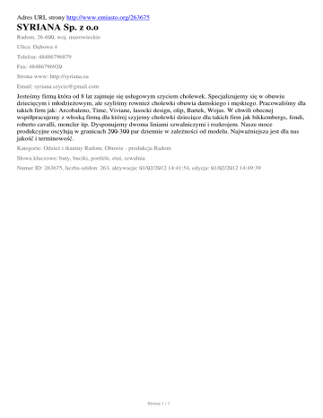 Adres URL strony http://www.emiasto.org/263675 SYRIANA Sp. z o.o Radom, 26-600, woj. mazowieckie Ulica: Dębowa 4 Telefon: 48486796879 Fax: 48486796920 Strona www: http://syriana.eu Email: [email protected] Jesteśmy firmą która od 8 lat zajmuje się usługowym szyciem cholewek. Specjalizujemy się w obuwiu dziecięcym i młodzieżowym, ale szyliśmy rownież cholewki obuwia damskiego i męskiego. Pracowaliśmy dla takich firm jak: Arcobaleno, Time, Viviane, lasocki design, olip, Bartek, Wojas. W chwili obecnej współpracujemy z włoską firmą dla której szyjemy cholewki dziecięce dla takich firm jak bikkembergs, fendi, roberto cavalli, moncler itp. Dysponujemy dwoma liniami szwalniczymi i rozkrojem. Nasze moce produkcyjne oscylują w granicach 200-300 par dziennie w zależności od modelu. Najważniejsza jest dla nas jakość i terminowość. Kategorie: Odzież i tkaniny Radom, Obuwie - produkcja Radom Słowa kluczowe: buty, buciki, portfele, etui, szwalnia Numer ID: 263675, liczba odsłon: 263, aktywacja: 01/02/2012 14:41:54, edycja: 01/02/2012 14:49:39 Strona 1 / 1