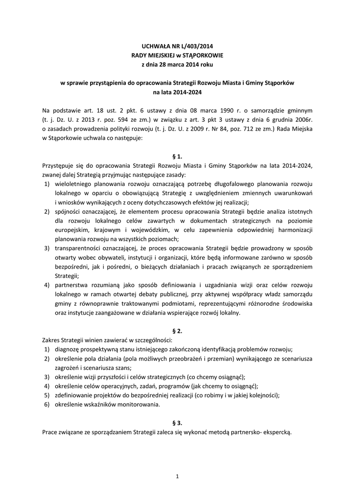 UCHWAŁA NR L/403/2014 RADY MIEJSKIEJ w STĄPORKOWIE z dnia 28 marca 2014 roku w sprawie przystąpienia do opracowania Strategii Rozwoju Miasta i Gminy Stąporków na lata 2014-2024 Na podstawie art. 18 ust. 2 pkt. 6 ustawy z dnia 08 marca 1990 r. o samorządzie gminnym (t. j. Dz. U. z 2013 r. poz. 594 ze zm.) w związku z art. 3 pkt 3 ustawy z dnia 6 grudnia 2006r. o zasadach prowadzenia polityki rozwoju (t. j. Dz. U. z 2009 r. Nr 84, poz. 712 ze zm.) Rada Miejska w Stąporkowie uchwala co następuje: § 1. Przystępuje się do opracowania Strategii Rozwoju Miasta i Gminy Stąporków na lata 2014-2024, zwanej dalej Strategią przyjmując następujące zasady: 1) wieloletniego planowania rozwoju oznaczającą potrzebę długofalowego planowania rozwoju lokalnego w oparciu o obowiązującą Strategię z uwzględnieniem zmiennych uwarunkowań i wniosków wynikających z oceny dotychczasowych efektów jej realizacji; 2) spójności oznaczającej, że elementem procesu opracowania Strategii będzie analiza istotnych dla rozwoju lokalnego celów zawartych w dokumentach strategicznych na poziomie europejskim, krajowym i wojewódzkim, w celu zapewnienia odpowiedniej harmonizacji planowania rozwoju na wszystkich poziomach; 3) transparentności oznaczającej, że proces opracowania Strategii będzie prowadzony w sposób otwarty wobec obywateli, instytucji i organizacji, które będą informowane zarówno w sposób bezpośredni, jak i pośredni, o bieżących działaniach i pracach związanych ze sporządzeniem Strategii; 4) partnerstwa rozumianą jako sposób definiowania i uzgadniania wizji oraz celów rozwoju lokalnego w ramach otwartej debaty publicznej, przy aktywnej współpracy władz samorządu gminy z równoprawnie traktowanymi podmiotami, reprezentującymi różnorodne środowiska oraz instytucje zaangażowane w działania wspierające rozwój lokalny. § 2. Zakres Strategii winien zawierać w szczególności: 1) diagnozę prospektywną stanu istniejącego zakończoną identyfikacją problemów rozwoju; 2) określenie pola działania (pola możliwych przeobrażeń i przemian) wynikającego ze scenariusza zagrożeń i scenariusza szans; 3) określenie wizji przyszłości i celów strategicznych (co chcemy osiągnąć); 4) określenie celów operacyjnych, zadań, programów (jak chcemy to osiągnąć); 5) zdefiniowanie projektów do bezpośredniej realizacji (co robimy i w jakiej kolejności); 6) określenie wskaźników monitorowania. § 3. Prace związane ze sporządzaniem Strategii zaleca się wykonać metodą partnersko- ekspercką. 1 § 4. Ustala się schemat organizacji prac nad strategią obejmujący następujące typy struktur: 1) komitet sterujący, który tworzą: przewodniczący Rady Miejskiej w Stąporkowie, przewodniczący wszystkich komisji Rady Miejskiej w Stąporkowie, za wyjątkiem komisji rewizyjnej, burmistrz Stąporkowa, zastępca burmistrza, sekretarz, skarbnik; mający na celu zapewnienie konsensusu wokół strategicznych rozstrzygnięć, jakie powinien zawierać dokument Strategii; 2) zespoły robocze, których zadaniem jest synteza już istniejących materiałów źródłowych i raportów dziedzinowych, a także organizowanie ad hoc ewentualnych opracowań eksperckich, opinii i wniosków oraz wszelkich innych prac studialnych i analitycznych, prowadzonych „w trybie ciągłym”; do zespołów należy prowadzenie prac nad kolejnymi w wersjami dokumentu strategii i jego poszczególnymi częściami; w zespołach tych działają głównie przedstawiciele komórek organizacyjnych Urzędu Miejskiego w Stąporkowie i gminnych jednostek organizacyjnych; 3) zespół ekspertów, którego zadaniem jest sprawowanie nadzoru merytorycznego w ramach bieżącej współpracy z zespołami roboczymi oraz analiza zgodności i kompletności dokumentu Strategii z obowiązującymi regulacjami prawa oraz dokumentami krajowymi i unijnymi; ponadto członkowie tego zespołu biorą udział w organizowanych spotkaniach konsultacyjnych, prowadzą warsztaty jako moderatorzy. § 5. Upoważnia się Burmistrza Stąporkowa do: 1) powołania zespołów roboczych, o których mowa w § 4 pkt 2; 2) wyłonienia zespołu eksperckiego, o którym mowa w § 4 pkt 3, z zastosowaniem zasady konkurencyjności; 3) określenia trybu i harmonogramu prac nad Strategią. § 6. Strategia podlega okresowej aktualizacji, co najmniej raz na cztery lata. § 7. Informacja o przystąpieniu do opracowywania Strategii podlega podaniu do publicznej wiadomości w sposób określony w art. 3 ust. 1 pkt 11 ustawy z dnia 3 października 2008 r. o udostępnianiu informacji o środowisku i jego ochronie, udziale społeczeństwa w ochronie środowiska oraz o ocenach oddziaływania na środowisko (t. j. Dz. U. z 2013 r. poz. 1235 ze zm.). § 8. Wykonanie uchwały powierza się Burmistrzowi Stąporkowa. § 9. Uchwała wchodzi w życie z dniem podjęcia. Przewodniczący Rady Miejskiej Jacek Kołodziej 2 UZASADNIENIE Zgodnie z art. 3 ustawy z dnia 6 grudnia 2006 r. o zasadach prowadzenia polityki rozwoju (t. j. Dz. U. z 2009 r., Nr 84, poz. 712 ze zm.) politykę rozwoju prowadzą: Rada Ministrów, samorząd wojewódzki oraz samorząd powiatowy i gminny. Natomiast art. 4 ust. 1 ww. ustawy stanowi, iż politykę rozwoju prowadzi się na podstawie strategii rozwoju. Strategia rozwoju jest szansą na stworzenie długofalowej wizji rozwoju miasta i gminy oraz koordynację i hierarchizację działań. Dokument ten powinien pozwolić we właściwy sposób i w odpowiedniej kolejności rozwiązywać pojawiające się problemy. Dzięki opracowaniu strategii zwiększy się wiarygodności gminy wobec partnerów zewnętrznych. Zastosowanie metody partnersko-eksperckiej pozwali na połączenie wysiłku zespołu ekspertów z odbiorcą, czyli społeczeństwem, które w tym przypadku reprezentowane będzie przez radnych, pracowników urzędu gminy i lokalnych liderów. Realizacja budżetu przez gminy wymusza konieczność stworzenia dokumentu, który w