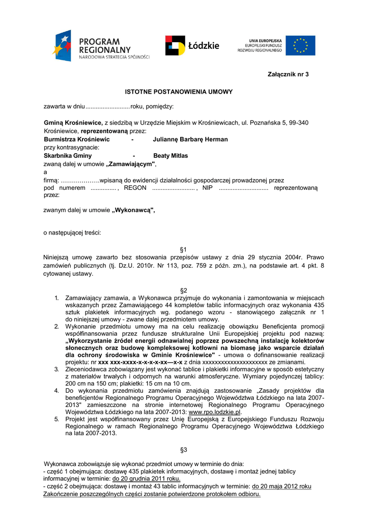 Załącznik nr 3 ISTOTNE POSTANOWIENIA UMOWY zawarta w dniu .......................... roku, pomiędzy: Gminą Krośniewice, z siedzibą w Urzędzie Miejskim w Krośniewicach, ul. Poznańska 5, 99-340 Krośniewice, reprezentowaną przez: Burmistrza Krośniewic Juliannę Barbarę Herman przy kontrasygnacie: Skarbnika Gminy Beaty Mitlas zwaną dalej w umowie „Zamawiającym", a firmą: ……………….wpisaną do ewidencji działalności gospodarczej prowadzonej przez pod numerem ............... , REGON ......................... , NIP ............................. reprezentowaną przez: zwanym dalej w umowie „Wykonawcą", o następującej treści: §1 Niniejszą umowę zawarto bez stosowania przepisów ustawy z dnia 29 stycznia 2004r. Prawo zamówień publicznych (tj. Dz.U. 2010r. Nr 113, poz. 759 z późn. zm.), na podstawie art. 4 pkt. 8 cytowanej ustawy. 1. 2. 3. 4. 5. §2 Zamawiający zamawia, a Wykonawca przyjmuje do wykonania i zamontowania w miejscach wskazanych przez Zamawiającego 44 kompletów tablic informacyjnych oraz wykonania 435 sztuk plakietek informacyjnych wg. podanego wzoru - stanowiącego załącznik nr 1 do niniejszej umowy - zwane dalej przedmiotem umowy. Wykonanie przedmiotu umowy ma na celu realizację obowiązku Beneficjenta promocji współfinansowania przez fundusze strukturalne Unii Europejskiej projektu pod nazwą: „Wykorzystanie źródeł energii odnawialnej poprzez powszechną instalację kolektorów słonecznych oraz budowę kompleksowej kotłowni na biomasę jako wsparcie działań dla ochrony środowiska w Gminie Krośniewice" - umowa o dofinansowanie realizacji projektu: nr xxx xxx-xxxx-x-x-x-x-xx—x-x z dnia xxxxxxxxxxxxxxxxxxxxx ze zmianami. Zleceniodawca zobowiązany jest wykonać tablice i plakietki informacyjne w sposób estetyczny z materiałów trwałych i odpornych na warunki atmosferyczne. Wymiary pojedynczej tablicy: 200 cm na 150 cm; plakietki: 15 cm na 10 cm. Do wykonania przedmiotu zamówienia znajdują zastosowanie „Zasady projektów dla beneficjentów Regionalnego Programu Operacyjnego Województwa Łódzkiego na lata 20072013" zamieszczone na stronie internetowej Regionalnego Programu Operacyjnego Województwa Łódzkiego na lata 2007-2013: www.rpo.lodzkie.pl. Projekt jest współfinansowany przez Unię Europejską z Europejskiego Funduszu Rozwoju Regionalnego w ramach Regionalnego Programu Operacyjnego Województwa Łódzkiego na lata 2007-2013. §3 Wykonawca zobowiązuje się wykonać przedmiot umowy w terminie do dnia: - część 1 obejmująca: dostawę 435 plakietek informacyjnych, dostawę i montaż jednej tablicy informacyjnej w terminie: do 20 grudnia 2011 roku. - część 2 obejmująca: dostawę i montaż 43 tablic informacyjnych w terminie: do 20 maja 2012 roku Zakończenie poszczególnych części zostanie potwierdzone protokołem odbioru. 1. 2. 3. 4. 5. 1. 2. §4 Wynagrodzenie za wykonanie przedmiotu umowy, o którym mowa w § 2, wynosi ................ zł netto + VAT ..... % ........... zł, czyli łącznie brutto ..................... zł (słownie: .................................... ) Kwota określona w ust 1 jest kwotą całkowitą i obejmuje wykonanie całości przedmiotu umowy, o którym mowa w § 2, tj. wykonanie i zamontowanie w miejscu wskazanym przez Zamawiającego 44 kompletów tablic informacyjnych oraz dostawę 435 sztuk plakietek informacyjnych wg. wzoru (załącznik nr 1). Płatność za wykonany przedmiot umowy nastąpi w dwóch transzach: - 14 dni po otrzymaniu poprawnej faktury Vat i podpisaniu protokołu zdawczo-odbiorczego za pierwszą część pracy (obejmuje dostawę i montaż jednej tablicy informacyjnej i dostawę 435 plakietek informacyjnych) - 14 dni po otrzymaniu poprawnej faktury Vat i podpisaniu protokołu zdawczo-odbiorczego za drugą część pracy (obejmuje dostawę i montaż 43 tablic informacyjnych) Wynagrodzenie, o którym mowa w ust. 1 obejmuje wszelkie ryzyka i odpowiedzialność. Wykonawcy za prawidłowe oszacowanie wszystkich kosztów związanych z wykonaniem przedmiotu umowy. Wynagrodzenie płatne będzie przelewem, na wskazany przez Wykonawcę rachunek bankowy, w ciągu 14 dni, od daty dostarczenia Zamawiającemu prawidłowo wystawionej faktury VAT. §5 Wykonawca zobowiązuje się wykonać przedmiot umowy terminowo i bez usterek. W przypadku stwierdzenia wad w wykonywanej pracy Wykonawca zobowiązuje się do ich nieodpłatnego usunięcia w terminie do dwóch tygodni od daty ich zgłoszenia. W przypadku nie wykonania zlecenia w terminie, wykonania go wadliwie lub w sposób nienależyty, Zamawiający ma prawo do pomniejszenia wynagrodzenia lub odstawienia od umowy bez odszkodowania. §6 1. Każda ze stron może odstąpić od umowy, w przypadkach określonych w Kodeksie cywilnym. 2. W przypadku bezzasadnego odstąpienia od umowy w całości lub w części przez jedną ze stron, strona odstępująca płaci odszkodowanie w wysokości 10% umownego wynagrodzenia określonego w § 4 pkt 1. 3. W przypadku nieterminowego wykonania przedmiotu umowy Wykonawca zobowiązany jest do zapłaty kary umownej w wysokości 100, 00 zł za każdy dzień opóźnienia. §7 W sprawach nieunormowanych umową zastosowanie mają przepisy Kodeksu Cywilnego. §8 Wszelkie zmiany niniejszej umowy mogą być dokonywane pod rygorem nieważności jedynie w formie pisemnego aneksu, z podpisami upoważnionych przedstawicieli obu stron. §9 Do rozstrzygania sporów wynikłych na tle wykonania umowy właściwy jest Sąd dla siedziby Zamawiającego. §10 Umowa została sporządzona w trzech jednobrzmiących egzemplarzach z przeznaczeniem: jeden egzemplarz dla Wykonawcy, dwa egzemplarze dla Zamawiającego. WYKONAWCA: ZAMAWIAJĄCY:
