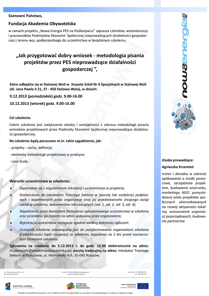 Szanowni Państwo, Fundacja Akademia Obywatelska w ramach projektu „Nowa Energia PES na Podkarpaciu” zaprasza członków, wolontariuszy i pracowników Podmiotów Ekonomii Społecznej nieprowadzących działalności gospodarczej z terenu woj. podkarpackiego do uczestnictwa w bezpłatnym szkoleniu: „Jak przygotować dobry wniosek - metodologia pisania projektów przez PES nieprowadzące działalności gospodarczej ”, które odbędzie się w Stalowej Woli w Zespole Szkół Nr 6 Specjalnych w Stalowej Woli (Al. Jana Pawła II 21, 37 - 450 Stalowa Wola), w dniach: 9.12.2013 (poniedziałek) godz. 9.00-16.00 10.12.2013 (wtorek) godz. 9.00-16.00 Cel szkolenia: Celem szkolenia jest zwiększenie wiedzy i umiejętności z zakresu metodologii pisania wniosków projektowych przez Podmioty Ekonomii Społecznej nieprowadzące działalności gospodarczej. Na szkoleniu będą poruszane m.in. takie zagadnienia, jak: - projekty - cechy, definicje; - elementy metodologii projektowej w praktyce; - case study. Osoba prowadząca: Agnieszka Krzemień Warunki uczestnictwa w szkoleniu: Zapoznanie się z regulaminem rekrutacji i uczestnictwa w projekcie; Dostarczenie do Inkubatora Trzeciego Sektora w (pocztą lub osobiście) podpisanych i wypełnionych przez organizację oraz jej przedstawiciela chcącego wziąć udział w szkoleniu, dokumentów rekrutacyjnych (zał. 1, zał. 2, zał. 3, zał. 4); Wypełnienie przez kandydata formularza zgłoszeniowego uczestnictwa w szkoleniu oraz przesłanie go mailem na adres wskazany przez organizatora; Rejestracja uczestników następuje zgodnie według kolejności zgłoszeń; Uczestnik szkolenia zobowiązany jest do poinformowania organizatora szkolenia o nieobecności bądź rezygnacji ze szkolenia, najpóźniej na 2 dni przed wyznaczonym terminem szkolenia. Zgłoszenia na szkolenie do 5.12.2013 r. do godz. 12.00 elektronicznie na adres: [email protected], pocztą tradycyjną na adres: Inkubator Trzeciego Sektora w Rzeszowie, ul. Hetmańska 4/9, 35-045 Rzeszów. trener i doradca w zakresie aplikowania o środki pomocowe, zarządzania projektem, budowania wizerunku, marketingu NGO. pomysłodawca wielu projektów społecznych ukierunkowanych na rozwój aktywności lokalnej, wzmocnienie organizacji pozarządowych, budowanie partnerstw. PROGRAM SZKOLENIA „Jak przygotować dobry wniosek - metodologia pisania projektów przez PES nieprowadzące działalności gospodarczej ” Stalowa Wola, 9-10.12.2013 Godzina Dzień I - poniedziałek 09.12.13r. 9.00. - 11.00 Sesja otwierająca. Prezentacja celów i programu szkolenia. Jak zacząć – czyli podstawowe informacje o wniosku i projekcie. Planowanie projektu - czyli diagnoza problemów i potrzeb środowiska (drzewo problemów, drzewo celów). 11.00—11.15 Przerwa kawowa 11.15—13.15 Przedstawienie i analiza podstawowych części fiszki projektowej. 13.15—13.45 Przerwa obiadowa 13.45 –14.45 Aktualne konkursy – źródła finansowania działalności NGO, cz. I. 14.45—15.00 Przerwa kawowa 15.00—16.00 Aktualne konkursy – źródła finansowania działalności NGO, cz. II. Godzina Dzień II - wtorek 10.12.13r. 9.00—10.45 Sesja otwierająca – pytania. Racjonalna Samo-Analiza Warsztaty projektowe (praca w grupach) – wypracowanie wniosków o dofinansowanie w odpowiedzi na aktualne konkursy: Uzasadnienie – diagnoza sytuacji problemowej. 10.45—11.00 Przerwa kawowa 11.00—12.30 Warsztaty projektowe, cd.: Wybór celu głównego i celów szczegółowych. 12.30—13.00 Przerwa obiadowa Warsztaty projektowe, cd.: Określenie grupy/grup - docelowej/docelowych. 13.00—14.45 Opis planowanych działań w projekcie. Harmonogram. 14.45—15.00 Przerwa kawowa Warsztaty projektowe, cd: Budżet. 15.00—16.00 Rezultaty. Sesja zamykająca – pytania i odpowiedzi.