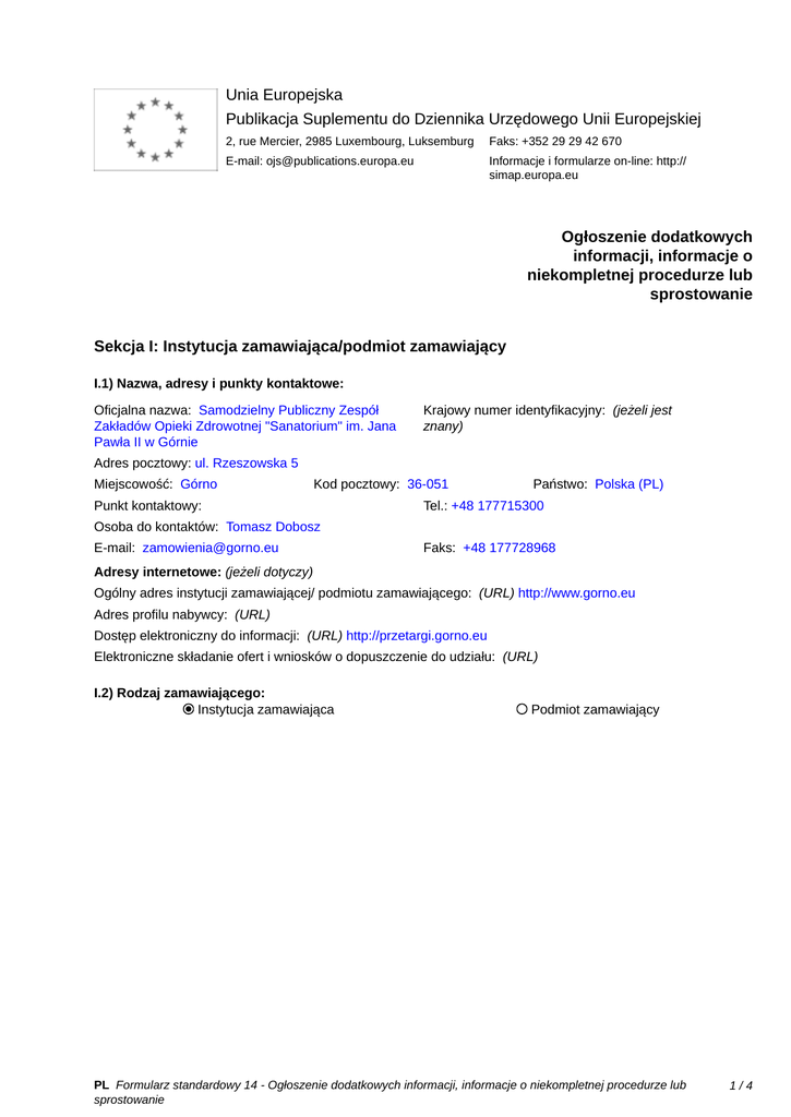 Unia Europejska Publikacja Suplementu do Dziennika Urzędowego Unii Europejskiej 2, rue Mercier, 2985 Luxembourg, Luksemburg Faks: +352 29 29 42 670 E-mail: [email protected] Informacje i formularze on-line: http:// simap.europa.eu Ogłoszenie dodatkowych informacji, informacje o niekompletnej procedurze lub sprostowanie Sekcja I: Instytucja zamawiająca/podmiot zamawiający I.1) Nazwa, adresy i punkty kontaktowe: Oficjalna nazwa: Samodzielny Publiczny Zespół Zakładów Opieki Zdrowotnej "Sanatorium" im. Jana Pawła II w Górnie Krajowy numer identyfikacyjny: (jeżeli jest znany) _____ Adres pocztowy: ul. Rzeszowska 5 Miejscowość: Górno Kod pocztowy: 36-051 Punkt kontaktowy: _____ Państwo: Polska (PL) Tel.: +48 177715300 Osoba do kontaktów: Tomasz Dobosz E-mail: [email protected] Faks: +48 177728968 Adresy internetowe: (jeżeli dotyczy) Ogólny adres instytucji zamawiającej/ podmiotu zamawiającego: (URL) http://www.gorno.eu Adres profilu nabywcy: (URL) _____ Dostęp elektroniczny do informacji: (URL) http://przetargi.gorno.eu Elektroniczne składanie ofert i wniosków o dopuszczenie do udziału: (URL) _____ I.2) Rodzaj zamawiającego: Instytucja zamawiająca Podmiot zamawiający PL Formularz standardowy 14 - Ogłoszenie dodatkowych informacji, informacje o niekompletnej procedurze lub sprostowanie 1/4 Sekcja II: Przedmiot zamówienia II.1.1) Nazwa nadana zamówieniu: Dostawa sprzętu medycznego II.1.2) Krótki opis zamówienia lub zakupu: (podano w pierwotnym ogłoszeniu) Przedmiotem zamówienia jest dostawa fabrycznie nowego, nie noszącego śladów użytkowania sprzętu medycznego. Wszystkie oferowane produkty muszą stanowić wyroby medyczne w rozumieniu ustawy z 20 maja 2010 r. o wyrobach medycznych (Dz. U.2015 poz. 876) a także posiadać oznakowanie CE oraz instrukcje obsługi w języku polskim. Niniejsze zamówienie składa się z 21 części wymienionych poniżej: Część 1 - Aparat do mierzenia ciśnienia zegarowy (szt. 4) Część 2 - Poręcze do nauki chodu (szt. 1) Część 3 - Wózek do przewożenia leków (szt. 2) Część 4 - Wózek wielofunkcyjny (szt. 2) Część 5 - Wózek zabiegowy (szt. 2) Część 6 - Aparat do lokalizacji naczyń krwionośnych ze statywem (szt. 2) Część 7 - Aparat do mierzenia ciśnienia specjalistyczny (szt. 2) Część 8 - Aparat EKG + zestaw (szt. 1) Część 9 - Spirometr + zestaw (szt. 1) Część 10 - Zestaw do terapii EEG Biofeedback wraz z dodatkowym wyposażeniem (kpl. 1) Część 11 - Zestaw Holter EKG (szt. 2) Część 12 - Respirator ze stojakiem i czujnikiem tlenu (szt. 4) Część 13 - Laryngoskop (szt. 2) Część 14 - Otoskop (szt. 2) Część 15 - Nawilżacz powietrza z funkcją jonizacji (szt. 6) Część 16 - Wanna ze zintegrowanym systemem (kpl. 1) Część 17 - Meble medyczne Część 18 - Defibrylator (szt. 1) Część 19 - Inhalator (szt. 4) Część 20 - Urządzenie - system ogrzewania pacjenta (szt. 2) Część 21 - Wózek do transportu chorych w pozycji leżącej i siedzącej (szt. 1) II.1.3) Wspólny Słownik Zamówień (CPV) Główny przedmiot Słownik główny 33100000 Słownik uzupełniający (jeżeli dotyczy) PL Formularz standardowy 14 - Ogłoszenie dodatkowych informacji, informacje o niekompletnej procedurze lub sprostowanie 2/4 Sekcja IV: Procedura IV.1)Rodzaj procedury (podano w pierwotnym ogłoszeniu) Otwarta Ograniczona Ograniczona przyspieszona Negocjacyjna Negocjacyjna przyspieszona Dialog konkurencyjny Negocjacyjna z uprzednim ogłoszeniem Negocjacyjna bez uprzedniego ogłoszenia Negocjacyjna z publikacją ogłoszenia o zamówieniu Negocjacyjna bez publikacji ogłoszenia o zamówieniu Udzielenie zamówienia bez uprzedniej publikacji ogłoszenia o zamówieniu w Dzienniku Urzędowym Unii Europejskiej IV.2)Informacje administracyjne IV.2.1)Numer referencyjny: (podano w pierwotnym ogłoszeniu) ST/DZP/18/2016 IV.2.2)Dane referencyjne ogłoszenia w przypadku ogłoszeń przesłanych drogą elektroniczną: Pierwotne ogłoszenie przesłane przez eNotices TED eSender Login: ENOTICES_spzzozgorno Dane referencyjne ogłoszenia: 2016-097836 rok i numer dokumentu IV.2.3)Ogłoszenie, którego dotyczy niniejsza publikacja: Numer ogłoszenia w Dz.U.: 2016/S 146-264441 z dnia: 30/07/2016 (dd/mm/rrrr) IV.2.4)Data wysłania pierwotnego ogłoszenia: 27/07/2016 (dd/mm/rrrr) PL Formularz standardowy 14 - Ogłoszenie dodatkowych informacji, informacje o niekompletnej procedurze lub sprostowanie 3/4 Sekcja VI: Informacje uzupełniające VI.1) Ogłoszenie dotyczy: Procedury niepełnej Sprostowania Informacji dodatkowych VI.2) Informacje na temat niepełnej procedury udzielenia zamówienia: Postępowanie o udzielenie zamówienia zostało przerwane Postępowanie o udzielenie zamówienia uznano za nieskuteczne Zamówienia nie udzielono Zamówienie może być przedmiotem ponownej publikacji VI.3) Informacje do poprawienia lub dodania : VI.3.1) Zmiana oryginalnej informacji podanej przez instytucję zamawiającą Publikacja w witrynie TED niezgodna z oryginalną informacją, przekazaną przez instytucję zamawiającą Oba przypadki VI.3.2) W ogłoszeniu pierwotnym W odpowiedniej dokumentacji przetargowej (więcej informacji w odpowiedniej dokumentacji przetargowej) W obu przypadkach (więcej informacji w odpowiedniej dokumentacji przetargowej) VI.3.3) Tekst, który należy poprawić w pierwotnym ogłoszeniu Miejsce, w którym znajduje się Zamiast: zmieniany tekst: VI.3.4) Daty, które należy poprawić w pierwotnym ogłoszeniu Miejsce, w którym znajdują się Zamiast: zmieniane daty: 08/09/2016 Godzina: 12:00 IV.3.4)Termin składania ofert lub (dd/mm/rrrr) wniosków o dopuszczenie do udziału w postępowaniu Miejsce, w którym znajdują się zmieniane daty: IV.3.8)Warunki otwarcia ofert Zamiast: 08/09/2016 Godzina: 12:30 (dd/mm/rrrr) Powinno być: Powinno być: 30/09/2016 Godzina: 12:00 (dd/mm/rrrr) Powinno być: 30/09/2016 Godzina: 12:30 (dd/mm/rrrr) VI.3.5) Adresy i punkty kontaktowe, które należy poprawić VI.3.6) Tekst,