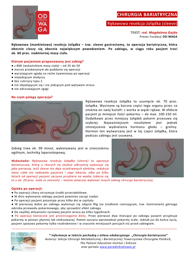 CHIRURGIA BARIATRYCZNA Rękawowa resekcja żołądka (sleeve) TEKST: red. Magdalena Gajda Prezes Fundacji OD-WAGA Rękawowa (mankietowa) resekcja żołądka – tzw. sleeve gastrectomy, to operacja bariatryczna, która obecnie cieszy się obecnie największym powodzeniem. Po zabiegu, w ciągu roku pacjent traci ok. 60 proc. nadmiernej masy ciała. Którym pacjentom proponowany jest zabieg? ● ● ● ● ● ● ● z BMI (wskaźnikiem masy ciała) – od 35 do 50 mocno przekonanym do poddania się operacji wyrażającym zgodę na reżim żywieniowy po operacji niejedzącym słodyczy bez cukrzycy typu 2 nie objadającym się i nie jedzącym pod wpł ywem stresu nie odczuwającym zgagi Na czym polega operacja? Rękawowa resekcja żołądka to usunięcie ok. 70 proc. żołądka. Wycinane są boczne części tego organu przez co zmienia on swój kształt: z worka w wąski rękaw. W efekcie pacjent je mniejsze ilości pokarmu – do max. 100-150 ml. Dodatkowo przez mniejszy żołądek pokarm przesuwa się szybciej. Najważniejszym rezultatem jest jednak zmniejszenie wydzielania hormonu głodu – greliny. Hormon ten wytwarzany jest w tej części żołądka, która podczas zabiegu jest usuwana. Zabieg trwa ok. 90 minut, wykonywany jest w znieczuleniu ogólnym, techniką laparoskopową. Wskazówka: Rękawowa resekcja żołądka (sleeve) to operacja bariatryczna, którą u chorych na otyłość olbrzymią wykonuje się jako pierwszą. Jeśli sleeve nie daje oczekiwanych efektów, redukcja masy ciała nie zadowala pacjenta i jego lekarza, albo po kilku latach od operacji pacjent zaczyna przybiera na wadze (zdarza się to u ok. 20 proc. osób ze sleevem) – można wówczas wykonać innych zabieg chirurgii bariatrycznej. Opieka po operacji: ● Po operacji chory otrzymuje środki przeciwbólowe. ● W dniu wykonania zabiegu pacjent powinien zacząć siadać. ● Po operacji pacjent pozostaje przez kilka dni w szpitalu. ● W pierwszej dobie po zabiegu wykonuje się zdjęcie Rtg (ze środkiem cieniującym, tzw. kontrastem) górnego odcinka przewodu pokarmowego, aby sprawdzić efekt zabiegu. ● Do zwykłej aktywności życiowej pacjent wraca po kilku tygodniach. ● Po operacji konieczne jest przestrzeganie diety. Przez pierwsze dwa miesiące po zabiegu pacjent przyjmuje pokarmy w postaci płynnej lub zmiksowanej. Potem zaczyna wprowadzać pokarmy st ałe. Jednak już do końca życia, pacjent spożywa pokarmy tylko rozdrobnione i w znacznie mniejszych porcjach niż przed zabiegiem. _______________________________________ ________________________________________________________ * Informacje w tekście pochodzą z atlasu edukacyjnego „Chirurgia bariatryczna” Autorzy: Sekcja Chirurgii Metabolicznej i Bariatrycznej Towa rzystwa Chirurgów Polskich, The Patient Education Institut i Ethicon oraz portalu www.poradnikzdrowie.pl