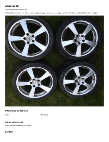 Alufelgi 18 [Sprzedam] Części i akcesoria Alufelgi 18 pasujące m. in. do vw i audi, nigdy nie były prostowane ani regenerowane. Rozstaw śrub 5x112 Stan jak na zdjęciu. Informacje dodatkowe Stan Adres ogłoszenia http://mogloszenia.pl/alufelgi-18,o95 Kontakt Używany Mail: [email protected] Telefon: Lokalizacja , reda Pomorskie (Polska) Ogłoszenie dodano: 2016-12-13 13:16:21 Ogłoszenie wygasa: 2017-02-11 13:16:21 Powered by TCPDF (www.tcpdf.org)