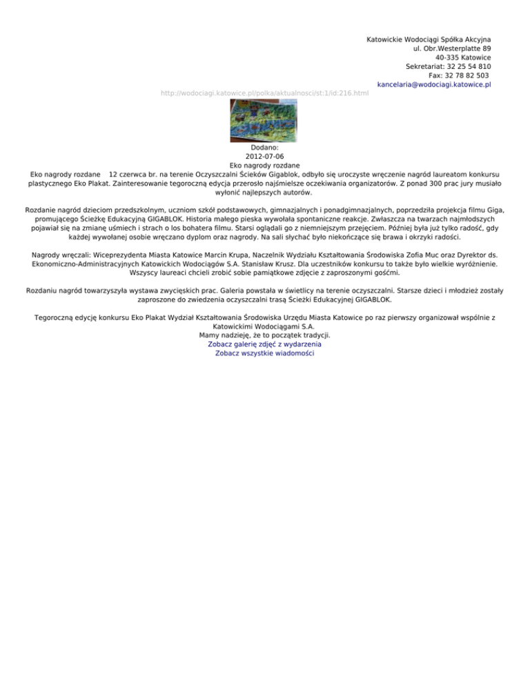 Katowickie Wodociągi Spółka Akcyjna ul. Obr.Westerplatte 89 40-335 Katowice Sekretariat: 32 25 54 810 Fax: 32 78 82 503 [email protected] http://wodociagi.katowice.pl/polka/aktualnosci/st:1/id:216.html Dodano: 2012-07-06 Eko nagrody rozdane Eko nagrody rozdane 12 czerwca br. na terenie Oczyszczalni Ścieków Gigablok, odbyło się uroczyste wręczenie nagród laureatom konkursu plastycznego Eko Plakat. Zainteresowanie tegoroczną edycja przerosło najśmielsze oczekiwania organizatorów. Z ponad 300 prac jury musiało wyłonić najlepszych autorów. Rozdanie nagród dzieciom przedszkolnym, uczniom szkół podstawowych, gimnazjalnych i ponadgimnazjalnych, poprzedziła projekcja filmu Giga, promującego Ścieżkę Edukacyjną GIGABLOK. Historia małego pieska wywołała spontaniczne reakcje. Zwłaszcza na twarzach najmłodszych pojawiał się na zmianę uśmiech i strach o los bohatera filmu. Starsi oglądali go z niemniejszym przejęciem. Później była już tylko radość, gdy każdej wywołanej osobie wręczano dyplom oraz nagrody. Na sali słychać było niekończące się brawa i okrzyki radości. Nagrody wręczali: Wiceprezydenta Miasta Katowice Marcin Krupa, Naczelnik Wydziału Kształtowania Środowiska Zofia Muc oraz Dyrektor ds. Ekonomiczno-Administracyjnych Katowickich Wodociągów S.A. Stanisław Krusz. Dla uczestników konkursu to także było wielkie wyróżnienie. Wszyscy laureaci chcieli zrobić sobie pamiątkowe zdjęcie z zaproszonymi gośćmi. Rozdaniu nagród towarzyszyła wystawa zwycięskich prac. Galeria powstała w świetlicy na terenie oczyszczalni. Starsze dzieci i młodzież zostały zaproszone do zwiedzenia oczyszczalni trasą Ścieżki Edukacyjnej GIGABLOK. Tegoroczną edycję konkursu Eko Plakat Wydział Kształtowania Środowiska Urzędu Miasta Katowice po raz pierwszy organizował wspólnie z Katowickimi Wodociągami S.A. Mamy nadzieję, że to początek tradycji. Zobacz galerię zdjęć z wydarzenia Zobacz wszystkie wiadomości