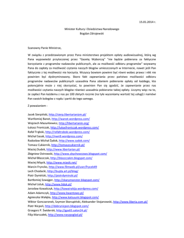 15.01.2014 r. Minister Kultury i Dziedzictwa Narodowego Bogdan Zdrojewski Szanowny Panie Ministrze, W związku z przedstawionym przez Pana ministerstwo projektem opłaty audiowizualnej, którą wg Pana wypowiedzi przytoczonej przez "Gazetę Wyborczą" "nie będzie pobierana za faktyczne korzystanie z programów nadawców publicznych, ale za możliwość odbioru programów" wzywamy Pana do zapłaty za możliwość czytania naszych blogów umieszczonych w Internecie, nawet jeśli Pan faktycznie z tej możliwości nie korzysta. Wszyscy bowiem powinni być równi wobec prawa i nikt nie powinien być dyskryminowany. Skoro fakt zapewniania przez państwo możliwości odbioru programów nadawców publicznych uzasadnia Pana zdaniem pobieranie opłaty od każdego, kto potencjalnie może z niej skorzystać, to powinien Pan się zgodzić, że zapewnianie przez nas możliwości czytania naszych blogów również uzasadnia pobieranie takiej opłaty. Liczymy więc na to, że zapłaci Pan każdemu z nas po 100 złotych rocznie (na tyle wyceniamy wartość tej usługi) i namówi Pan swoich kolegów z rządu i partii do tego samego. Z poważaniem Jacek Sierpiński, http://sierp.libertarianizm.pl/ Wartłomiej Banot, http://wanot.wordpress.com/ Wojciech Mazurkiewicz, http://libertarianin.org/ Łukasz Frontczak, http://lukasfrontczak.wordpress.com/ Rafał Trąbski, http://rafaltrabski.wordpress.com/ Michał Sasak, http://nwn9.wordpress.com/ Radosław Michał Żydok, http://www.zydok.com/ Tomasz Cukiernik, http://tomaszcukiernik.pl/ Maciej Dudek, http://www.libertarian.pl/ Zbigniew Ostrowski, http://www.zbychowcowo.blogspot.com/ Michał Błaszczak, http://blaszczakm.blogspot.com/ Maciej Miąsik, http://www.miasik.net/ Marcin Fryncko, http://www.filmweb.pl/user/frycek49 Lech Chodacki, http://bujda.art.pl/blog/ Piotr Dymiński, http://piotrdyminski.pl/ Bartłomiej Szwajger, http://skarymonster.blogspot.com/ Michał Liduk, http://www.liduk.pl/ Jarosław Kowalczyk, http://kawairakija.wordpress.com/ Adam Adamczyk, http://www.kwantowo.pl/ Agnieszka Wałęka, http://www.katsuumi.blogspot.com/ Wiktor Gonczaronek, Szymon Skorupiński, Aleksander Stojanowski, http://www.liberia.com.pl/ Piotr Nicpoń, http://dobrynicpon.blogspot.com/ Grzegorz P. Świderski, http://gps65.salon24.pl/ Filip Marszałek, http://www.naszpoglad.pl/ Marcin Cokot, http://wolnebielsko.pl/artykuly/ Róża Bożena Błaś, http://rtwob.blogspot.com/ Krzysztof Napora, http://krzysztofnapora.piszecomysle.pl/ Janek Mońka, Miłosz Lodowski, http://fb.com/makazlodem Filip Wysocki, http://fatbantha.wordpress.com/ Jakub Jankowski, http://www.etykowo.blogspot.com/ Kacper Kowalczyk, http://polska-szokujaca.blogspot.com/ Jan Cyraniak, http://www.photoblog.pl/vendee/ Roman Zaleski, http://romanzaleski.salon24.pl/ Piotr Baranowski, http://piotrbaranowski.com/