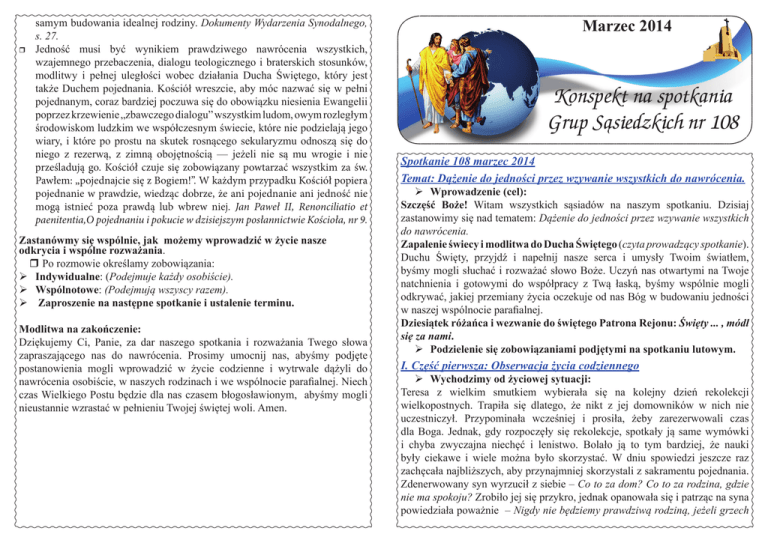 samym budowania idealnej rodziny. Dokumenty Wydarzenia Synodalnego, s. 27. Jedność musi być wynikiem prawdziwego nawrócenia wszystkich, wzajemnego przebaczenia, dialogu teologicznego i braterskich stosunków, modlitwy i pełnej uległości wobec działania Ducha Świętego, który jest także Duchem pojednania. Kościół wreszcie, aby móc nazwać się w pełni pojednanym, coraz bardziej poczuwa się do obowiązku niesienia Ewangelii poprzez krzewienie „zbawczego dialogu” wszystkim ludom, owym rozległym środowiskom ludzkim we współczesnym świecie, które nie podzielają jego wiary, i które po prostu na skutek rosnącego sekularyzmu odnoszą się do niego z rezerwą, z zimną obojętnością — jeżeli nie są mu wrogie i nie prześladują go. Kościół czuje się zobowiązany powtarzać wszystkim za św. Pawłem: „pojednajcie się z Bogiem!”. W każdym przypadku Kościół popiera pojednanie w prawdzie, wiedząc dobrze, że ani pojednanie ani jedność nie mogą istnieć poza prawdą lub wbrew niej. Jan Paweł II, Renonciliatio et paenitentia,O pojednaniu i pokucie w dzisiejszym posłannictwie Kościoła, nr 9. Zastanówmy się wspólnie, jak możemy wprowadzić w życie nasze odkrycia i wspólne rozważania. Po rozmowie określamy zobowiązania: Indywidualne: (Podejmuje każdy osobiście). Wspólnotowe: (Podejmują wszyscy razem). ¾¾ Zaproszenie na następne spotkanie i ustalenie terminu. Modlitwa na zakończenie: Dziękujemy Ci, Panie, za dar naszego spotkania i rozważania Twego słowa zapraszającego nas do nawrócenia. Prosimy umocnij nas, abyśmy podjęte postanowienia mogli wprowadzić w życie codzienne i wytrwale dążyli do nawrócenia osobiście, w naszych rodzinach i we wspólnocie parafialnej. Niech czas Wielkiego Postu będzie dla nas czasem błogosławionym, abyśmy mogli nieustannie wzrastać w pełnieniu Twojej świętej woli. Amen. Marzec 2014 Konspekt na spotkania Grup Sąsiedzkich nr 108 Spotkanie 108 marzec 2014 Temat: Dążenie do jedności przez wzywanie wszystkich do nawrócenia. Wprowadzenie (cel): Szczęść Boże! Witam wszystkich sąsiadów na naszym spotkaniu. Dzisiaj zastanowimy się nad tematem: Dążenie do jedności przez wzywanie wszystkich do nawrócenia. Zapalenie świecy i modlitwa do Ducha Świętego (czyta prowadzący spotkanie). Duchu Święty, przyjdź i napełnij nasze serca i umysły Twoim światłem, byśmy mogli słuchać i rozważać słowo Boże. Uczyń nas otwartymi na Twoje natchnienia i gotowymi do współpracy z Twą łaską, byśmy wspólnie mogli odkrywać, jakiej przemiany życia oczekuje od nas Bóg w budowaniu jedności w naszej wspólnocie parafialnej. Dziesiątek różańca i wezwanie do świętego Patrona Rejonu: Święty ... , módl się za nami. Podzielenie się zobowiązaniami podjętymi na spotkaniu lutowym. I. Część pierwsza: Obserwacja życia codziennego Wychodzimy od życiowej sytuacji: Teresa z wielkim smutkiem wybierała się na kolejny dzień rekolekcji wielkopostnych. Trapiła się dlatego, że nikt z jej domowników w nich nie uczestniczył. Przypominała wcześniej i prosiła, żeby zarezerwowali czas dla Boga. Jednak, gdy rozpoczęły się rekolekcje, spotkały ją same wymówki i chyba zwyczajna niechęć i lenistwo. Bolało ją to tym bardziej, że nauki były ciekawe i wiele można było skorzystać. W dniu spowiedzi jeszcze raz zachęcała najbliższych, aby przynajmniej skorzystali z sakramentu pojednania. Zdenerwowany syn wyrzucił z siebie – Co to za dom? Co to za rodzina, gdzie nie ma spokoju? Zrobiło jej się przykro, jednak opanowała się i patrząc na syna powiedziała poważnie – Nigdy nie będziemy prawdziwą rodziną, jeżeli grzech będzie nas dzielił. Te słowa były tak mocne, że nie mógł, ale i nie chciał już nic więcej powiedzieć - zdał sobie sprawę, że była to szczera prawda. Pytania: Jakie refleksje rodzą się nam po wysłuchaniu tego przykładu? Jakie trudności dostrzegamy we wzrastaniu w wierze w naszych rodzinach? Jakie mogą być przyczyny nie podejmowania drogi nawrócenia, unikania sakramentu pokuty? W jaki sposób wyrażamy naszą troskę o zbawienie innych? Podobne problemy spotykali ludzie w czasach biblijnych: Temat nawrócenia człowieka do Boga często pojawia się w Biblii. Wiele miejsca w swych listach poświęca mu św. Paweł. Zwracając się do wspólnot chrześcijańskich, uwrażliwia i zachęca swych adresatów, by podjęli wysiłek zmiany postępowania tak, by podobać się Bogu i pełnić Jego wolę. Pisząc do Rzymian poucza ich, że to Bóg w swej dobroci cierpliwie czeka na nawrócenie każdego człowieka. [Rz 2,4]. Prosi, by nie ulegali obyczajom tego świata, ale przemieniali się odnawiając swego ducha, aby umieli rozpoznać co dobre, co Bogu miłe i co doskonałe. [Rz 12,2]. Natomiast św. Piotr pisząc do wątpiących w wypełnienie się obietnic Bożych pisze, że Bóg jest wspaniałomyślny i nie chce, aby ktokolwiek zginął, lecz aby wszyscy doszli do nawrócenia [2P 3,9]. II. Część druga: Światło Pisma Świętego Wprowadzenie do czytania biblijnego: Św. Paweł pisząc do Tymoteusza stara się mu powiedzieć jak ma postępować wobec siebie i wobec innych. Słowa św. Pawła są ciekawym zaproszeniem dla nas, bo mimo upływu czasu od napisania tych słów pozostają nadal aktualne. Ich aktualność wynika ze słabości natury ludzkiej, która ciągle popada w grzechy. Odczytujemy wezwanie do osobistego nawrócenia jak również do zabiegania o zbawienie innych. Ta troska o zbawienie innych ma być wyrazem naszego zaangażowania w budowaniu Królestwa Bożego. Czytanie z 2 Listu do Tymoteusza 2, 20 - 26 Chwila rozważania w milczeniu: W chwili milczenia rozważmy, do czego wzywa nas słowo Boże, do podjęcia jakich zmian w naszym życiu nas zaprasza, abyśmy szli drogą pokuty i nawrócenia. III. Część trzecia: Porównanie życia ze słowem Bożym Wprowadzenie: Przez słuchanie słowa Bożego i wspólną mod