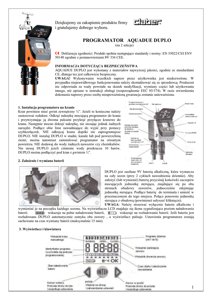 Dziękujemy za zakupienie produktu firmy i gratulujemy dobrego wyboru. PROGRAMATOR AQUADUE DUPLO (na 2 sekcje) Deklaracja zgodności: Produkt spełnia następujące standardy i normy: EN 55022/CEI ENV 50140 zgodnie z postanowieniami 89/ 336 CEE. INFORMACJA DOTYCZĄCA BEZPIECZEŃSTWA AQUADUE DUPLO jest wykonany z materiałów najwyższej jakości, zgodnie ze standardami CE, dlatego tez jest całkowicie bezpieczny. UWAGA! Wykonywanie wszelkich napraw przez użytkownika jest niedozwolone. W przypadku nieprawidłowego funkcjonowania należy skontaktować się ze sprzedawcą. Producent nie odpowiada za wady powstałe na skutek modyfikacji, wymiany części lub użytkowania innego, niż opisane w instrukcji obsługi (rozporządzenie EEC 85/374). W razie stwierdzenia dokonania naprawy przez osobę nieupoważnioną gwarancja zostanie unieważniona. 1. Instalacja programatora na kranie Kran powinien mieć gwint zewnętrzny ¾”. Jeżeli to konieczne należy zastosować reduktor. Odkręć nakrętkę mocującą programator do kranu i przytrzymując ją dwoma palcami przykręć przyłącze kranowe do kranu. Następnie mocno dokręć nakrętkę, nie stosując jednak żadnych narzędzi. Podłącz obie linie nawadniające do wyjść przy pomocy szybkozłączek. NIE odkręcaj kranu dopóki nie zaprogramujesz DUPLO. NIE instaluj DUPLO w studni, kanale lub pod powierzchnią ziemi; można natomiast zainstalować programator na otwartym powietrzu. NIE dodawaj do wody żadnych nawozów czy chemikaliów. Nie stosuj DUPLO jeżeli ciśnienie wody przekracza 10 barów. DUPLO można podłączyć pod kran z gwintem ½”. 2. Założenie i wymiana baterii DUPLO jest zasilane 9V baterią alkaliczną, która wystarcza na cały sezon (przy 2 cyklach nawodnienia dziennie). Aby założyć (lub wymienić) baterię przyciśnij końcówki zaczepów mocujących jednostkę sterująca, znajdujące się po obu stronach obudowy zaworów, jednocześnie zdejmując jednostkę sterująca. Podłącz baterię do terminala i umieść w przeznaczonym do tego miejscu. Połącz ponownie jednostkę sterująca z obudową (powinieneś usłyszeć kliknięcie). UWAGA: Należy stosować wyłącznie baterie alkaliczne i wymieniać je na początku każdego sezonu. Na wyświetlaczu LCD znajduje się ikona sygnalizująca poziom naładowania baterii. wskazuje na pełne naładowanie baterii, wskazuje na rozładowanie baterii. Jeśli bateria jest rozładowana DUPLO automatycznie zamyka oba zawory , a wyświetlacz pulsuje. Ustawienia programatora zostają zachowane na czas wymiany baterii (maksymalnie 15 min). 3. Wyświetlacz i klawiatura 1 4. Przewodnik po programowaniu podstawowym Kiedy tylko podłączymy baterię wszystkie symbole na wyświetlaczu pojawią się na kilka sekund, a następnie pojawi się zegar, wskazując godzinę 00:00. Dwa punkty pomiędzy godziną a minutami pulsują, wskazując, że zegar działa. Pierwszą czynnością jest ustawienia aktualnego czasu. Przyciśnij ENTER. W prawym dolnym rogu pojawi się symbol OK, a dwa punkty pomiędzy cyframi przestaną pulsować. Użyj kursorów aby ustawić odpowiedni czas (na przykład 10:42). Aby szybko przejść do żądanej godziny przytrzymaj odpowiedni kursor. Po wybraniu żądanej godziny zatwierdź wybór przyciskiem ENTER. Symbol OK zniknie. Bieżący czas jest zapamiętany przez programator, a dwa punkty zaczną znowu pulsować. Można teraz przejść do programowania cykli nawadniania. UWAGA: Programator nie posiada żadnych ustawień fabrycznych Dla łatwiejszego zrozumienia przedstawimy proces programowania podstawowego na konkretnym przykładzie: A jeden cykl nawadniania na linii A, od 5:00 do 5:20 (długość nawadniania 20 minut) codziennie B jeden cykl nawadniania na linii B, od 5:30 do 6:10 (długość nawadniania 40 minut) codziennie A. Program na linii A Wyświetlacz pokazuje nam aktualny czas. Przyciśnij jeden raz kursor ► Wyświetlacz pokaże 1 = program 1 (1-sza linia, cykl A), OPEN = czas startu nawadniania, 00:00 = przed zaprogramowaniem czas startu jest ustawiony na 00:00 Naciśnij ENTER żeby przejść do ustawienia czasu startu na linii A. Na wyświetlaczu pokaże się symbol OK, wskazujący nam, że możemy ustawić żądany czas przy pomocy kursorów Użyj kursorów ◄► aby wybrać odpowiednią godzinę (w naszym przykładzie 5:00) U góry ekranu pojawi się symbol programu 1. Zatwierdź wybór przyciskiem ENTER. Symbol OK zniknie. Czas otwarcia zaworu został zapamiętany. Numer programu pozostanie na wyświetlaczu. Przyciśnij jeszcze raz kursor ► Wyświetlacz pokaże 1 = program 1, CLOSED = czas zakończenia nawadniania, 05:01 = DUPLO automatycznie ustawił czas na najkrótszą możliwą długość podlewania tj. 1 minutę. Naciśnij ENTER żeby przejść do ustawienia czasu zakończenia podlewania na linii A. Na wyświetlaczu pokaże się symbol OK, wskazujący nam, że możemy ustawić żądany czas przy pomocy kursorów. Użyj kursorów ◄► aby wybrać odpowiednią godzinę (w naszym przykładzie 5:20) Zatwierdź wybór przyciskiem ENTER. Symbol OK zniknie. Czas zamknięcia zaworu został zapamiętany. Numer programu pozostanie na wyświetlaczu. B. Program na linii B Przyciśnij jeden raz kursor ► Wyświetlacz pokaże 2 = program 2 (1-sza linia, cykl B), OPEN = czas startu nawadniania, 00:00 = przed zaprogramowaniem czas startu jest ustawiony na 00:00 Naciśnij ENTER żeby przejść do ustawienia czasu startu na linii B. Na wyświetlaczu pokaże się symbol OK, wskazujący nam, że możemy ustawić żądany czas przy pomocy kursorów UWAGA: DUPLO automatycznie ustawi najwcześniejszy czas startu dla linii B, tj. 1 minutę po zaprogramowanym już czasie zakończenia nawadniania dla linii A, czyli 05:21 Użyj kursorów ◄► aby wybrać odpowiednią godzinę (w naszym przykładzie 5:30). U góry ekranu pojawi się symbol programu 2. Zatwierdź wybór przyciskiem ENTER. Symbol OK zniknie. Czas otwarcia zaworu na linii B został zapamiętany. Nu