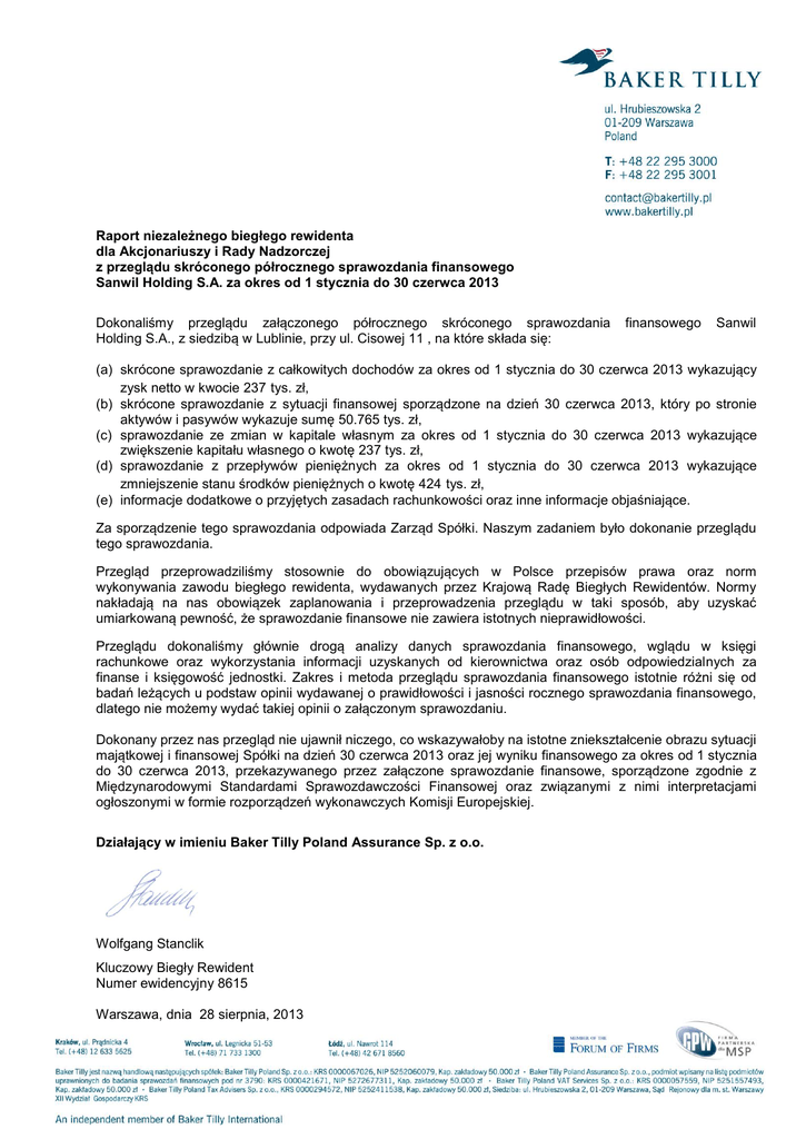 Raport niezależnego biegłego rewidenta dla Akcjonariuszy i Rady Nadzorczej z przeglądu skróconego półrocznego sprawozdania finansowego Sanwil Holding S.A. za okres od 1 stycznia do 30 czerwca 2013 Dokonaliśmy przeglądu załączonego półrocznego skróconego sprawozdania Holding S.A., z siedzibą w Lublinie, przy ul. Cisowej 11 , na które składa się: finansowego Sanwil (a) skrócone sprawozdanie z całkowitych dochodów za okres od 1 stycznia do 30 czerwca 2013 wykazujący zysk netto w kwocie 237 tys. zł, (b) skrócone sprawozdanie z sytuacji finansowej sporządzone na dzień 30 czerwca 2013, który po stronie aktywów i pasywów wykazuje sumę 50.765 tys. zł, (c) sprawozdanie ze zmian w kapitale własnym za okres od 1 stycznia do 30 czerwca 2013 wykazujące zwiększenie kapitału własnego o kwotę 237 tys. zł, (d) sprawozdanie z przepływów pieniężnych za okres od 1 stycznia do 30 czerwca 2013 wykazujące zmniejszenie stanu środków pieniężnych o kwotę 424 tys. zł, (e) informacje dodatkowe o przyjętych zasadach rachunkowości oraz inne informacje objaśniające. Za sporządzenie tego sprawozdania odpowiada Zarząd Spółki. Naszym zadaniem było dokonanie przeglądu tego sprawozdania. Przegląd przeprowadziliśmy stosownie do obowiązujących w Polsce przepisów prawa oraz norm wykonywania zawodu biegłego rewidenta, wydawanych przez Krajową Radę Biegłych Rewidentów. Normy nakładają na nas obowiązek zaplanowania i przeprowadzenia przeglądu w taki sposób, aby uzyskać umiarkowaną pewność, że sprawozdanie finansowe nie zawiera istotnych nieprawidłowości. Przeglądu dokonaliśmy głównie drogą analizy danych sprawozdania finansowego, wglądu w księgi rachunkowe oraz wykorzystania informacji uzyskanych od kierownictwa oraz osób odpowiedzialnych za finanse i księgowość jednostki. Zakres i metoda przeglądu sprawozdania finansowego istotnie różni się od badań leżących u podstaw opinii wydawanej o prawidłowości i jasności rocznego sprawozdania finansowego, dlatego nie możemy wydać takiej opinii o załączonym sprawozdaniu. Dokonany przez nas przegląd nie ujawnił niczego, co wskazywałoby na istotne zniekształcenie obrazu sytuacji majątkowej i finansowej Spółki na dzień 30 czerwca 2013 oraz jej wyniku finansowego za okres od 1 stycznia do 30 czerwca 2013, przekazywanego przez załączone sprawozdanie finansowe, sporządzone zgodnie z Międzynarodowymi Standardami Sprawozdawczości Finansowej oraz związanymi z nimi interpretacjami ogłoszonymi w formie rozporządzeń wykonawczych Komisji Europejskiej. Działający w imieniu Baker Tilly Poland Assurance Sp. z o.o. Wolfgang Stanclik Kluczowy Biegły Rewident Numer ewidencyjny 8615 Warszawa, dnia 28 sierpnia, 2013
