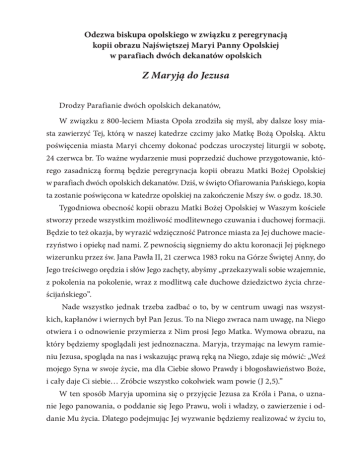 Odezwa biskupa opolskiego w związku z peregrynacją kopii obrazu Najświętszej Maryi Panny Opolskiej w parafiach dwóch dekanatów opolskich Z Maryją do Jezusa Drodzy Parafianie dwóch opolskich dekanatów, W związku z 800-leciem Miasta Opola zrodziła się myśl, aby dalsze losy miasta zawierzyć Tej, którą w naszej katedrze czcimy jako Matkę Bożą Opolską. Aktu poświęcenia miasta Maryi chcemy dokonać podczas uroczystej liturgii w sobotę, 24 czerwca br. To ważne wydarzenie musi poprzedzić duchowe przygotowanie, którego zasadniczą formą będzie peregrynacja kopii obrazu Matki Bożej Opolskiej w parafiach dwóch opolskich dekanatów. Dziś, w święto Ofiarowania Pańskiego, kopia ta zostanie poświęcona w katedrze opolskiej na zakończenie Mszy św. o godz. 18.30. Tygodniowa obecność kopii obrazu Matki Bożej Opolskiej w Waszym kościele stworzy przede wszystkim możliwość modlitewnego czuwania i duchowej formacji. Będzie to też okazja, by wyrazić wdzięczność Patronce miasta za Jej duchowe macierzyństwo i opiekę nad nami. Z pewnością sięgniemy do aktu koronacji Jej pięknego wizerunku przez św. Jana Pawła II, 21 czerwca 1983 roku na Górze Świętej Anny, do Jego treściwego orędzia i słów Jego zachęty, abyśmy „przekazywali sobie wzajemnie, z pokolenia na pokolenie, wraz z modlitwą całe duchowe dziedzictwo życia chrześcijańskiego”. Nade wszystko jednak trzeba zadbać o to, by w centrum uwagi nas wszystkich, kapłanów i wiernych był Pan Jezus. To na Niego zwraca nam uwagę, na Niego otwiera i o odnowienie przymierza z Nim prosi Jego Matka. Wymowa obrazu, na który będziemy spoglądali jest jednoznaczna. Maryja, trzymając na lewym ramieniu Jezusa, spogląda na nas i wskazując prawą ręką na Niego, zdaje się mówić: „Weź mojego Syna w swoje życie, ma dla Ciebie słowo Prawdy i błogosławieństwo Boże, i cały daje Ci siebie… Zróbcie wszystko cokolwiek wam powie (J 2,5).” W ten sposób Maryja upomina się o przyjęcie Jezusa za Króla i Pana, o uznanie Jego panowania, o poddanie się Jego Prawu, woli i władzy, o zawierzenie i oddanie Mu życia. Dlatego podejmując Jej wyzwanie będziemy realizować w życiu to, do czego zobowiązuje nas chrzest święty i co przyrzekliśmy Panu Bogu w Uroczystość Chrystusa Króla Wszechświata proklamując w świątyniach Jubileuszowy Akt Przyjęcia Jezusa za Króla i Pana. Tym sposobem peregrynacja kopii obrazu Matki Bożej Opolskiej, którą będziemy przeżywać pod hasłem: Z Maryją do Jezusa, może się wydatnie przyczynić do intronizacji, czyli wywyższenia Jezusa w naszym życiu, rodzinach i całym mieście. Nasze zasadnicze zadanie dobrze nam objawia relacja Ewangelii o zachowaniu Symeona w świątyni jerozolimskiej. Trzeba jak On, wziąć Jezusa w swoje życie, by w Jego świetle żyć z radością na chwałę Boga. Im więcej spośród nas tego dokona, tym więcej będzie odnowienia Bożego ducha w naszych parafiach i w całym mieście, w wielorakich wymiarach jego życia i funkcjonowania. Nader wymowny jest herb miasta Opola: pół piastowskiego orła i pół krzyża. W ten sposób ujawnia nasze piastowskie i chrześcijańskie korzenie. W świętowaniu 800-lecia Opola nie może więc zabraknąć odwołania się do chrześcijańskiego dziedzictwa, przybliżenia go na nowo i podjęcia wysiłku zmierzającego do odnowy chrześcijańskiej duszy miasta. Pewnym znakiem tej duchowej odnowy może być renowacja naszej opolskiej katedry. Projektujemy jej zakończenie do 2024 roku, kiedy będziemy przeżywać 1000-lecie obecności w naszym mieście relikwii Krzyża Świętego. Niech przeto najbliższe siedem lat będzie czasem wytężonego wysiłku nas wierzących w Chrystusa na rzecz rozwoju Królestwa Bożego pośród nas, w całym mieście, we wszelkich sferach życia. Wszystkich Was do tego, Moi Drodzy bardzo serdecznie i gorąco zapraszam. Owocowanie tego duchowego dzieła zależeć będzie od zaangażowania każdego z nas. Dlatego apeluję do Was wszystkich, dzieci, młodzieży, małżonków, rodziców, osób samotnych i starszych parafian, do członków grup parafialnych, osób konsekrowanych i kapłanów, by w tych szczególnych dniach peregrynacji kopii obrazu Matki Bożej Opolskiej w Waszej parafii nie szczędzić czasu i sił na spotkania modlitewne, konferencje i udział w liturgii. Bardzo też Was proszę, pojednajcie się z Bogiem w sakramencie pokuty i pojednania, i pojednajcie się między sobą, przebaczcie sobie nawzajem. Pojednajmy się wszyscy, by nastał czas pokoju, zgody, dialogu, solidarności, komunii i miłości, i miasto mogło naprawdę przeżywać wielkie święto radości i nadziei. Trwajcie chętnie przed Panem na kolanach, adoracja Najświętszego Sakramentu niech trwa w naszych świątyniach. Niech to będzie czas uwielbienia 2 i dziękczynienia, ale też przebłagania i pokuty, a także upraszania wielu potrzebnych łask całej społeczności miasta, wspólnotom parafialnym i naszym rodzinom. Przywołujmy Ducha Świętego. Módlmy się wiele o moc żywej wiary dla wszystkich mieszkańców miasta, o potrzebne łaski dla jego włodarzy, o ducha miłości i pokoju w rodzinach i naszych sercach, o ducha misyjnego zaangażowania i braterskiego życia w opolskich parafiach. Niech Boży Duch zstąpi na nasze miasto i odnowi jego oblicze, niech nam stale towarzyszy i nas wspomaga we wszelkich poczynaniach na rzecz Jego pomyślności i rozwoju. Wszystkim udzielam pasterskiego błogosławieństwa Wasz biskup † Andrzej Czaja Opole, 31 stycznia 2017 r. -------------------------Niniejszą Odezwę należy odczytać według uznania 2 lutego br. lub w najbliższą niedzielę w dekanatach Opole i Opole-Szczepanowice. Czcigodni kapłani, bardzo Was proszę o zaangażowanie się całym sercem w dzieło, które stanowi konkretną możliwość ewangelizacji i realizacji zobowiązań zawartych w Jubileuszowym Akcie Przyjęcia Jezusa za Króla i Pana. Ponieważ peregryna