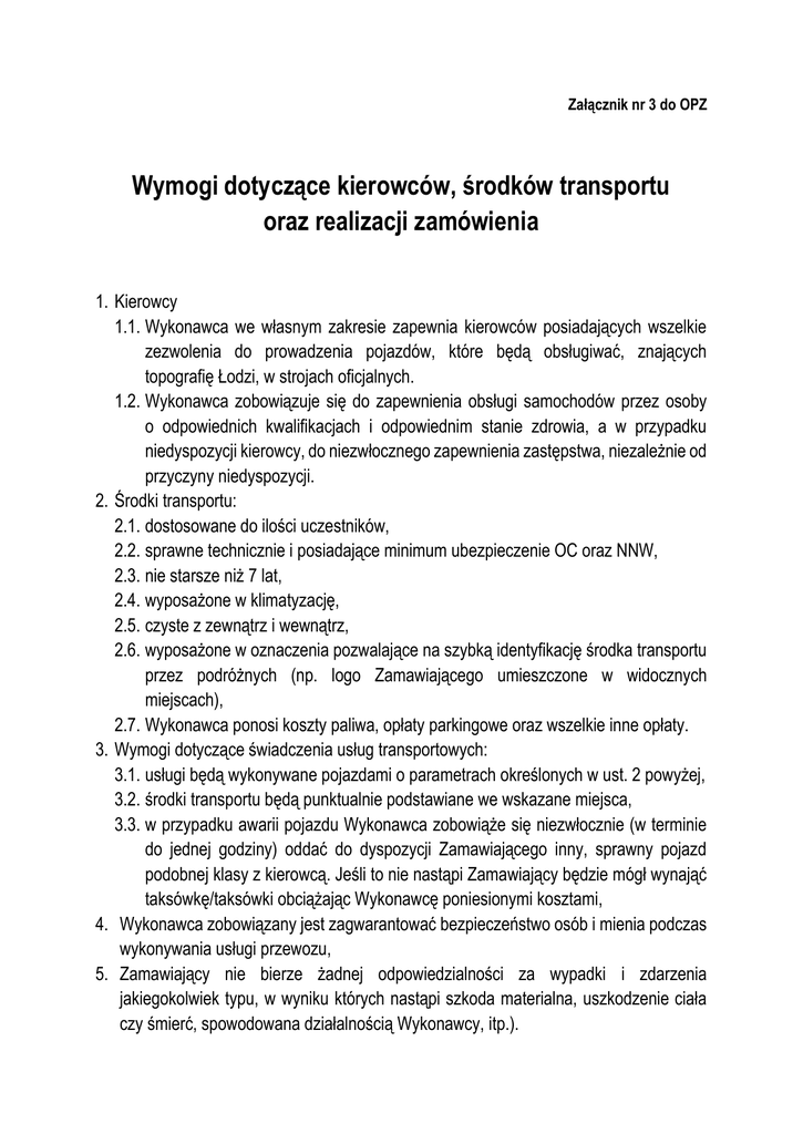 Załącznik nr 3 do OPZ Wymogi dotyczące kierowców, środków transportu oraz realizacji zamówienia 1. Kierowcy 1.1. Wykonawca we własnym zakresie zapewnia kierowców posiadających wszelkie zezwolenia do prowadzenia pojazdów, które będą obsługiwać, znających topografię Łodzi, w strojach oficjalnych. 1.2. Wykonawca zobowiązuje się do zapewnienia obsługi samochodów przez osoby o odpowiednich kwalifikacjach i odpowiednim stanie zdrowia, a w przypadku niedyspozycji kierowcy, do niezwłocznego zapewnienia zastępstwa, niezależnie od przyczyny niedyspozycji. 2. Środki transportu: 2.1. dostosowane do ilości uczestników, 2.2. sprawne technicznie i posiadające minimum ubezpieczenie OC oraz NNW, 2.3. nie starsze niż 7 lat, 2.4. wyposażone w klimatyzację, 2.5. czyste z zewnątrz i wewnątrz, 2.6. wyposażone w oznaczenia pozwalające na szybką identyfikację środka transportu przez podróżnych (np. logo Zamawiającego umieszczone w widocznych miejscach), 2.7. Wykonawca ponosi koszty paliwa, opłaty parkingowe oraz wszelkie inne opłaty. 3. Wymogi dotyczące świadczenia usług transportowych: 3.1. usługi będą wykonywane pojazdami o parametrach określonych w ust. 2 powyżej, 3.2. środki transportu będą punktualnie podstawiane we wskazane miejsca, 3.3. w przypadku awarii pojazdu Wykonawca zobowiąże się niezwłocznie (w terminie do jednej godziny) oddać do dyspozycji Zamawiającego inny, sprawny pojazd podobnej klasy z kierowcą. Jeśli to nie nastąpi Zamawiający będzie mógł wynająć taksówkę/taksówki obciążając Wykonawcę poniesionymi kosztami, 4. Wykonawca zobowiązany jest zagwarantować bezpieczeństwo osób i mienia podczas wykonywania usługi przewozu, 5. Zamawiający nie bierze żadnej odpowiedzialności za wypadki i zdarzenia jakiegokolwiek typu, w wyniku których nastąpi szkoda materialna, uszkodzenie ciała czy śmierć, spowodowana działalnością Wykonawcy, itp.).