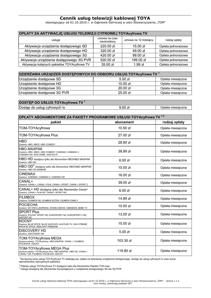 Cennik usług telewizji kablowej TOYA obowiązujący od 01.10.2010 r. w Dąbrowie Górniczej w sieci Stowarzyszenia „TOM” OPŁATY ZA AKTYWACJĘ USŁUGI TELEWIZJI CYFROWEJ TOYAcyfrowa TV usługa Aktywacja urządzenia dostępowego SD Aktywacja urządzenia dostępowego HD Aktywacja urządzenia dostępowego 3G Aktywacja urządzenia dostępowego 3G PVR Aktywacja kolejnych pakietów TOYAcyfrowa TV umowa na czas nieokreślony umowa na 12 miesięcy rodzaj opłaty 220.00 zł 320.00 zł 420.00 zł 520.00 zł 35.00 zł 15.00 zł 49.00 zł 99.00 zł 199.00 zł 1.99 zł Opłata jednorazowa Opłata jednorazowa Opłata jednorazowa Opłata jednorazowa Opłata jednorazowa DZIERŻAWA URZĄDZEŃ DOSTĘPOWYCH DO ODBIORU USŁUG TOYAcyfrowa TV Urządzenie dostępowe SD 5.00 zł Urządzenie dostępowe HD 10.00 zł Urządzenie dostępowe 3G 20.00 zł Urządzenie dostępowe 3G PVR 25.00 zł DOSTĘP DO USŁUG TOYAcyfrowa TV Dostęp do usług cyfrowych tv 1 Opłata miesięczna Opłata miesięczna Opłata miesięczna Opłata miesięczna 1 9.00 zł Opłata miesięczna 1,2 OPŁATY ABONAMENTOWE ZA PAKIETY PROGRAMOWE USŁUGI TOYAcyfrowa TV pakiet abonament rodzaj opłaty TOM-TOYAcyfrowa 10.50 zł Opłata miesięczna TOM-TOYAcyfrowa Plus 27.00 zł Opłata miesięczna HBO 28.90 zł Opłata miesięczna 38.89 zł Opłata miesięczna 6.00 zł Opłata miesięczna 10.00 zł Opłata miesięczna 16.00 zł Opłata miesięczna 39.00 zł Opłata miesięczna 6.00 zł Opłata miesięczna 14.89 zł Opłata miesięczna 10.00 zł Opłata miesięczna 13.00 zł Opłata miesięczna 15.00 zł Opłata miesięczna 5.00 zł Opłata miesięczna 103.30 zł Opłata miesięczna 119.80 zł Opłata miesięczna Zawiera: HBO, HBO2, HBO COMEDY HBO MAXPAK Zawiera: HBO, HBO2, HBO COMEDY, CINEMAX, CINEMAX 2, CINEMAX HD, AXN CRIME, AXN SCI-FI HBO HD dostępny tylko dla Abonentów HBO/HBO MAXPAK Zawiera: HBO HD HBO OD 3 dostępny tylko dla Abonentów HBO/HBO MAXPAK Zawiera: HBO OD DEMAND CINEMAX Zawiera: CINEMAX, CINEMAX 2, CINEMAX HD CANAL+ Zawiera: CANAL+, CANAL+ FILM, CANAL+ SPORT, CANAL+ SPORT 2 CANAL+ HD dostępny tylko dla Abonentów Canal+ Zawiera: CANAL+ FILM HD, CANAL+ SPORT HD FILMBOX Zawiera: FILMBOX HD, FILMBOX EXTRA, FILMBOX FAMILY POCIECHA Zawiera: DA VINCI LEARNING, NICKELODEON, CBEEBIES, BEBE TV SPORT Plus Zawiera: POLSAT SPORT HD, EUROSPORT HD, EUROSPORT 2 HD, NSPORT HD NOCNY Zawiera: BLUE SPICE, BLUE HUSTLER, HUSTLER TV, XXX XTREME, PRIVATE SPICE, REDLIGHT PREMIUM DISCOVERY HD Zawiera: DISCOVERY HD TOM-TOYAcyfrowa MEGA Zawiera pakiety: TOYAcyfrowa, HBO MAXPAK, CANAL+, FILMBOX, POCIECHA, NOCNY TOM-TOYAcyfrowa MEGA Plus Zawiera pakiety: TOYAcyfrowa Plus, HBO MAXPAK, HBO HD, CANAL+, CANAL+ HD, FILMBOX, POCIECHA, NOCNY 1 Na łączną cenę usługi TOYAcyfrowa TV składają się: opłata za dzierżawę urządzenia dostępowego, dostęp do usług cyfrowych tv oraz suma abonamentów wykupionych pakietów. 2 3 Pakiety usługi TOYAcyfrowa TV dostępne tylko dla Abonentów Pakietu TVK-max. Usługa dostępna dla Abonentów korzystających z urządzenia dostępowego 3G lub 3G PVR Cennik usługi telewizji kablowej TOYA obowiązujący od 01.10.2010 r. w Dąbrowie Górniczej w sieci Stowarzyszenia „TOM” – strona 1 z 2 ceny brutto, zawierają podatek VAT Wymiana urządzeń dostępowych umowa na czas nieokreślony Wymiana urządzenia dostępowego SD na urządzenie dostępowe HD Wymiana urządzenia dostępowego SD urządzenie dostępowe 3G Wymiana urządzenia dostępowego SD urządzenie dostępowe 3G PVR Wymiana urządzenia dostępowego HD urządzenie dostępowe 3G Wymiana urządzenia dostępowego HD urządzenie dostępowe 3G PVR Wymiana urządzenia dostępowego 3G urządzenie dostępowe 3G PVR umowa na 12 miesięcy rodzaj opłaty 200.00 zł 49.00 zł Opłata jednorazowa 299.00 zł 99.00 zł Opłata jednorazowa 499.00 zł 199.00 zł Opłata jednorazowa 199.00 zł 49.00 zł Opłata jednorazowa 399.00 zł 149.00 zł Opłata jednorazowa 399.00 zł 99.00 zł Opłata jednorazowa INNE OPŁATY kwota Zawieszenie usługi TOYAcyfrowa TV bezpłatnie Wznowienie usługi TOYAcyfrowa TV 35.00 zł Jednorazowa opłata za powiadomienie wynikające z przekroczenia terminu płatności lub płatności w zaniżonej wysokości Kaucja za urządzenie dostępowe 5.00 zł 500.00 zł Zmiana Abonenta w lokalu: • gdy w mieszkaniu jest wykonana instalacja Stowarzyszenia „TOM” , a nowy lokator kontynuuje usługi TOYA – bezpłatnie, • gdy w mieszkaniu jest wykonana instalacja Stowarzyszenia „TOM”, a nowy lokator wznawia usługi TOYA – 35.00 zł. Zmiana miejsca świadczenia Usług: • gdy w mieszkaniu brak jest Przyłącza Stowarzyszenia „TOM”, które jest możliwe do wykonania, a Abonent w poprzednim mieszkaniu posiadał Przyłącze - wg stawki wykonania Przyłącza do sieci Stowarzyszenia „TOM” , • gdy w mieszkaniu jest Przyłącze Stowarzyszenia „TOM” – 35.00 zł . Konserwacja Przyłącza • usterki (awarie z winy TOYA/ Stowarzyszenia „TOM” lub niezależne od TOYA/ Stowarzyszenia „TOM”) bezpłatnie, • usterki w mieszkaniu z winy Abonenta – 30.00 – 50.00 zł, • dewastacje z winy Abonenta - wg rzeczywistych kosztów. DODATKOWE ZESTAWY DO PODŁĄCZENIA TOYAcyfrowa TV Do podłączenia 1-szego TV po modulatorze (urządzenie dostępowe SD): Mostek ( kabel 16 cm z końcówkami IEC nakręconymi na złącze typu "F") Do podłączenia 2-ch telewizorów po modulatorze (urządzenie dostępowe SD): Rozgałęźnik podwójny z nasadkami IEC + kabel łączący modulator z rozgałęźnikiem na wyjściu (18 cm) + mostek Do podłączenia 3-ch telewizorów po modulatorze (urządzenie dostępowe SD): Rozgałęźnik potrójny z nasadkami IEC + kabel łączący modulator z rozgałęźnikiem na wyjściu (18 cm) + mostek kwota 8.00 zł 26.00 zł 32.00 zł Rozgałęźnik z nasadkami IEC (urządzenie dostępowe SD) 10.00 zł Rozgałęźnik potrójny z nasadkami IEC (urządzenie dostępowe SD) 15.99 zł Mostek. kabel od modulatora do rozgałęźnika (urz