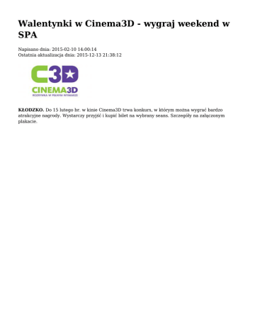 Walentynki w Cinema3D - wygraj weekend w SPA Napisano dnia: 2015-02-10 14:00:14 Ostatnia aktualizacja dnia: 2015-12-13 21:38:12 KŁODZKO. Do 15 lutego br. w kinie Cinema3D trwa konkurs, w którym można wygrać bardzo atrakcyjne nagrody. Wystarczy przyjść i kupić bilet na wybrany seans. Szczegóły na załączonym plakacie.