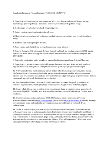 Regulamin Konkursu Fotograficznego „TURECKIE KLIMATY” 1. Organizatorem konkursu jest stowarzyszenie Inicel oraz Starostwo Powiatu Warszawskiego Zachodniego przy współpracy i patronacie honorowym Ambasady Republiki Turcji. 2. Konkurs jest otwarty dla wszystkich fotografujących. 3. Każdy z autorów może nadesłać do dwóch prac. 4.Zdjęcia powinny przedstawiać krajobrazy, atrakcje turystyczne, zabytki oraz życie kulturalne w Turcji. 5. Technika wykonania prac jest dowolna. 6. Prace należy nadsyłać jedynie poczta elektroniczną przez Internet. 7. Prace w formacie JPG w formacie 2:3 min 8 mpx i w plikach nie przekraczających 10MB należy nadsyłać na adres [email protected] w formie załączników do listu elektronicznego do dnia 25.08.2013r. 8. Fotografie zawierające treści obraźliwe, niemoralne lub nieetyczne będą dyskwalifikowane. 9. Organizatorzy konkursu zastrzegają sobie prawo do odrzucenia prac, które nie będą zgodne z regulaminem, będą odbiegały od tematyki lub nie będą spełniały wymogów technicznych. 10. W treści maila /listu elektronicznego należy podać: tytuł pracy, imię i nazwisko, adres autora, telefon kontaktowy, komentarz do zdjęcia, nazwę fotografowanego obiektu, miejsce wykonania zdjęcia, oraz oświadczenie o posiadaniu praw autorskich do zdjęć oraz zgodę na przetwarzanie danych osobowych, zgodnie z zał. do niniejszego regulaminu 11. Przesłane pliki nie będą zwracane. Z chwilą nadesłania prawa do fotografii przechodzą na własność organizatorów, którzy przejmują autorskie prawa majątkowe do nadesłanych prac. 12. Oceny zdjęć dokona jury powołane przez organizatora. Będą to przedstawiciele grupy Inicel, Ambasady Republiki Tureckiej oraz Starostwa Powiatu Warszawsko-Zachodniego. Decyzje jury są ostateczne. 13. Wyniki konkursu zostaną ogłoszone 30.08.2013 roku na stronie internetowej Powiatu Warszawskiego Zachodniegohttp://www.pwz.pl/, gminy Błoniehttp://www.blonie.pl/ oraz na fanpagu stowarzyszenia Inicel na Facebooku. Zwycięzcy zostaną powiadomieni o wynikach drogą elektroniczną. 14. Udział w konkursie jest jednoznaczny z nieodpłatnym udzieleniem prawa do nieodpłatnego wykorzystywania prac w następujących polach eksploatacji: druku w dowolnej liczbie publikacji i w dowolnym nakładzie, używania ich w Internecie oraz w innych formach utrwaleń, nadających się do rozpowszechniania w ramach działań grupy Inicel, Ambasady Republiki Turcji, Starostwa Powiatu Warszawsko-Zachodniego oraz stowarzyszenia„Między Wisłą a Kampinosem”. Wszystkie prace udostępnione lub powielone będą zawierały informację o autorze. 15. Organizatorzy przewidują jedną nagrodę główną – wycieczka do Turcji oraz dwie równorzędne atrakcyjne nagrody rzeczowe.Nagrody rzeczowe nie podlegają zamianie na inne ani zamianie na ekwiwalent pieniężny. 16. Wręczenie nagród odbędzie się 07.09.13 roku podczas pikniku tureckiego. W przypadku braku możliwości odebrania nagrody w wyznaczonym terminie, ustalony zostanie termin indywidualny. 17. Nadesłanie prac oznacza akceptację warunków konkursu i regulaminu, którego ostateczna interpretacja należy do jury konkursu. Żadne odwołania nie zostaną uwzględnione. 18. Organizator zastrzega sobie prawo do przerwania lub odwołania konkursu. 19. Udział w konkursie jest równoznaczny z wyrażeniem przez osoby uczestniczące zgody na przetwarzanie przez organizatora ich danych osobowych na potrzeby konkursu oraz w celach marketingowych organizatora/ustawa o ochronie danych osobowych z dn.29.08.1997 r. Dz.U. Nr 133 poz.833 z póz. zm./.Osoby uczestniczące w konkursie potwierdzają swoją zgodę na powyższe w formie przesłania do organizatora oświadczenia zgodnie z zał. do niniejszego regulaminu. Załącznik Nr 1 OŚWIADCZENIE o przeniesieniu praw autorskich Imię ..................................................................................................... Nazwisko ............................................................................................. Adres zamieszkania ............................................................................. ............................................................................................................. Oświadczam, że: a) jestem autorem i twórcą fotografii nadesłanych na Konkurs Fotograficzny „ TURECKIE KLIMATY” b) do fotografii tych przysługują mi na wyłączność i w sposób nieograniczony wszelkie prawa, w tym nieograniczone autorskie prawa majątkowe; c) dzieło zostało stworzone przeze mnie bez udziału osób trzecich oraz nie zaciągnąłem do dnia dzisiejszego jakichkolwiek zobowiązań, które ograniczałyby lub wyłączały moje prawo do przeniesienia przysługujących mi praw na organizatora Konkursu Fotograficznego „ TURECKIE KLIMATY”; d) dzieło stanowi w całości utwór oryginalny, nie narusza praw autorskich osób trzecich, jest wolne od jakichkolwiek zapożyczeń oraz nie mają miejsca żadne inne okoliczności, które mogłyby narazić organizatora konkursu na odpowiedzialność wobec osób trzecich z tytułu korzystania lub rozpowszechniania dzieła; e) przenoszę na organizatora Konkursu Fotograficznego „TURECKIE KLIMATY” wszelkie znane w chwili zaakceptowania niniejszego regulaminu prawa autorskie majątkowe, dotyczące dzieła, o którym mowa w pkt. a), w szczególności: 1)prawo powielania fotografii każdą znaną techniką, w tym drukarską, reprograficzną, zapisu magnetycznego oraz techniką cyfrową; 2) prawo obrotu oryginałem albo egzemplarzami, na których fotografię utrwalono, w tym prawo wprowadzania do obrotu, użyczenia lub najmu oryginału albo egzemplarzy; 3) prawo rozpowszechniania fotografii w każdy znany sposób, w tym prawo publicznego wykonania, wystawienia, wyświetlenia, odtworzenia oraz publicznego udostępnianie utworu w taki sposób, aby każdy mógł mieć do niego dostęp w miejscu i w czasie przez siebie wybranym.; f) przeniesieni