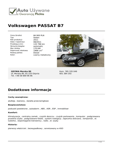 Volkswagen PASSAT B7 Cena (brutto) Typ: Rok produkcji: Data I rejestracji: Przebieg w km: Skrzynia biegów: Moc silnika: Pojemność skokowa: Rodzaj paliwa: Kolor: 66 900 PLN Sedan 2011 08/2011 133 796 km automatic 170 KM 1968 cm3 Diesel czarny metaliczny GDYNIA Morska 80 Ul. Morska 80, 81-225 Gdynia Tel. +48 58 669 96 96 Kom. 785 335 049 601 384 202 Dodatkowe informacje Cechy zewnętrzne: alufelgi , ksenony , światła przeciwmgłowe Bezpieczeństwo: poduszki powietrzne , autoalarm , ABS , ASR , ESP , immobiliser Komfort: klimatyzacja , centralny zamek , czujnik deszczu , czujnik parkowania , komputer , podgrzewana przednia szyba , podgrzewane fotele , system nawigacji , tapicerka skórzana , tempomat , el. lusterka , wspomaganie kierownicy , radio , el. szyby Historia: pierwszy właściciel , bezwypadkowy , serwisowany w ASO 1/2 Gwarancja Szanowni Państwo, Pragniemy Państwa poinformować, iż firma Plichta – Autoryzowany Dealer Škoda Auto prowadzi skup oraz sprzedaż samochodów używanych wszystkich marek, oferując także samochody używane z gwarancją objęte programem „Auta używane z Gwarancją Plichta”. W ramach programu „Auta Używane z Gwarancją Plichta ” każdy Klient otrzymuje atrakcyjny pakiet zniżek pozwalający zoptymalizować koszty eksploatacji samochodu: -50% na serwis klimatyzacji -50% na ustawienie zbieżności -50% na kosmetykę auta -50% na ścieżkę diagnostyczną -25% na wymiany oleju -25% na zakup opon + 5zł na sezon za hotelowanie opon -15% na części i akcesoria Oferujemy również kompleksową obsługę w zakresie finansowania i ubezpieczenia: - kredyty już od 4,99% - leasingi i kredyty bez zaświadczeń - uproszczone procedury – decyzja już od 30 min. - atrakcyjne pakiety AC/OC/NW/ASS wiodących firm ubezpieczeniowych Możliwość pozostawienia dotychczas użytkowanego auta w rozliczeniu – BEZPŁATNA WYCENA!!! Zapraszamy wszystkich Klientów na jazdę próbną wybranym autem. Numer oferty: B 825 Informacja nie stanowi oferty w rozumieniu art. 66 KC. Podane dane mają charakter wyłącznie informacyjny. 2/2 Powered by TCPDF (www.tcpdf.org)