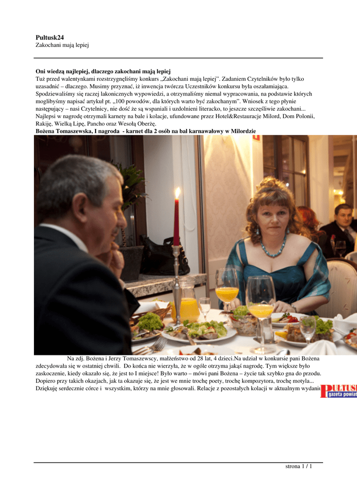 Pultusk24 Zakochani mają lepiej Oni wiedzą najlepiej, dlaczego zakochani mają lepiej Tuż przed walentynkami rozstrzygnęliśmy konkurs „Zakochani mają lepiej”. Zadaniem Czytelników było tylko uzasadnić – dlaczego. Musimy przyznać, iż inwencja twórcza Uczestników konkursu była oszałamiająca. Spodziewaliśmy się raczej lakonicznych wypowiedzi, a otrzymaliśmy niemal wypracowania, na podstawie których moglibyśmy napisać artykuł pt. „100 powodów, dla których warto być zakochanym”. Wniosek z tego płynie następujący – nasi Czytelnicy, nie dość że są wspaniali i uzdolnieni literacko, to jeszcze szczęśliwie zakochani... Najlepsi w nagrodę otrzymali karnety na bale i kolacje, ufundowane przez Hotel&Restauracje Milord, Dom Polonii, Rakiję, Wielką Lipę, Pancho oraz Wesołą Oberżę. Bożena Tomaszewska, I nagroda - karnet dla 2 osób na bal karnawałowy w Milordzie Na zdj. Bożena i Jerzy Tomaszewscy, małżeństwo od 28 lat, 4 dzieci.Na udział w konkursie pani Bożena zdecydowała się w ostatniej chwili. Do końca nie wierzyła, że w ogóle otrzyma jakąś nagrodę. Tym większe było zaskoczenie, kiedy okazało się, że jest to I miejsce! Było warto – mówi pani Bożena – życie tak szybko gna do przodu. Dopiero przy takich okazjach, jak ta okazuje się, że jest we mnie trochę poety, trochę kompozytora, trochę motyla... Dziękuję serdecznie córce i wszystkim, którzy na mnie głosowali. Relacje z pozostałych kolacji w aktualnym wydaniu strona 1 / 1