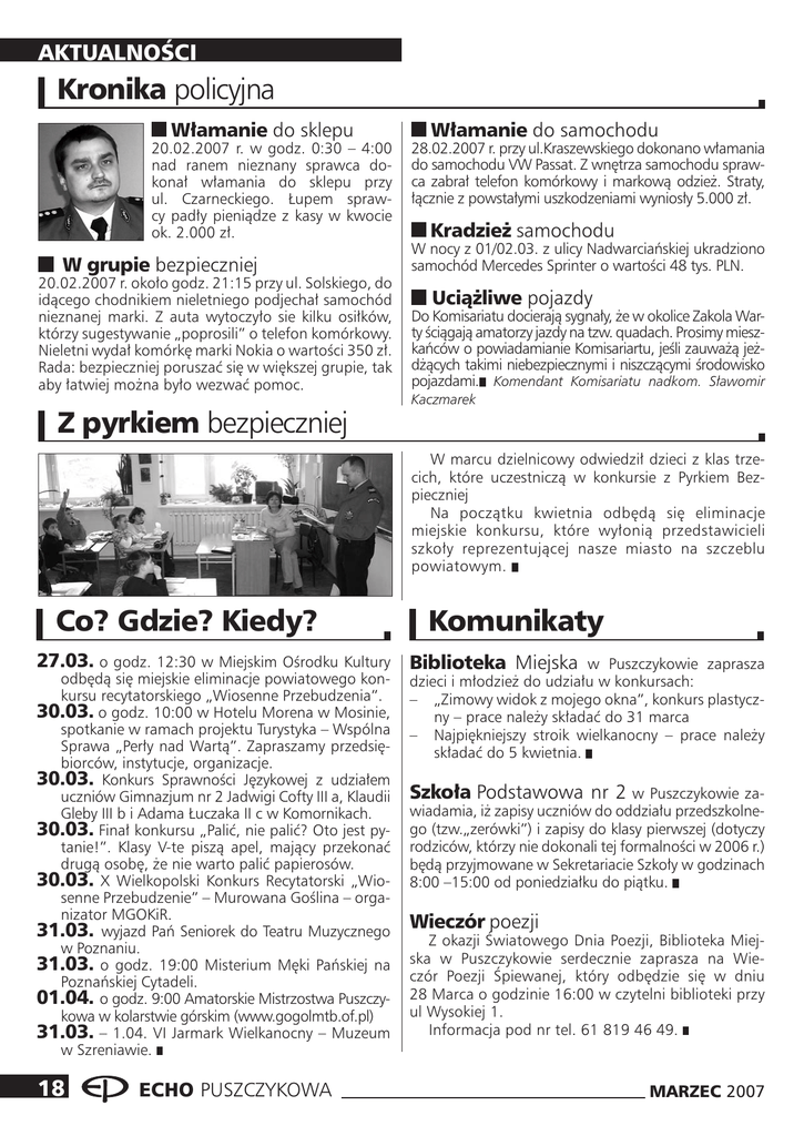 AKTUALNOŚCI Kronika policyjna Włamanie do sklepu 20.02.2007 r. w godz. 0:30 – 4:00 nad ranem nieznany sprawca dokonał włamania do sklepu przy ul. Czarneckiego. Łupem sprawcy padły pieniądze z kasy w kwocie ok. 2.000 zł. W grupie bezpieczniej 20.02.2007 r. około godz. 21:15 przy ul. Solskiego, do idącego chodnikiem nieletniego podjechał samochód nieznanej marki. Z auta wytoczyło sie kilku osiłków, którzy sugestywanie „poprosili” o telefon komórkowy. Nieletni wydał komórkę marki Nokia o wartości 350 zł. Rada: bezpieczniej poruszać się w większej grupie, tak aby łatwiej można było wezwać pomoc. Z pyrkiem bezpieczniej Włamanie do samochodu 28.02.2007 r. przy ul.Kraszewskiego dokonano włamania do samochodu VW Passat. Z wnętrza samochodu sprawca zabrał telefon komórkowy i markową odzież. Straty, łącznie z powstałymi uszkodzeniami wyniosły 5.000 zł. Kradzież samochodu W nocy z 01/02.03. z ulicy Nadwarciańskiej ukradziono samochód Mercedes Sprinter o wartości 48 tys. PLN. Uciążliwe pojazdy Do Komisariatu docierają sygnały, że w okolice Zakola Warty ściągają amatorzy jazdy na tzw. quadach. Prosimy mieszkańców o powiadamianie Komisariartu, jeśli zauważą jeżdżących takimi niebezpiecznymi i niszczącymi środowisko pojazdami. Komendant Komisariatu nadkom. Sławomir Kaczmarek W marcu dzielnicowy odwiedził dzieci z klas trzecich, które uczestniczą w konkursie z Pyrkiem Bezpieczniej Na początku kwietnia odbędą się eliminacje miejskie konkursu, które wyłonią przedstawicieli szkoły reprezentującej nasze miasto na szczeblu powiatowym. Co? Gdzie? Kiedy? 27.03. o godz. 12:30 w Miejskim Ośrodku Kultury odbędą się miejskie eliminacje powiatowego konkursu recytatorskiego „Wiosenne Przebudzenia”. 30.03. o godz. 10:00 w Hotelu Morena w Mosinie, spotkanie w ramach projektu Turystyka – Wspólna Sprawa „Perły nad Wartą”. Zapraszamy przedsiębiorców, instytucje, organizacje. 30.03. Konkurs Sprawności Językowej z udziałem uczniów Gimnazjum nr 2 Jadwigi Cofty III a, Klaudii Gleby III b i Adama Łuczaka II c w Komornikach. 30.03. Finał konkursu „Palić, nie palić? Oto jest pytanie!”. Klasy V-te piszą apel, mający przekonać drugą osobę, że nie warto palić papierosów. 30.03. X Wielkopolski Konkurs Recytatorski „Wiosenne Przebudzenie” – Murowana Goślina – organizator MGOKiR. 31.03. wyjazd Pań Seniorek do Teatru Muzycznego w Poznaniu. 31.03. o godz. 19:00 Misterium Męki Pańskiej na Poznańskiej Cytadeli. 01.04. o godz. 9:00 Amatorskie Mistrzostwa Puszczykowa w kolarstwie górskim (www.gogolmtb.of.pl) 31.03. – 1.04. VI Jarmark Wielkanocny – Muzeum w Szreniawie. 18 ECHO PUSZCZYKOWA Komunikaty Biblioteka Miejska w Puszczykowie zaprasza dzieci i młodzież do udziału w konkursach: – „Zimowy widok z mojego okna”, konkurs plastyczny – prace należy składać do 31 marca – Najpiękniejszy stroik wielkanocny – prace należy składać do 5 kwietnia. Szkoła Podstawowa nr 2 w Puszczykowie za- wiadamia, iż zapisy uczniów do oddziału przedszkolnego (tzw.„zerówki”) i zapisy do klasy pierwszej (dotyczy rodziców, którzy nie dokonali tej formalności w 2006 r.) będą przyjmowane w Sekretariacie Szkoły w godzinach 8:00 –15:00 od poniedziałku do piątku. Wieczór poezji Z okazji Światowego Dnia Poezji, Biblioteka Miejska w Puszczykowie serdecznie zaprasza na Wieczór Poezji Śpiewanej, który odbędzie się w dniu 28 Marca o godzinie 16:00 w czytelni biblioteki przy ul Wysokiej 1. Informacja pod nr tel. 61 819 46 49. MARZEC 2007
