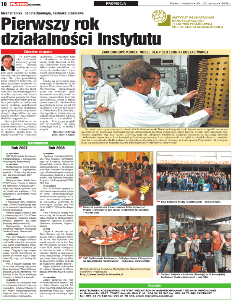 10 PROMOCJA Pi¹tek – niedziela • 20 – 22 czerwca • 2008 r. Mechatronika, nanotechnologia, technika pró¿niowa Pierwszy rok dzia³alnoœci Instytutu Zdaniem eksperta studentów. Gwarantuje nam to cz³onkostwo w Stowarzyszeniu Baltic Network of Plasma Technology, które zrzesza kilkadziesi¹t oœrodków naukowych, akademickich i jednostek gospodarczych z Euroregionu Basenu Morza Ba³tyckiego. Studia na pierwszym roku rozpoczê³o 14 studentów na In¿ynierii Materia³owej oraz 24 na Mechatronice. Przygotowana przez nas atrakcyjna oferta kszta³cenia oraz aktywnoœæ naukowa pracowników Instytutu spowodowa³a, ¿e ju¿ w trakcie pierwszego roku akademickiego zg³osi³o siê do nas ponad 100 studentów z innych kierunków na Politechnice Koszaliñskiej, z chêci¹ podjêcia studiów równoleg³ych (drugi fakultet) lub kontynuowania u nas studiów II stopnia. Z tej grupy przyjêliœmy 30 studentów na studia równolegle oraz 20 na studia II stopnia. Dyrektor Instytutu prof. Jerzy Ratajski Kalendarium Rok 2007 Rok 2008 • czerwiec XXV Ogólnopolska Konferencja „Polioptymalizacja i Komputerowe Wspomaganie Projektowania” • sierpieñ Miêdzynarodowa Letnia Szko³a Nanotechnologii organizowana wspólnie z Politechnik¹ Warszawsk¹, Warszawa-Koszalin 2007 • wrzesieñ Miedzynarodowa Szko³a letnia „PPST-Plasma Physics in Science and Technology”, Greifswald 2007 – Instytut jako wspó³organizator i partner projektu we wspó³pracy z Uniwersytetami w Greifswaldzie, Kilonii i Pradze. • paŸdziernik I Inauguracja Roku Akademickiego. Studenci rozpoczynaj¹ zajêcia na kierunkach Mechatronika i In¿ynieria Materia³owa. Pierwsze zajêcia w klasie o profilu politechnicznym w I LO im. S Dubois w Koszalinie. Pracownicy Instytutu prowadz¹ przedmiot pod nazw¹ „Podstawy wiedzy technicznej”. Ogólnopolska konferencja: „Pró¿niowo-Plazmowe Technologie Cienkich Warstw”, Mielno 2007 • listopad Prof. Jerzy Ratajski z zespo³em zdobyli medal na targach wynalazczoœci w Norymberdze za komputerowy system wspomagaj¹cy projektowanie procesów azotowania gazowego. Osi¹gniêcia tego zespo³u zosta³y równie¿ uhonorowane dyplomem od ministra Nauki i Szkolnictwa Wy¿szego prof. Barbary Kudryckiej. Prof. J. Ratajski wyg³asza referat na sesji plenarnej miêdzynarodowej konferencji “Thermal Processing and Surface Engineering: Key Activities in the Global Knowledge Economy” w Brisbane w Australii. • grudzieñ Warsztaty dla nauczycieli fizyki oraz studentów Instytutu po³¹czone z wyk³adami i wizyt¹ w Instytucie Fizyki Plazmy Niskotemperaturowej, Instytucie Max’a Planck’a oraz na Uniwersytecie w Greifswaldzie. • marzec Spotkanie przedstawicieli Instytutu, Parku Naukowo-Technologicznego ze Szczecina, Politechniki Szczeciñskiej, Instututu Plazmy Niskotemperaturowej z Greifswaldu oraz Parku Naukowo-Technologicznego z Greifswaldu podsumowuj¹ce transgraniczne dzia³ania w ramach projektu sieæ BalticNet PlasmaTec Programu Unii Europejskiej INTERREG IIIIA. • kwiecieñ Prof. W. Gulbiñski wygasza na zaproszenie organizatorów wyk³ad na temat nanokompozytowych warstw przeciwzu¿yciowych w ramach renomowanej konferencji: 35 International Conference on Metallurgical Coatings and Thin Films ICMCTF 2008 w San Diego, USA. Fina³ I Konkursu Wiedzy Politechnicznej. W konkursie bierze udzia³ m³odzie¿ ze szkó³ ponadgimnazjalnych Koszalina, Szczecina, Goleniowa, Szczecinka, S³upska i Miastka. • maj Zespó³ w sk³adzie mgr in¿. Adam Gilewicz, mgr in¿. Bogdan Goluch, mgr in¿. Zbigniew Kukliñski, dr in¿. Piotr Myœliñski – kierownik zespo³u oraz dr in¿. Bogdan Warcholiñski uzyska³ w konkursie NOT „Nowe rozwi¹zania w dziedzinie techniki za 2007rok” nagrodê I stopnia za opracowanie oferty wdro¿eniowej: „Pró¿niowo-plazmowa technologia modyfikacji powierzchni roboczej narzêdzi do maszynowej obróbki drewna”. Wyjazd studentów i doktorantów do Lujbljany (S³owenia) na III Europejsk¹ Konferencjê Nauki o Materia³ach. • czerwiec Zespó³ badawczy in¿. Piotr Myœliñski (kierownik zespo³u), mgr in¿. Adam Gilewicz, mgr in¿. Zbigniew Kukliñski zdoby³ Zachodniopomorskiego Nobla 2007, najwa¿niejsz¹ nagrodê naukow¹ w regionie. ZACHODNIOPOMORSKI NOBEL DLA POLITECHNIKI KOSZALIÑSKIEJ Fot. Kamil Jurkowski Po pierwszym roku dzia³alnoœci, kierowany przeze mnie Instytut znajduje siê w stanie ,,wrzenia”, przy czym staramy siê dobrze wykonaæ za³o¿on¹ strategiê rozwoju. Nie tylko prowadzimy prace naukowo-badawcze, ale tak¿e kszta³cimy studentów na wysokim poziomie. Jednoczeœnie staramy siê, aby nasi absolwenci byli idealnie przygotowani wobec wyzwañ, jakie stawia wspó³czesna gospodarka. Zainteresowanie Instytutem jest du¿e, a potencjalni przyszli pracodawcy deklaruj¹ wspó³uczestnictwo w procesie kszta³cenia np. w postaci; praktyk przemys³owych, stypendiów, czy propozycji tematów prac in¿ynierskich lub magisterskich. Wa¿ne jest tak¿e to, ¿e nadajemy procesowi kszta³cenia tryb niestandardowy, zmierzaj¹c w kierunku indywidualizacji studiów, opartej m.in. na miêdzynarodowej wymianie To presti¿owe regionalne wyró¿nienie (Zachodniopomorski Nobel w kategorii nauki techniczne) przypad³o na pocz¹tku czerwca br. zespo³owi Œrodowiskowego Laboratorium Techniki Pró¿niowej, który tworz¹: dr in¿. Piotr Myœliñski (kierownik zespo³u), mgr in¿. Adam Gilewicz, mgr in¿. Zbigniew Kukliñski. Nagrodê otrzymali za realizacjê projektu: „Wdro¿enie nowoczesnych technologii pró¿niowo-plazmowych w wytwarzaniu narzêdzi do obróbki drewna i materia³ów drewnopochodnych dla potrzeb przemys³u meblarskiego i leœno-drzewnego w Euroregionie Pomerania”. Wyniki projektu s¹ przedmiotem zainteresowania przedsiêbiorstw przemys³u drzewnego. Fina³ Konkursu Wiedzy Politechnicznej – kwiecieñ 2008. Coroczne posiedzenie Stowarzyszenia Baltic Network of Plasma Technology w sali senatu Politechniki Koszaliñskiej – marzec 2008. XXVI