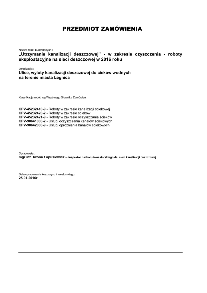 PRZEDMIOT ZAMÓWIENIA Nazwa robót budowlanych : „Utrzymanie kanalizacji deszczowej” - w zakresie czyszczenia - roboty eksploatacyjne na sieci deszczowej w 2016 roku Lokalizacja : Ulice, wyloty kanalizacji deszczowej do cieków wodnych na terenie miasta Legnica Klasyfikacja robót wg Wspólnego Słownika Zamówień : CPV-45232410-9 - Roboty w zakresie kanalizacji ściekowej CPV-45232420-2 - Roboty w zakresie ścieków CPV-45232421-9 - Roboty w zakresie oczyszczania ścieków CPV-90641000-2 - Usługi oczyszczania kanałów ściekowych CPV-90642000-9 - Usługi opróżniania kanałów ściekowych Opracowała : mgr inż. Iwona Łopusiewicz – inspektor nadzoru inwestorskiego ds. sieci kanalizacji deszczowej Data opracowania kosztorysu inwestorskiego: 25.01.2016r Przedmiot zamówienia Zamówienie obejmuje kompleks działań zapewniających stały i nieprzerwany odbiór odprowadzanych z powierzchni wód opadowych a w szczególności udrażnianie sieci na terenie Miasta Legnica. Zakres usług dotyczy terenów będących w Zarządzie Dróg Miejskich. Zakres usług związanych z realizacją zamówienia obejmuje: 1. Bieżące utrzymanie urządzeń kanalizacji deszczowej w zakresie czyszczenia sieci – eksploatacja: a) mechaniczne i ręczne czyszczenie studzienek wpustów deszczowych, wyczyszczenie jednego wpustu ulicznego obejmuje: dojazd na miejsce wykonania usługi, oznakowanie miejsca robót, ustawienie barier ochronnych, zdjęcie kratki ściekowej, wyczyszczenie studzienki, wydobycie osadów i gruzu, założenie kratki, demontaż barier zabezpieczających, zebranie i wywóz zanieczyszczeń, uporządkowanie terenu, utylizacja odpadów zgodnie z ustawą o odpadach dostarczenie zleceniodawcy wyników czyszczenia studzienek. Podstawą rozliczenia wykonanych prac będzie protokół odbioru technicznego robót (protokół nr 1) wraz z wypełnioną tabelą ( tabela nr 1), b) mechaniczne czyszczenie studzienek wpustów deszczowych wraz z przykanalikami, wyczyszczenie jednego wpustu ulicznego wraz z przykanalikiem obejmuje: dojazd na miejsce wykonania usługi, oznakowanie miejsca robót, ustawienie barier ochronnych, zdjęcie kratki ściekowej, wyczyszczenie studzienki, udrożnienie przykanalika (czyszczenie agregatem cisnieniowym), wydobycie osadów i gruzu, założenie kratki, demontaż barier zabezpieczających, zebranie i wywóz zanieczyszczeń, uporządkowanie terenu, utylizacja odpadów zgodnie z ustawą o odpadach dostarczenie zleceniodawcy wyników czyszczenia studzienek. Podstawą rozliczenia wykonanych prac będzie protokół odbioru technicznego robót (protokół odbioru nr 1) wraz z wypełnioną tabelą (tabela nr 1), c) mechaniczne i ręczne czyszczenie studni kanalizacji deszczowej o średnicy powyżej 1000mm, wyczyszczenie jednej studni obejmuje: dojazd na miejsce wykonania usługi, oznakowanie miejsca robót, ustawienie barier ochronnych, zdjęcie włazu, otwarcie studni, wyczyszczenie studni, wydobycie osadów i gruzu, założenie włazu, demontaż barier zabezpieczających, zebranie i wywóz zanieczyszczeń, uporządkowanie terenu, utylizacja odpadów zgodnie z ustawą o odpadach dostarczenie zleceniodawcy wyników czyszczenia studzienek. Podstawą rozliczenia wykonanych prac będzie protokół odbioru technicznego robót (protokół odbioru nr 1) wraz z wypełnioną tabelą (tabela nr 1), d) hydrodynamiczne czyszczenie sieci kanalizacji deszczowej z systemem odzysku wody o średnicy do 500 mm, wyczyszczenie sieci kanalizacji deszczowej obejmuje: dojazd na miejsce wykonania usługi, oznakowanie miejsca robót, ustawienie barier ochronnych, zdjęcie włazu, otwarcie studni, wykonanie kompleksowego czyszczenia sieci kanalizacji deszczowej z wykazem wszelkich osadów i przeszkód, wydobycie osadów i gruzu, wykonanie inspekcji TV-monitoringu wizyjnego oczyszczonej sieci kanalizacji deszczowej, założenie włazu, demontaż barier zabezpieczających, zebranie i wywóz zanieczyszczeń, uporządkowanie terenu, utylizacja odpadów zgodnie z ustawą o odpadach, dostarczenie zleceniodawcy wyników inspekcji TV-monitoringu wizyjnego oczyszczonej sieci kanalizacji deszczowej w wersji papierowej (opis odcinka, grafika spadków) i na nośniku elektronicznym w ilości 1 egz. dla każdego monitorowanego odcinka wraz z oznaczeniem na mapie zasadniczej studni, trójników, długości odcinków sieci pomiędzy studniami, średnicy sieci, materiału z jakiego wybudowana jest sieć, wykonanie kwalifikacji poszczególnych odcinków sieci kanalizacyjnej do wykonania remontu, renowacji, w tym bezwykopowej. Podanie technologii naprawy dla poszczególnych odcinków poprzez oszacowanie kosztów naprawy i wybór najkorzystniejszej technologii. Opis stanu technicznego sieci wykonany przez osoby posiadające uprawnienia budowlane do kierowania robotami budowlanymi w specjalnosci instalacyjnej w zakresie sieci i urządzeń kanalizacyjnych. Podstawą do rozliczenia wykonanych prac będzie protokół odbioru technicznego robót (protokół odbioru nr 2) e) wykonanie prac frezowych w kanale obejmuje: wycinanie korzeni, usuwanie wystających trójników, frezowanie stwardniałych osadów, otwieranie trójników lub zamykanie, wycinanie prętów stalowych i innych przeszkód w kanale, Wykonawca jest zobowiązany do przekazania na koszt własny odpadów wytworzonych w trakcie czyszczenia sieci kanalizacyjnej, studni, wpustów, przykanalików do zakładu unieszkodliwiania. Wykonawca zobowiązany jest prowadzić karty ewidencji i przekazywania odpadów zgodnie z aktualnie obowiązującymi przepisami w sprawie wzorów dokumentów stosowanych na potrzeby ewidencji odpadów. Wykonawca zobowiązany jest do załączania do protokołu odbioru prac potwierdzenia przez zakład unieszkodliwiania przyjęcia odpadów i osadów z okresu, jaki obejmuje protokół. 2. Bieżące utrzymanie urządzeń kanalizacji deszczowej w zakresie przeglądów – eksploatacja: a) przegląd odcinków kanalizacji deszczowej metodą zadymiania p