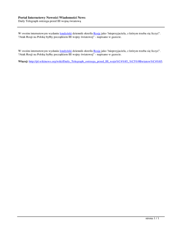 Portal Internetowy Nowości Wiadomości News Daily Telegraph ostrzega przed III wojną światową W swoim internetowym wydaniu londyński dziennik określa Rosję jako ?nieprzyjaciela, z którym trzeba się liczyć". ?Atak Rosji na Polskę byłby początkiem III wojny światowej" - napisano w gazecie. W swoim internetowym wydaniu londyński dziennik określa Rosję jako ?nieprzyjaciela, z którym trzeba się liczyć". ?Atak Rosji na Polskę byłby początkiem III wojny światowej" - napisano w gazecie. Więcej: http://pl.wikinews.org/wiki/Daily_Telegraph_ostrzega_przed_III_wojn%C4%85_%C5%9Bwiatow%C4%85. strona 1 / 1