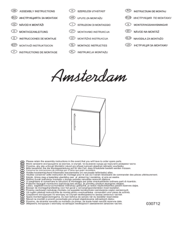 Amsterdam GB BUL CZ D E EST F H HR I LT LV NL PL RO RUS S SK SLO UA Please retain the assembly instructions in the event that you will have to order spare parts. Моля запазете инструкцията за монтаж, в случай, че възникне нужда да поръчате резервни части. Prosíme, aby jste uchovali Montážní návod pro případ nutnosti objednat náhradní součástky. Bitte bewahren Sie die Montageanleitung auf für den Fall, dass Ersatzteile bestellt werden müssen. Conserve las instrucciones de montaje por si tiene que pedir recambios. Hoidke koostamisjuhend hilisemaks kasutamiseks (nt varuosade tellimiseks) alles. Veuillez conserver cette instruction de montage pour le cas où il serait nécessaire de commander des pièces ultérieurement. Kérjük, őrizze meg a beépítési utasítáha cser al atrészt ke l rendelnie, st arra az esetre. Molimo čuvati instrukciju montaže u slučaju potrebe narudžbe rezevnih dijelova. Vi preghiamo di conservare le istruzioni di montaggio per poter eventualmente ordinare parti di ricambio. Prašome išsaugoti montavimo instrukciją tam atvejui, jei prireiktų užsakyti atsargines detales. Lūdzu, saglabāt lietošanas/montāžas instrukciju gadījumā, ja rastos nepieciešamība pasūtīt rezerves daļas. Bewaar de montagehandleiding voor het geval u vervangingsonderdelen moet bestellen. Prosimy zachować instrukcję montażu na wypadek konieczności zamówienia części zamiennych Vă rugăm păstraţi instrucţiunile de montaj pentru eventualitatea comandării unor piese de schimb. Сохраните инструкцию по монтажу на случай необходимости заказа запасных частей. Spara monteringsanvisningarna. Du kan behöva de senare när du beställer reservdelar. Návod na montáž si prosím ponechajte pre prípad objednávania náhradných dielov. Prosimo, da shranite navodila za montažo za primer, da boste hoteli naročiti rezervne dele. Збережіть інструкцію з монтажу на випадок необхідності замовлення запасних частин. 030712 Lp. Szt. 1. 8 2. 8 3. f8 x 32 f15 x 13 A D2 D1 B 8 4. 2 5. 2 6. 1 7. 8 8. 2 9. 5 10. 1+1 11. 6 12. 6 13. 3,5 x 16 4 14. 3,5 x 30 4 15. I order [pcs] Поръчка (бр.) Objednávám [ks.] Bestellte Stückzahl Hacer un pedido [unidades] Ma tellin [tk] Je commande [pces] Megrendelek [db] Naručujem [kom.] Ordino [pezzi] Užsisakau [vnt.] Pasūtu [gab.] Ik bestel [stuks] Zamawiam [szt.] Comand [buc.] Заказ на [шт.] Jag beställer [st.] Objednávam [ks.] Naročam [kosov] Замовлення на [шт.] B C E F Uwaga do mocowania szafki na ścianie stosować odpowiednie kołki dobrane do rodzaju podłoża 2 2 11 1 3 2 10 4 15 14 6 7 12 9 12 3 11 8 A 2 A 1 D2 3 180 o 14 10 D2 3 D2 13 5 10 11 3 4 180 o