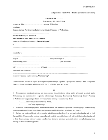 PT.2370.5.2014 Załącznik nr 4 do SIWZ - Istotne postanowienia umowy UMOWA NR ………. Znak sprawy: PL.2370.5.2014 zawarta w dniu ……………………………roku w Wołominie pomiędzy Komendantem Powiatowym Państwowej Straży Pożarnej w Wołominie, ................................................................................ 05-200 Wołomin, ul. Sasina 15 NIP: 125-09-41-052, REGON: 013298819 zwaną w dalszej części umowy „Zamawiającym”, a ............................................................................................................................................................. z siedzibą w ……...........................................……………………………................................................................... przy ul…………………………………………….. zarejestrowanym w ………………………………….. prowadzonej przez …………………………………...........…….. pod numerem ……………………………………. NIP: ……………………………….. REGON: ……………………………………….. reprezentowanym przez: ……………………………........…………………………………............................................................. zwanym w dalszej części umowy „Wykonawcą”. Umowa została zawarta w trybie przetargu nieograniczonego, zgodnie z przepisami ustawy z dnia 29 stycznia 2004 r. – Prawo zamówień publicznych (tj. Dz. U. z 2013 r., poz. 907 ze zm.). §1 1. Przedmiotem niniejszej umowy jest sukcesywny bezgotówkowy zakup paliw płynnych na stacji paliw Wykonawcy do samochodów i sprzętu silnikowego Komendy Powiatowej Państwowej Straży Pożarnej w Wołominie w ciągu całego okresu obowiązywania umowy o szacunkowej ilości: - ……… dm3 benzyny bezołowiowej Pb-95, - …………. dm3 oleju napędowego. 2. Wielkość zamawianego paliwa uzależniona będzie od aktualnych potrzeb Zamawiającego. Zamawiający zastrzega sobie możliwość nie wykorzystania szacowanej ilości paliwa określonej w § 1 ust.1. 3. Paliwo nie może odbiegać od wymogów jakościowych określonych w normach obowiązujących w Unii Europejskiej. W przypadku zmiany przywołanych poniżej norm jakościowych paliw ciekłych obowiązujących w Unii Europejskiej, paliwa będące przedmiotem dostawy powinny posiadać jakość uwzględniającą takie zmiany od dnia ich obowiązywania. 1 PT.2370.5.2014 4. Dostarczane przez Wykonawcę paliwo musi spełniać wymagania określone w rozporządzeniu Ministra Gospodarki z dnia 9.12.2008 r. w sprawie wymagań jakościowych dla paliw ciekłych (t.j. Dz. U. z 2013 r., poz. 1058) oraz być zgodne z normami: PN-EN 228:2013-04E – dotyczy benzyny bezołowiowej, PN-EN 590:2013-12E – dotyczy oleju napędowego. 5. Tankowanie pojazdów i sprzętu będzie odbywało się na stacji paliw Wykonawcy mieszczącej się w ………………………………………………………………………………………………………, na której są warunki techniczne do tankowania wszystkich samochodów Zamawiającego. 6. Wykonawca umożliwi tankowanie paliw, na wskazanej w ust. 5 stacji, przez 24 godziny na dobę we wszystkie dni w ciągu roku. 7. Podstawą zakupu paliw jest dokument ………………………………………………. potwierdzający pobranie bezgotówkowe paliwa wystawiany przy każdej transakcji, zawierający datę tankowania, nr rejestracyjny tankowanego pojazdu lub zapis kanister w przypadku tankowania paliwa dla sprzętu, ilość i rodzaj pobranego paliwa, cenę za 1 litr paliwa obowiązującą w dniu transakcji oraz nazwisko osoby pobierającej paliwo. 8. Numery rejestracyjne pojazdów będą wpisane do umowy (załącznik nr 1). 9. W przypadku zmiany numeru rejestracyjnego samochodu, kupna lub likwidacji samochodu lub sprzętu, Zamawiający zobowiązuje się niezwłocznie zgłosić zaistniałą zmianę. §2 Niniejsza umowa zostaje zawarta na czas oznaczony od dnia jej podpisania do 31.12.2014 r. lub do wyczerpania kwoty o której mowa w § 3 ust.1 (w zależności co nastąpi wcześniej). §3 1. Przewidywana wartość całkowita przedmiotu umowy wynosi: …………….......................PLN brutto (słownie: …………………………………………..………………………….......................................….…….) 2. Wynagrodzenie wymienione w ust. 1 obejmuje wszelkie koszty jakie poniesie Wykonawca z tytułu należytej i zgodnej z niniejszą umową oraz obowiązującymi przepisami realizacją umowy. 3. W okresie obowiązywania umowy ceny jednostkowe benzyny i oleju napędowego będą ustalane na podstawie cennika obowiązującego w chwili tankowania na stacji paliw Wykonawcy. 4. Od cen określonych w ust. 3 stosowany będzie stały upust w wysokości BRUTTO ………….zł/dm3 paliwa. 5. Upust, o którym mowa w ust. 4 naliczany będzie na każdej fakturze wystawionej za okres rozliczeniowy dla Zamawiającego. 6. Zmiana cen, o których mowa w ust. 3, nie wymaga zmiany umowy. 7. Podana w § 3 ust. 1 kwota, która może być przeznaczona na zakup paliwa jest kwotą maksymalną, wyczerpanie jej przed upływem okresu, o którym mowa w § 2 ust. 1 powoduje wygaśniecie umowy. 8. Niewyczerpanie kwoty określonej w § 3 ust. 1 w okresie, o którym mowa w § 2 ust. 1, nie powoduje przedłużenia umowy. 2 PT.2370.5.2014 §4 1. Formą rozliczenia za zakupione paliwo będą faktury wystawiane raz w miesiącu wraz z wydrukiem zestawienia transakcji dokonanych w danym okresie rozliczeniowym. Faktury będą wystawiane w oparciu o ceny i wysokość upustu określone w § 3 ust. 3 i 4. 2. Do faktury będzie dołączony wydruk tankowań paliw płynnych zawierający w szczególności co najmniej: daty tankowań, nr rejestracyjne tankowanych pojazdów, ilość i rodzaj pobranego paliwa, cenę za 1 litr paliwa obowiązującą w dniu transakcji. 3. Ustala się miesięczny okres ro